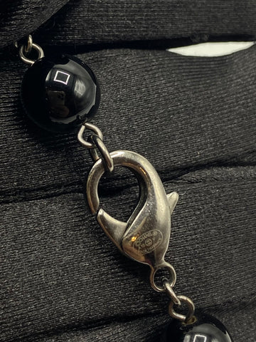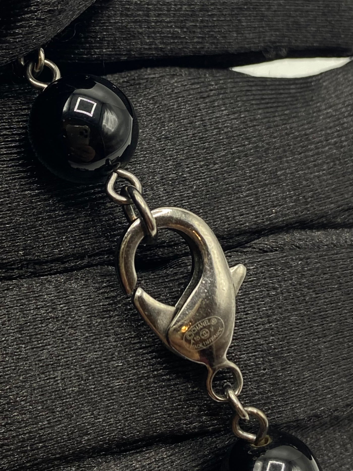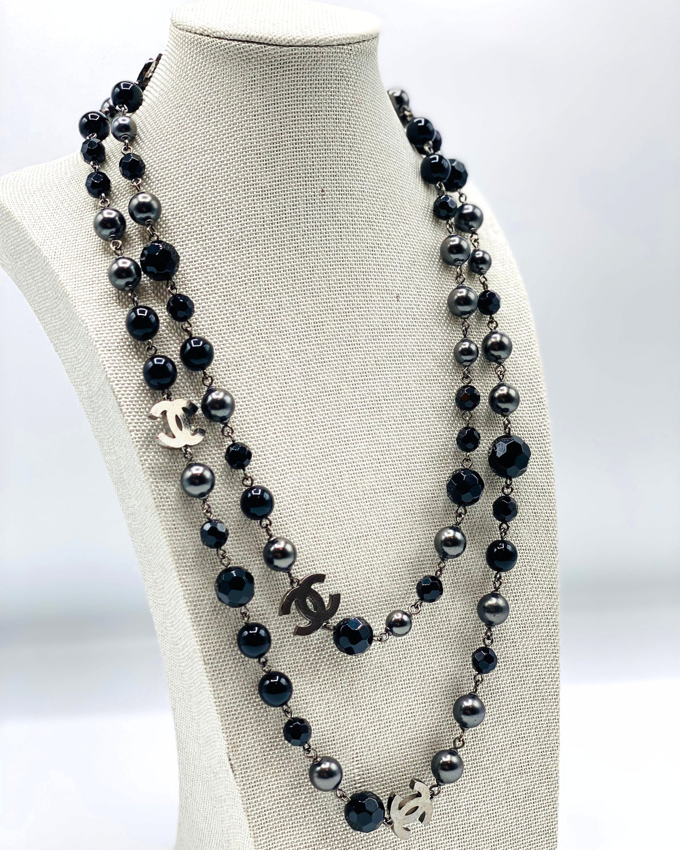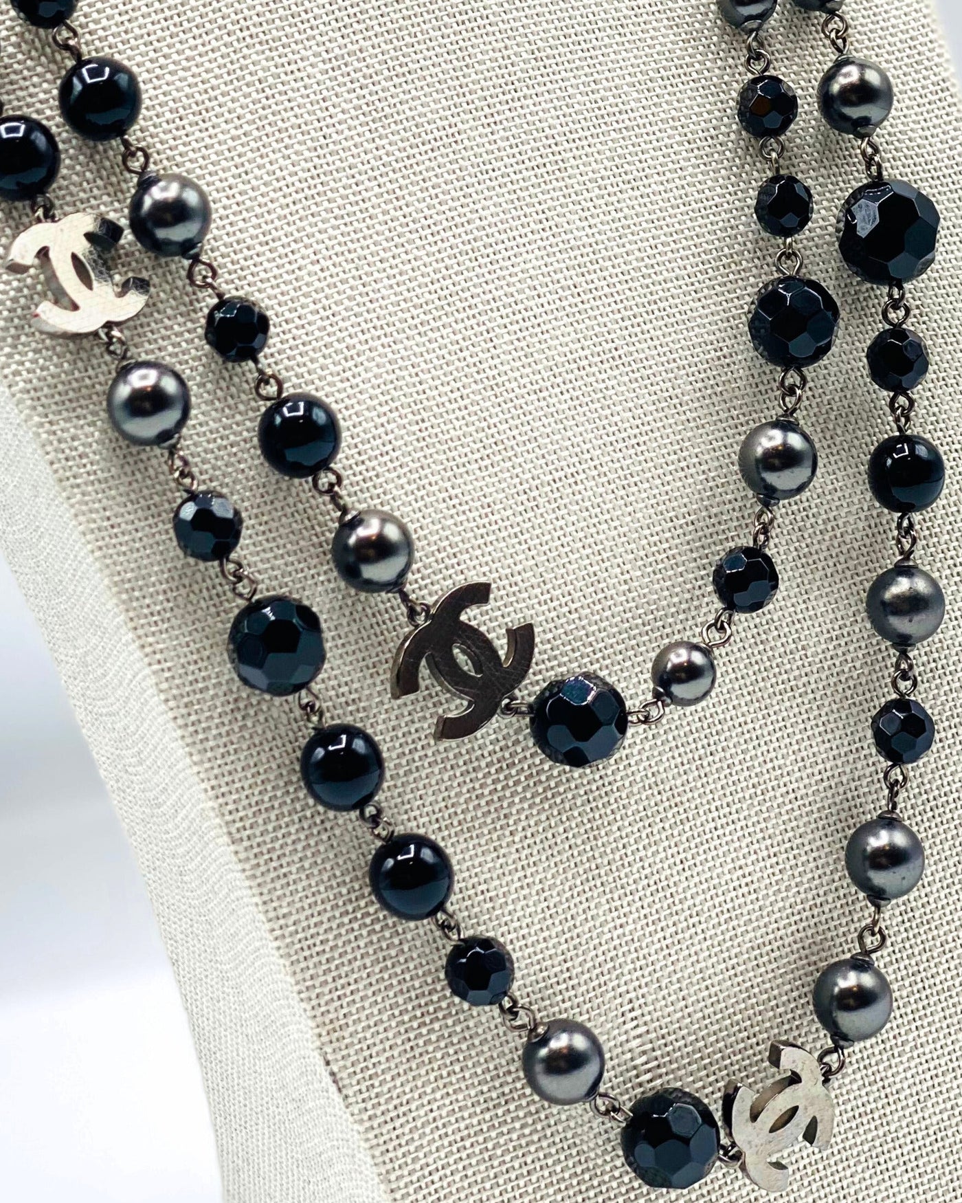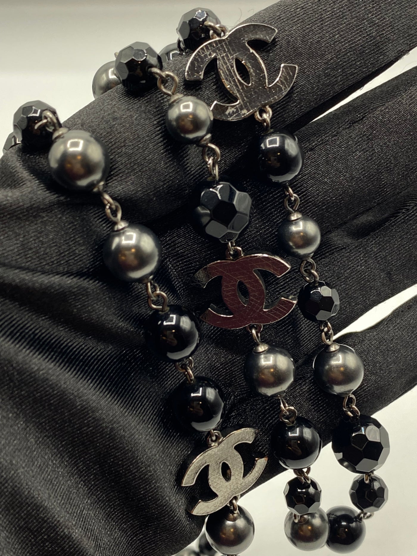 Chanel long necklace with CC logo, characterized by a mix of black and gray pearls and black beads. This versatile necklace can be worn as a single long thread or wrapped to create a double layer look. It is made of faux pearls (black and gray), faceted beads and silver metal in ruthenium.The design includes the CC logo of the brand positioned at intervals along the chain. The beads size is around 8 mm and 14 mm in diameter.