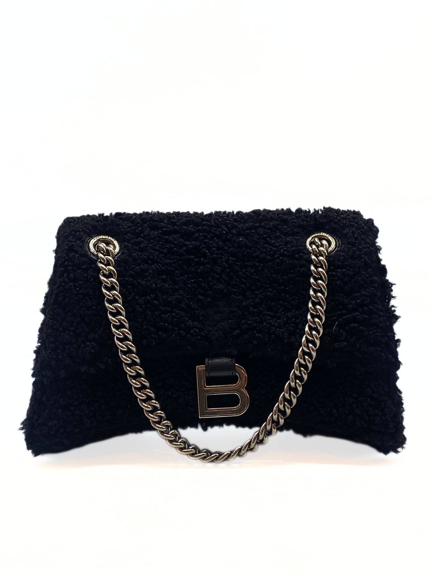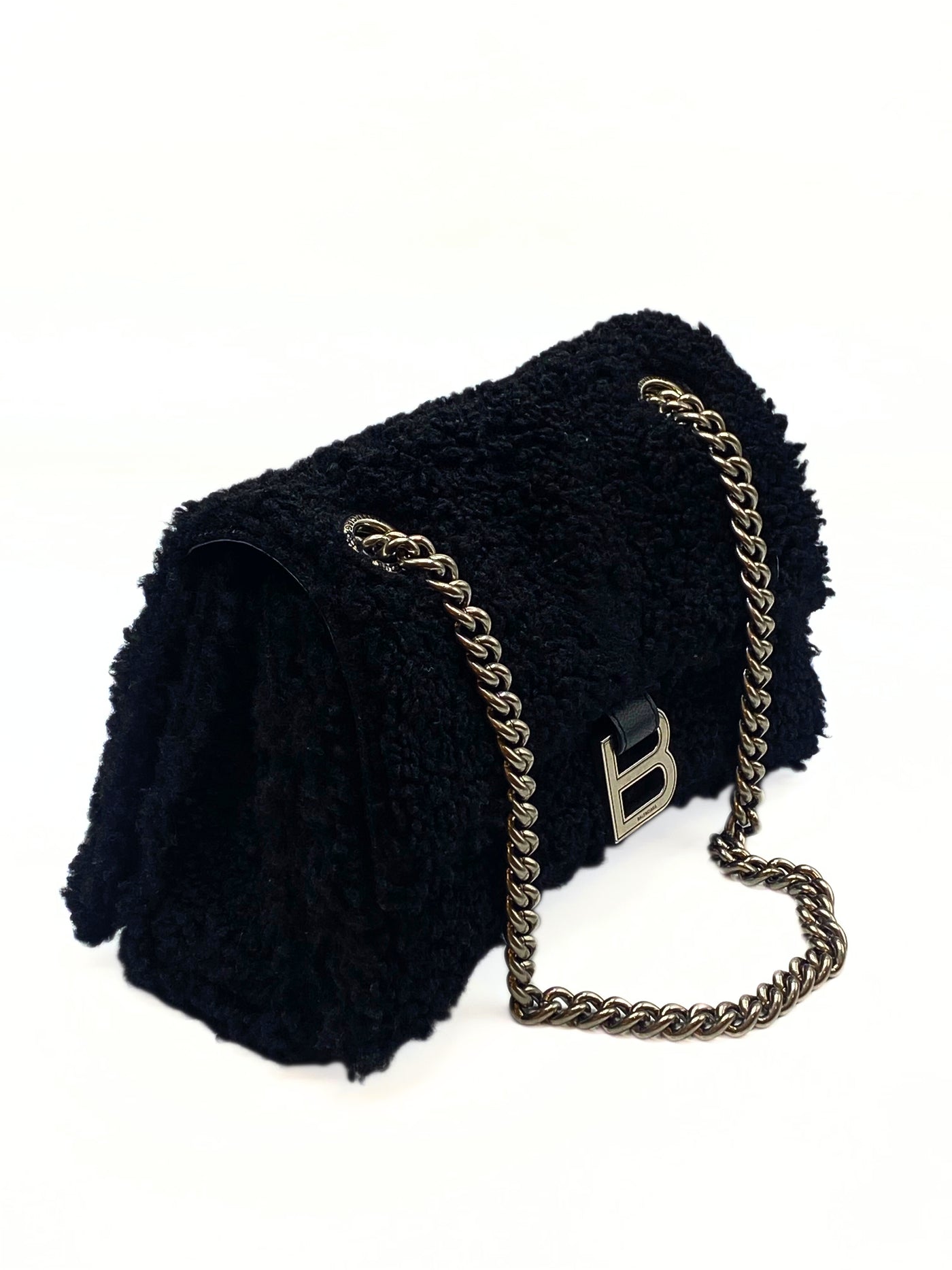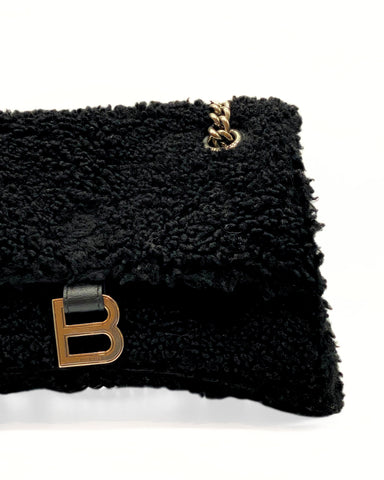 This Balenciaga Crush Small Chain Bag in Shearling style syntetic material has been proposed by the maison in Fall/Winter 2022 collection. It is made of 100% polyester and black leather lining inside. This bag is known for its Curvilinear base (arc shape), movable chain shoulder strap for shoulder and crossbody options. It has magnetic studded closure, maison "B" logo aged silver color hardware in front. The Interior part with five compartment with zipper and flat pocket.