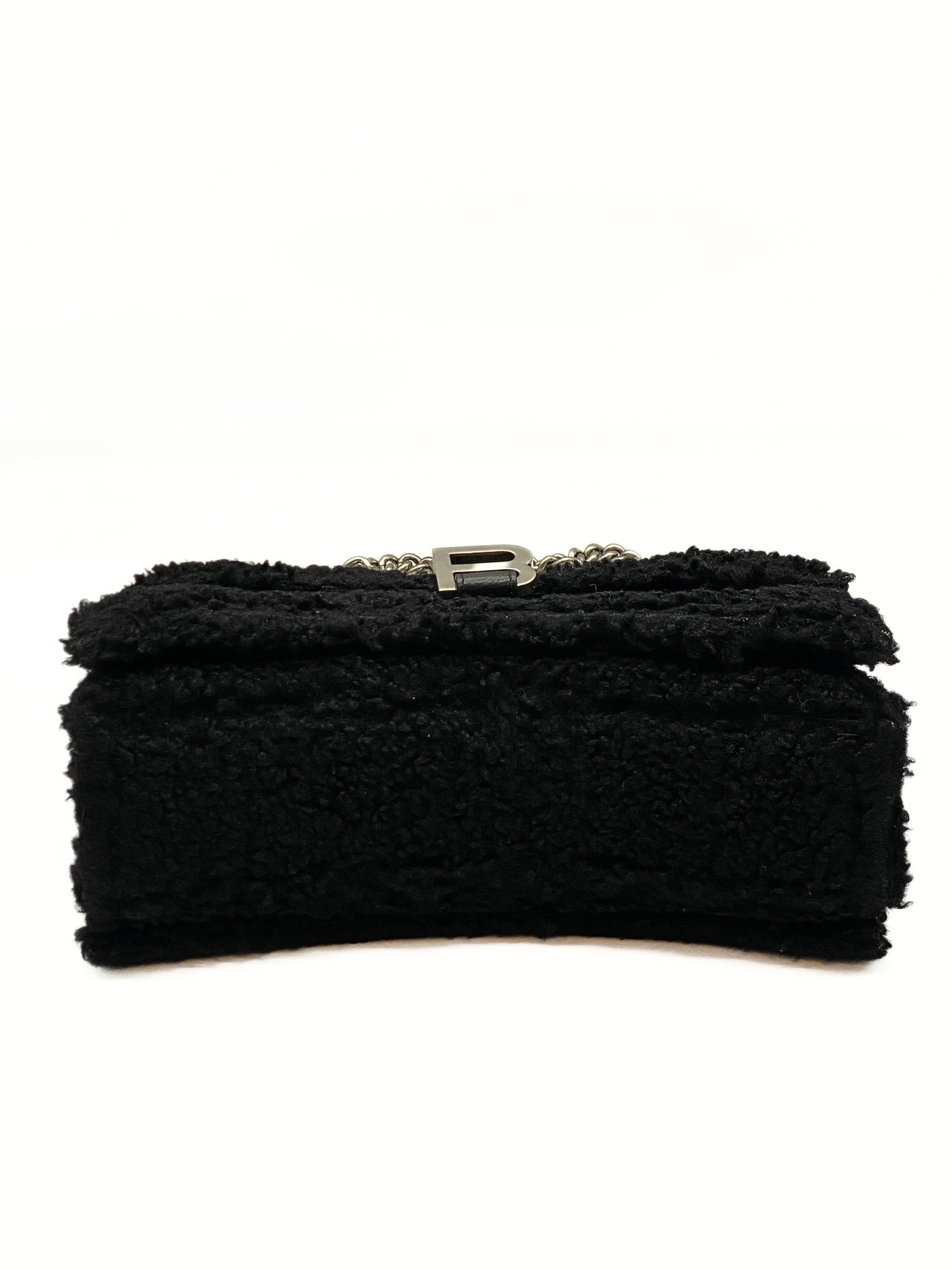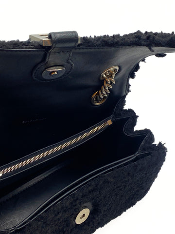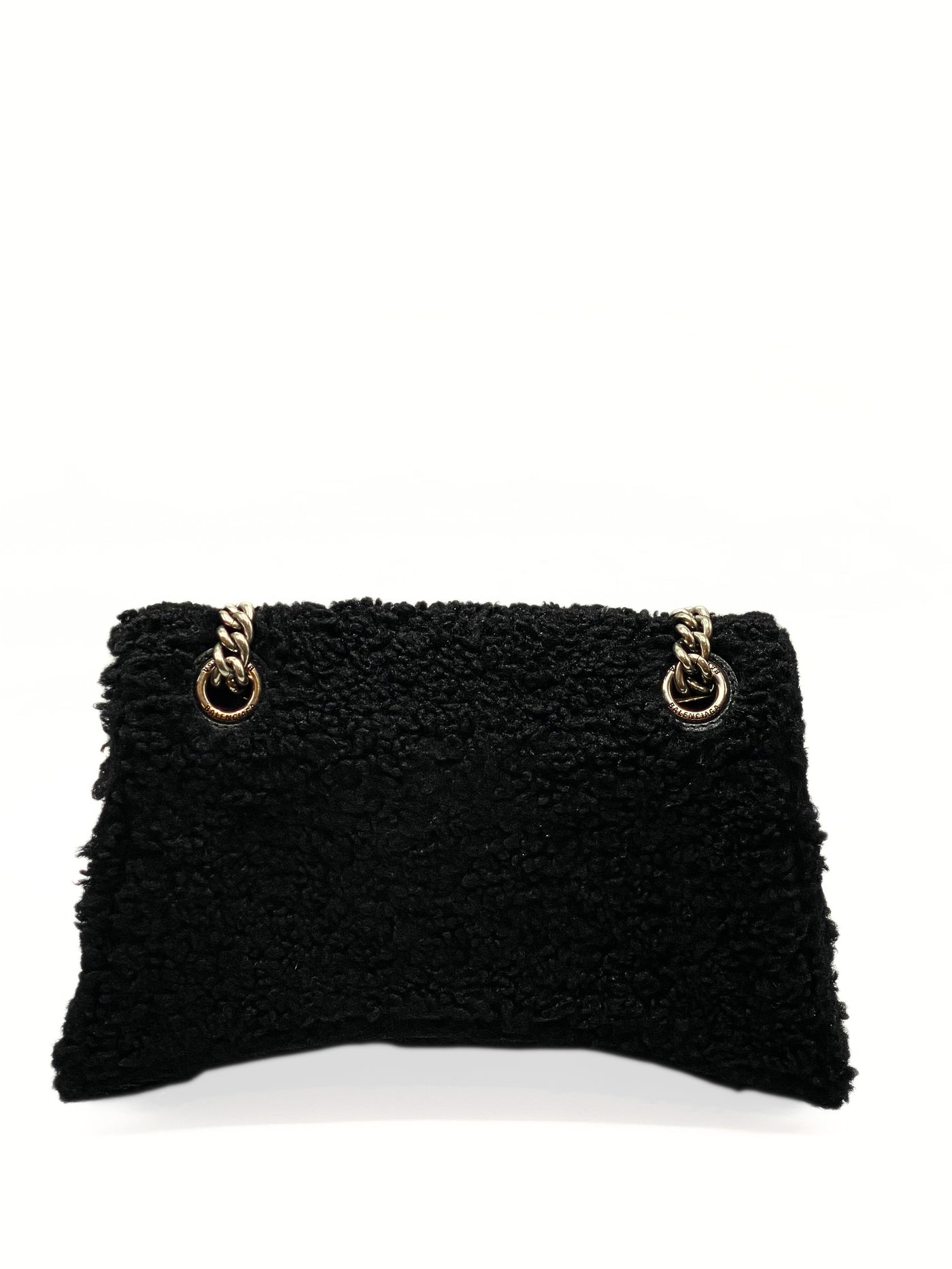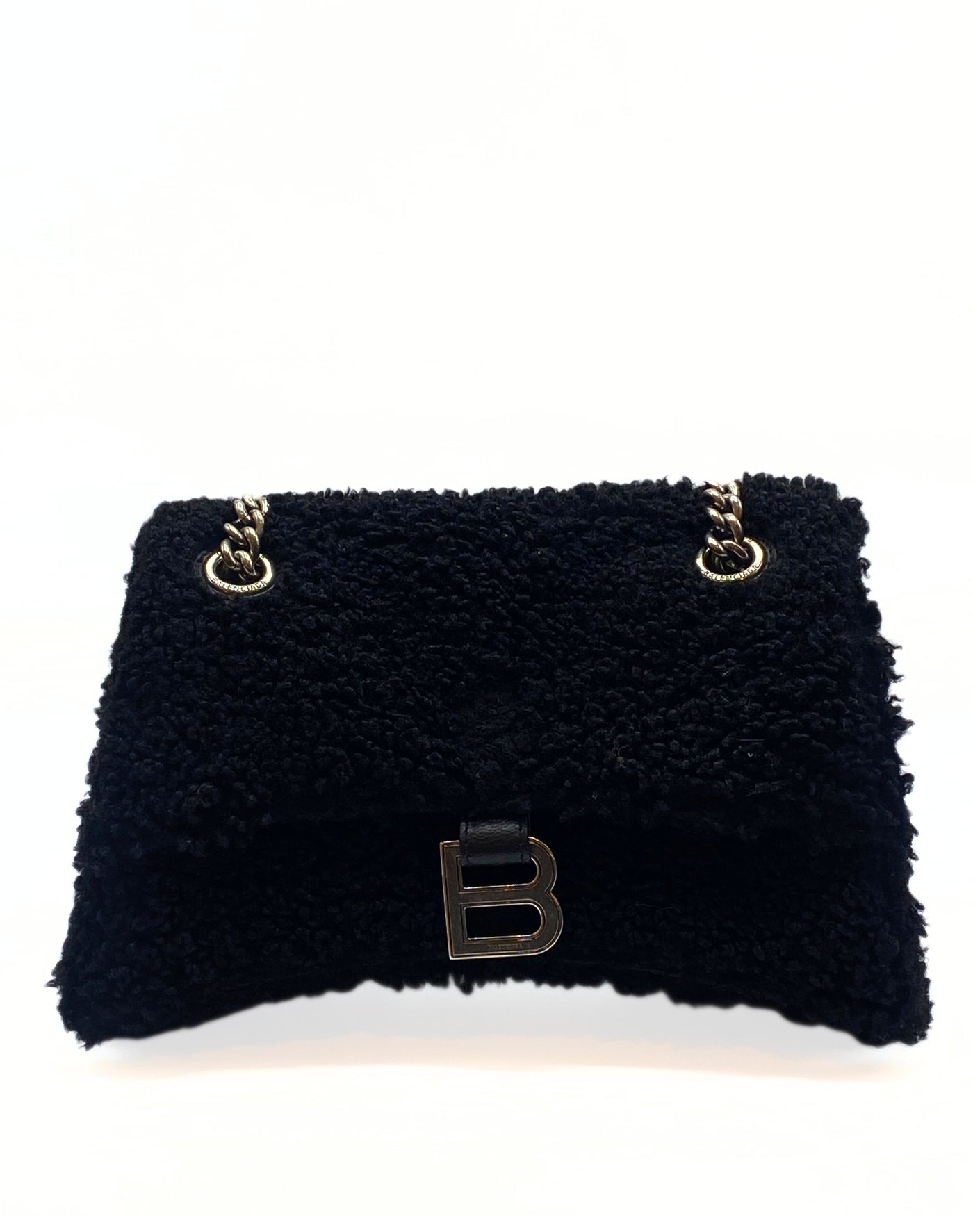 This Balenciaga Crush Small Chain Bag in Shearling style syntetic material has been proposed by the maison in Fall/Winter 2022 collection. It is made of 100% polyester and black leather lining inside. This bag is known for its Curvilinear base (arc shape), movable chain shoulder strap for shoulder and crossbody options. It has magnetic studded closure, maison "B" logo aged silver color hardware in front. The Interior part with five compartment with zipper and flat pocket.