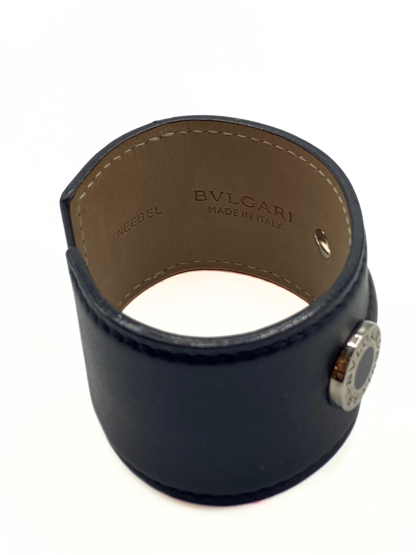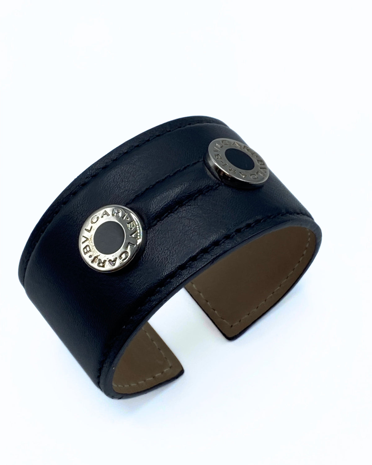 This Bulgari Manchette is a statement bracelet. It's made in black leather, with on top the classic buttons of the brand, in silver.