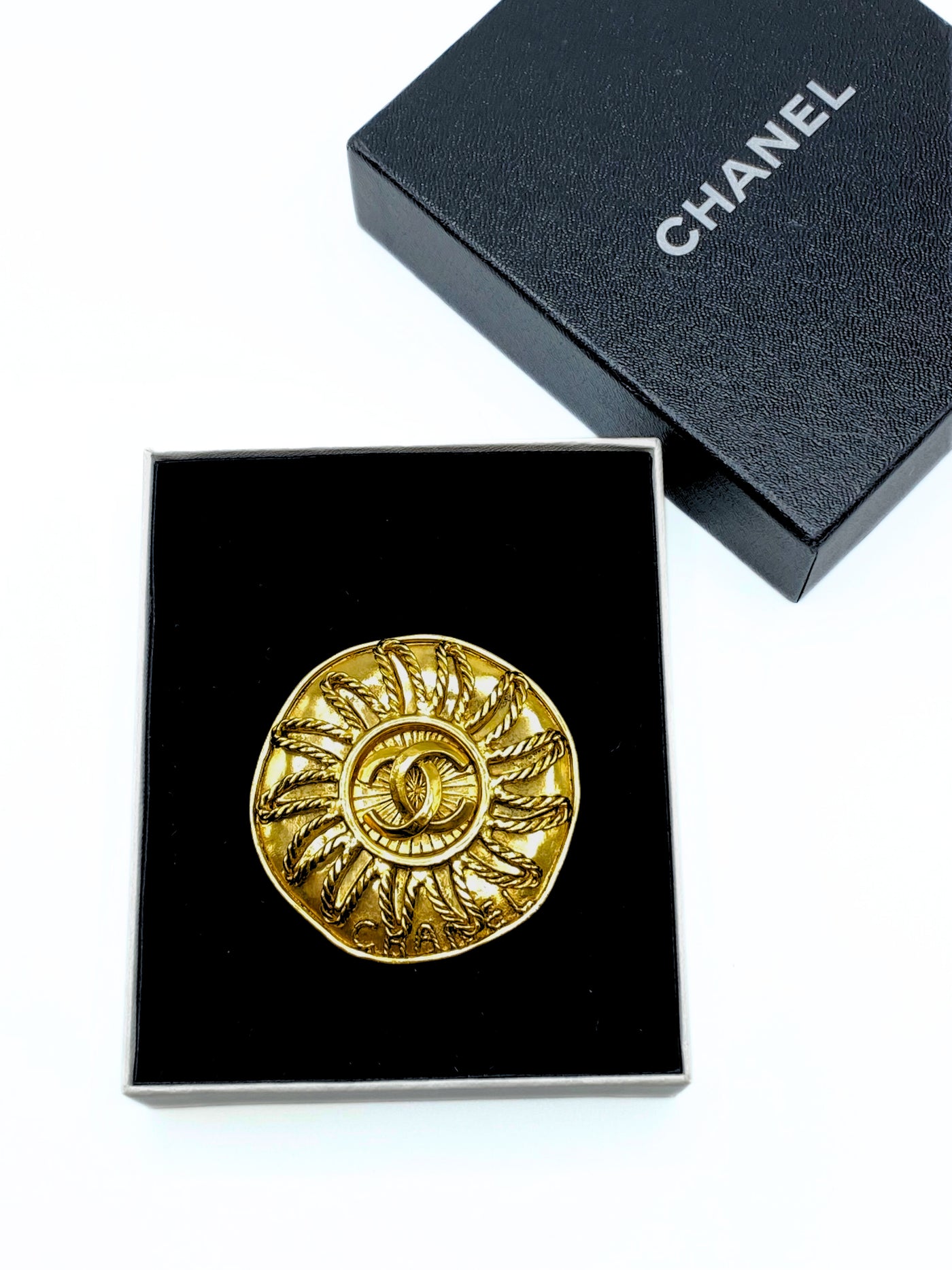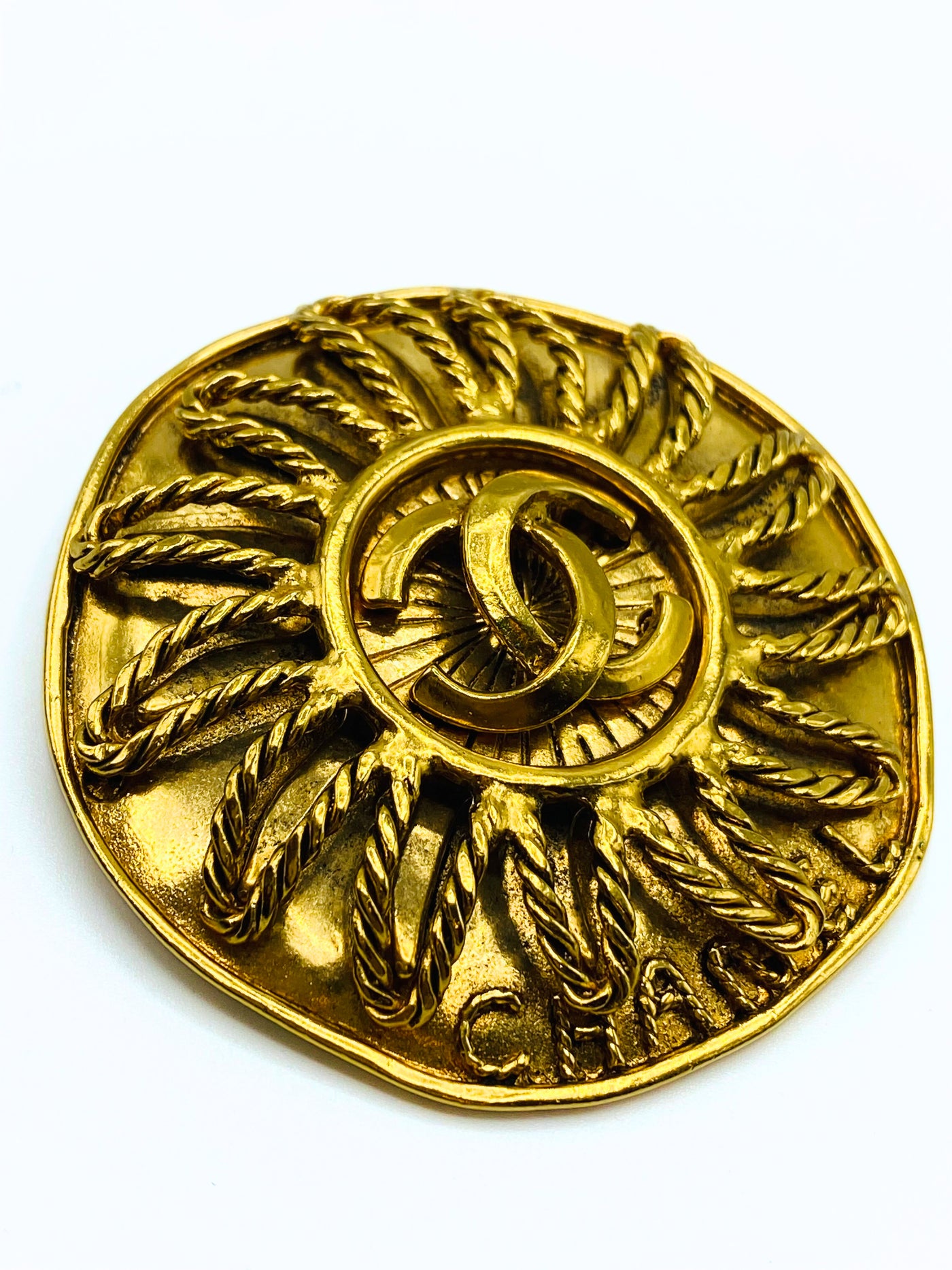 This Vintage Brooch of Chanel is an amazing accessorie to elevate the look. It reclaime a sun, with the iconic CC of the brand in the center.
