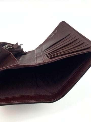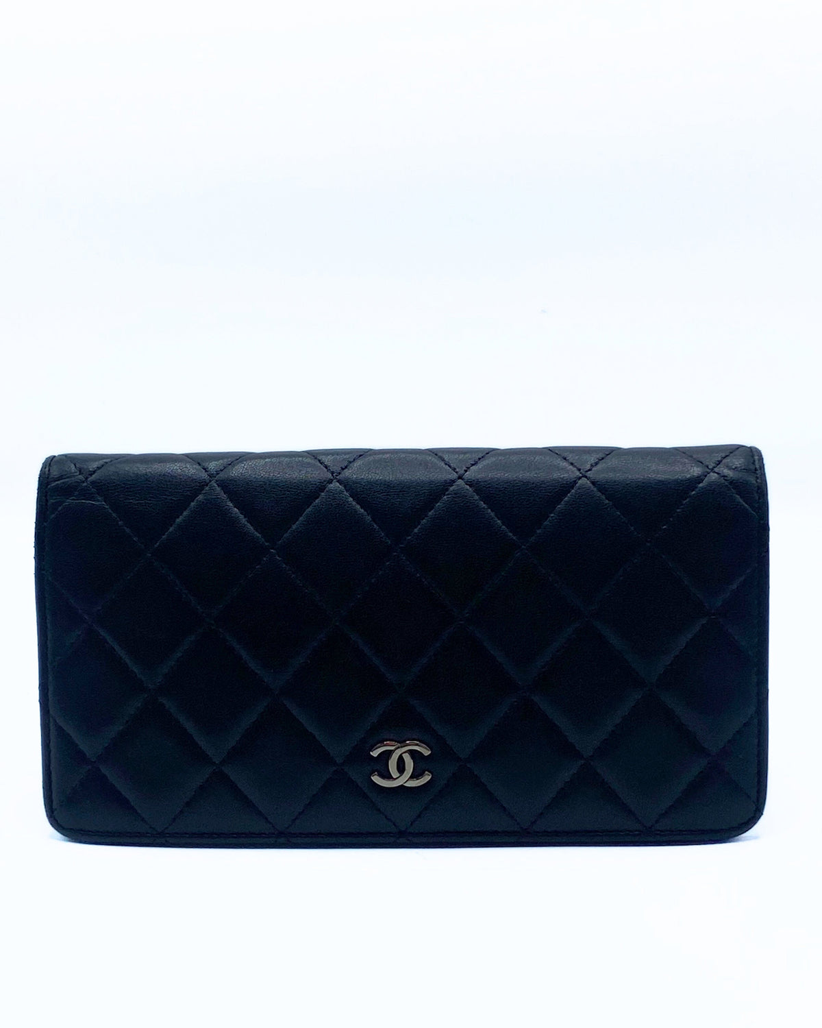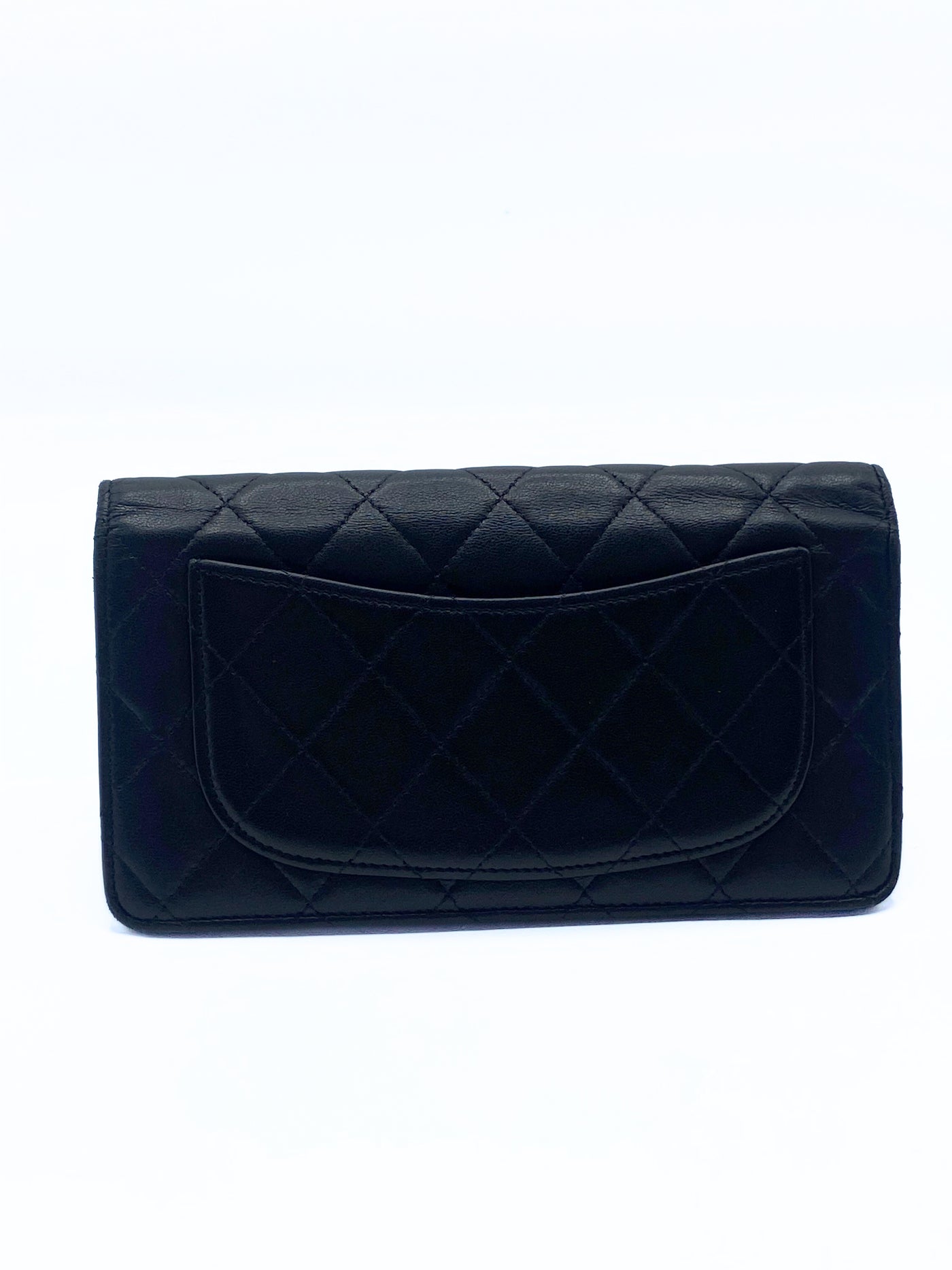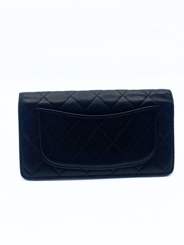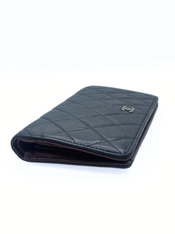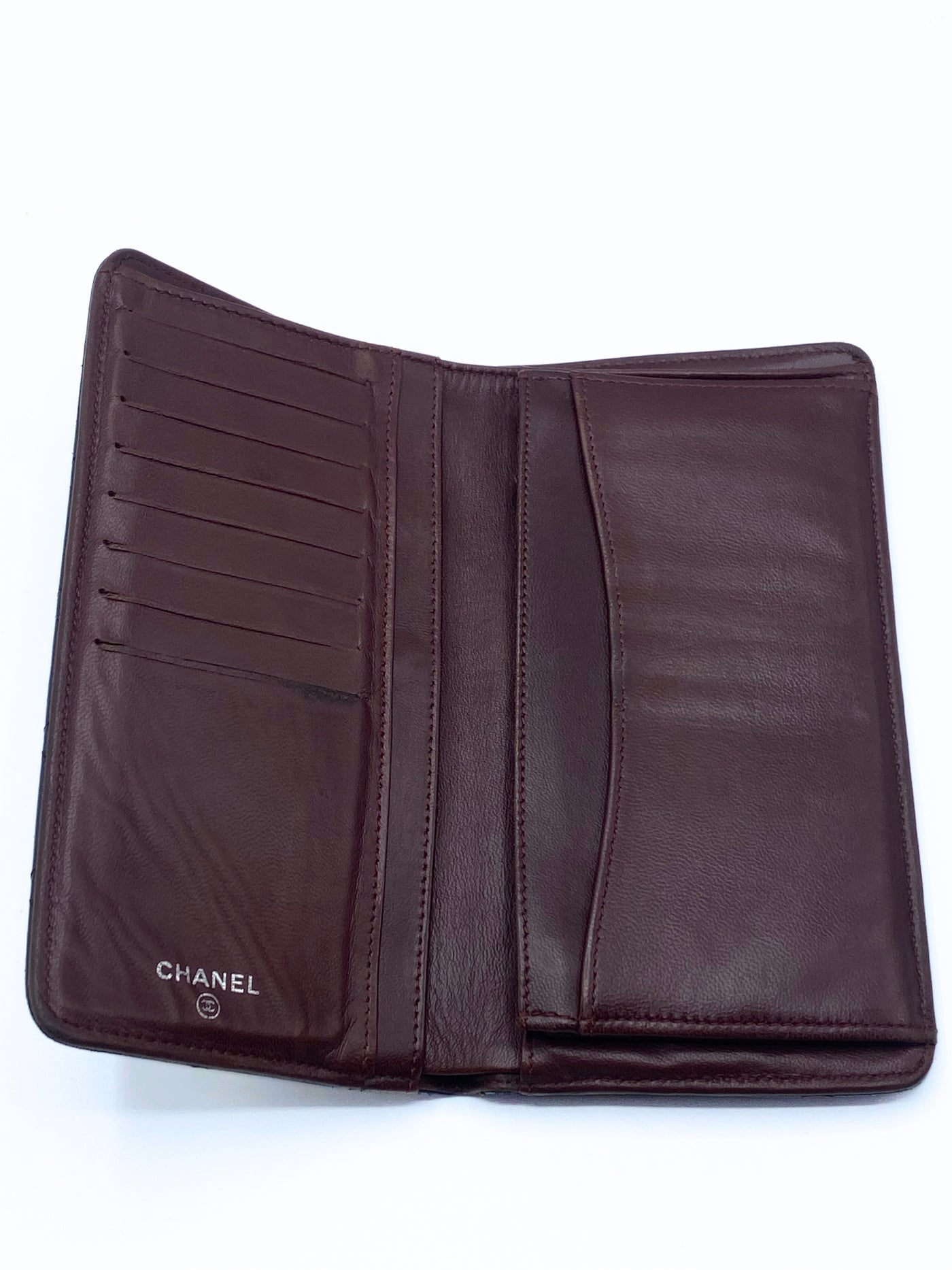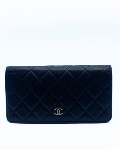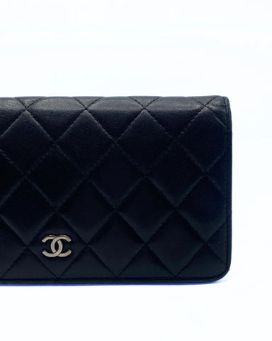 This Chanel long flap bi-fold wallet in a classic quilted design in black lambskin leather on the outside and with an inner burgundy leather lining inside. It features numerous card compartments and zip pocket for coins.