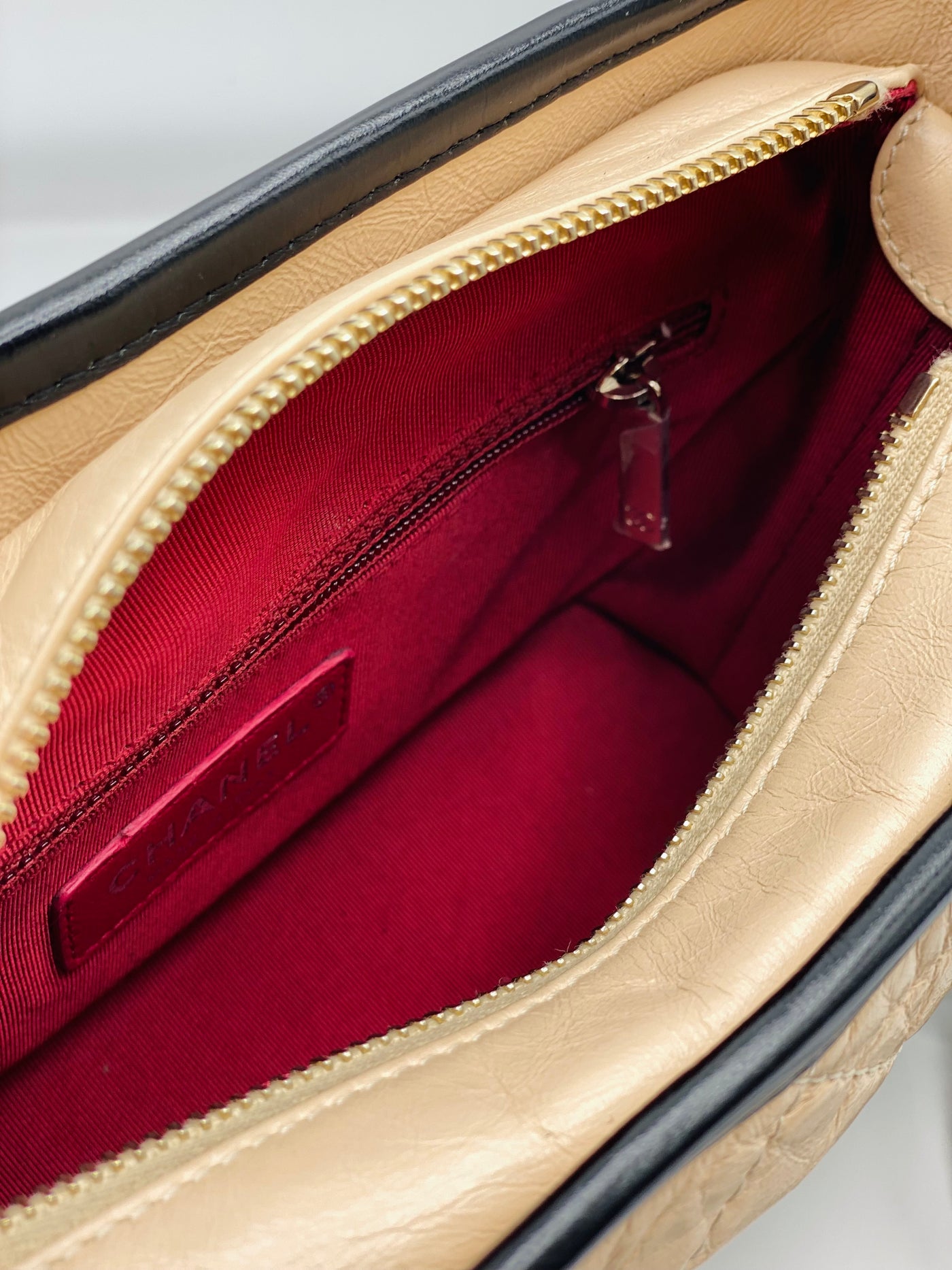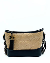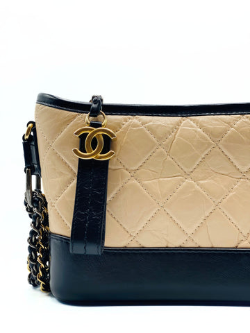 This Chanel Gabrielle bag is crafted of diamond-stitched aged calfskin leather in beige, with smooth black calfskin leather trim. The shoulder bag features a gradient gold to ruthenium chain crossbody strap threaded with leather, and a top zipper with an aged gold CC logo.