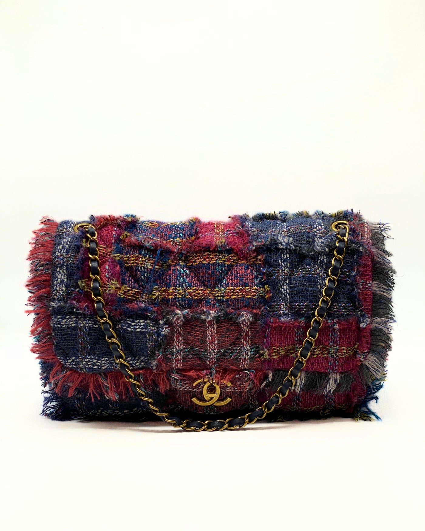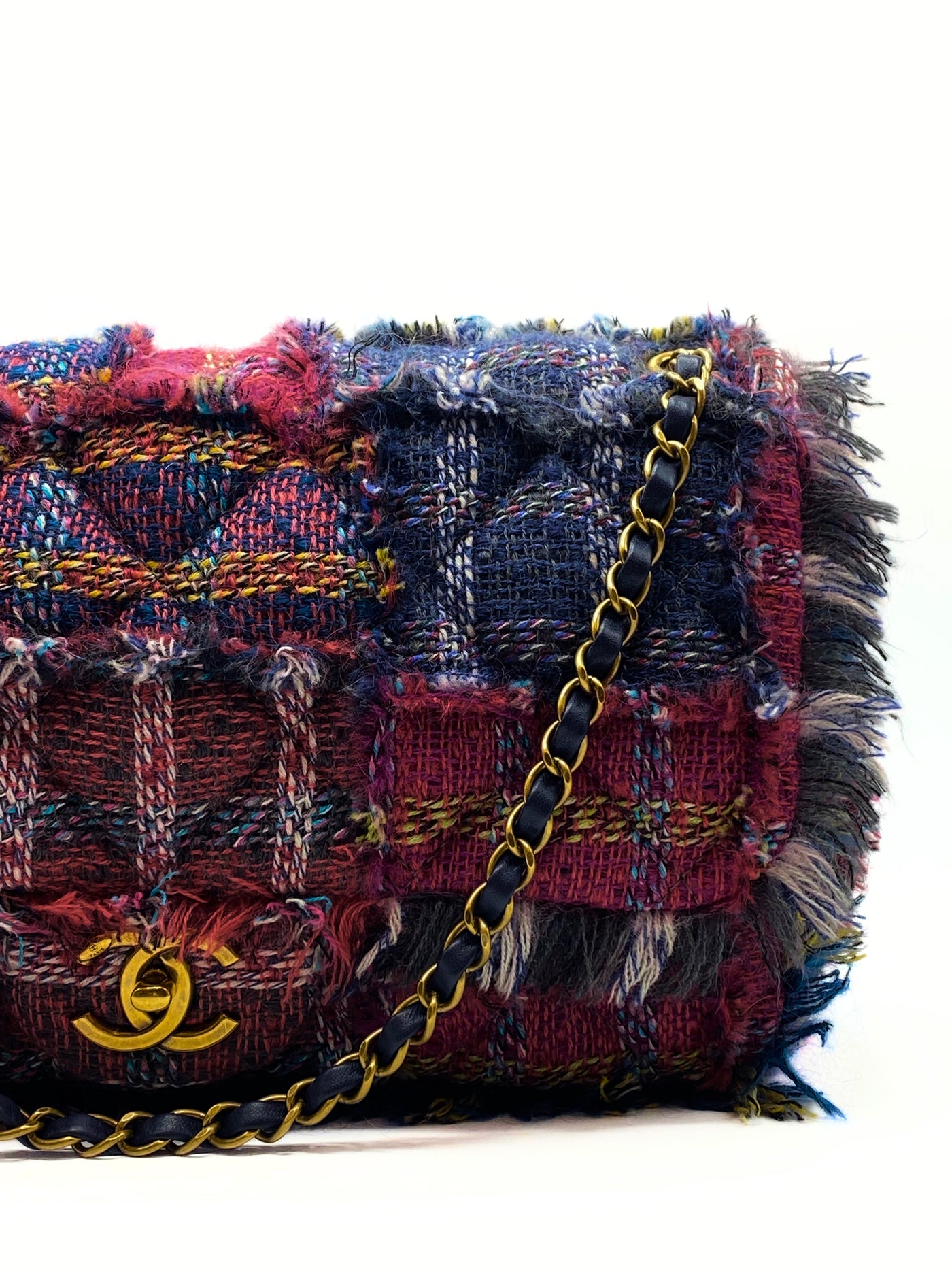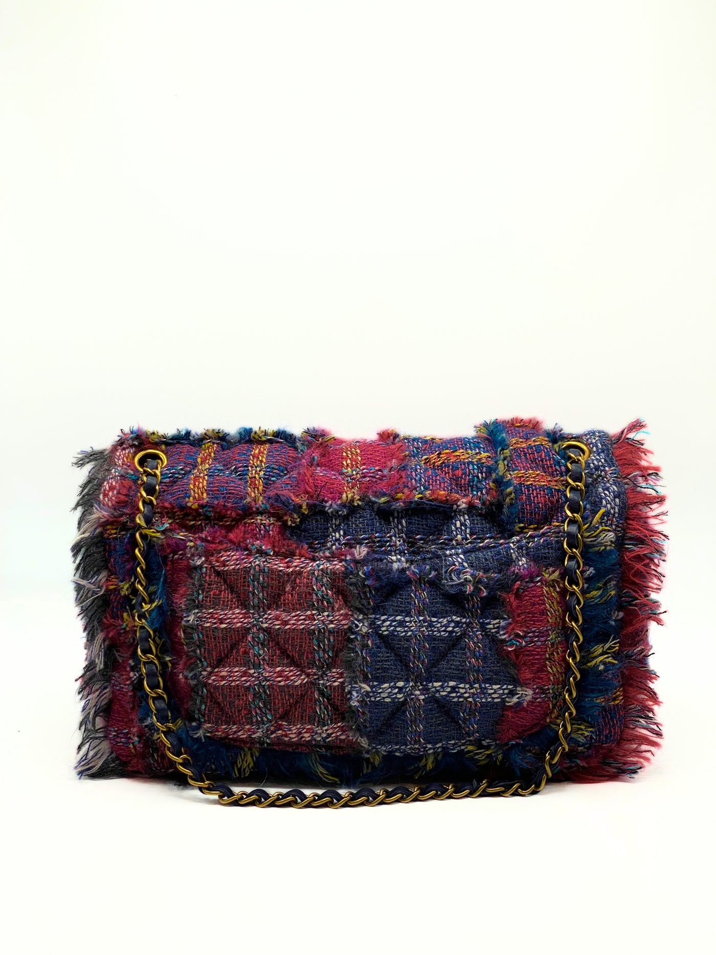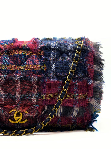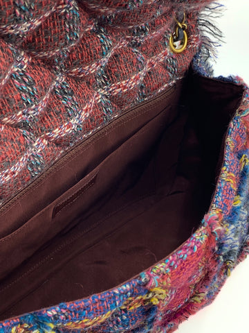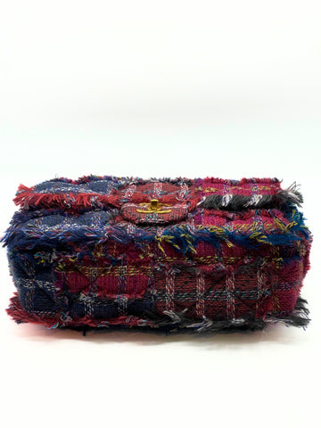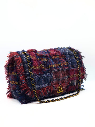 This Chanel Tweed Jumbo is created of red and blue tweed distressed. The bag features a frayed edges, an aged gold chain link shoulder strap threaded with leather, a frontal flap and an aged gold Chanel CC turn lock.