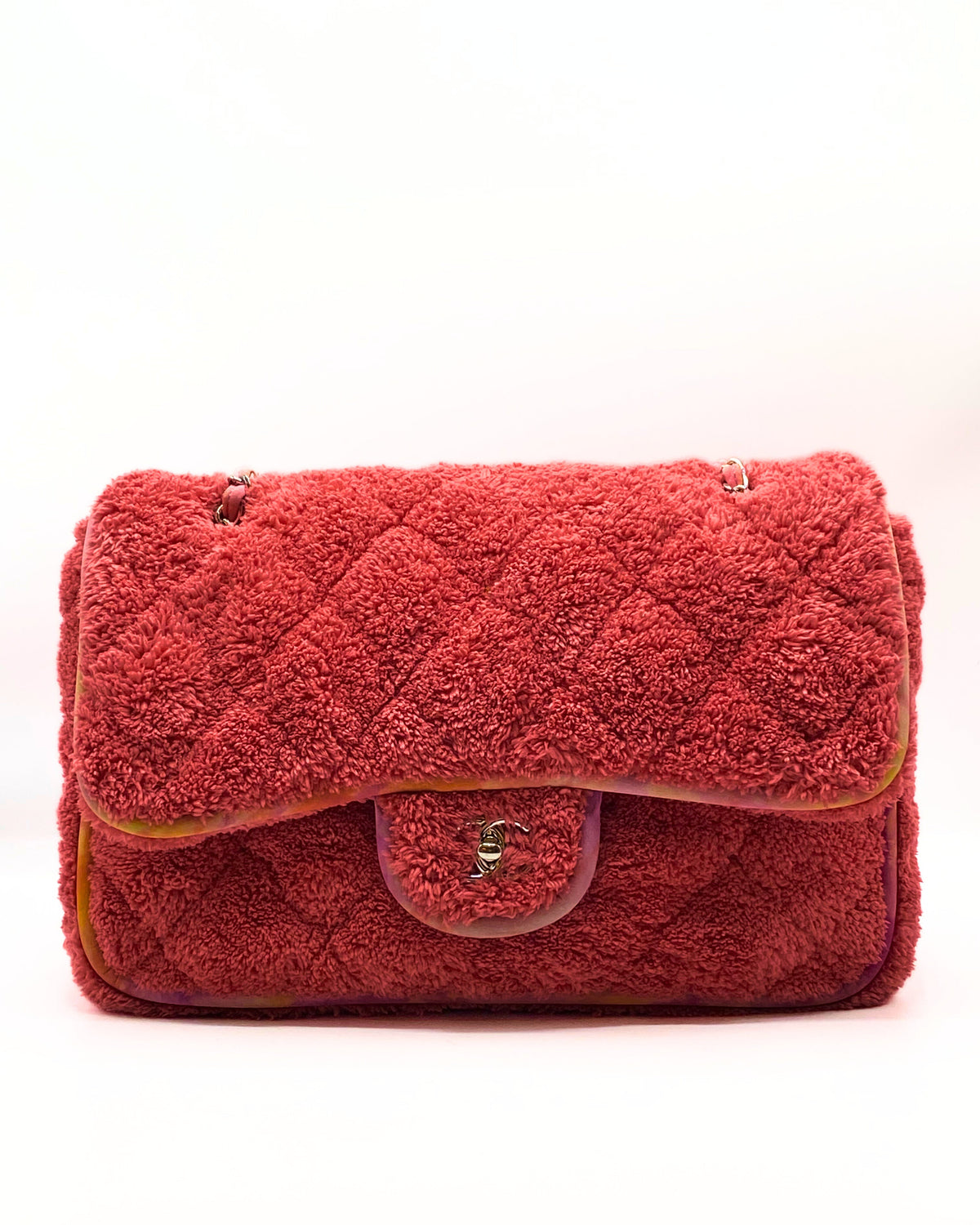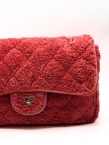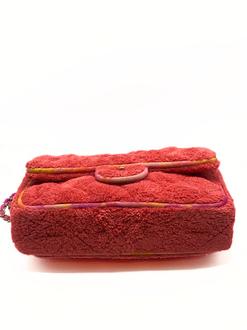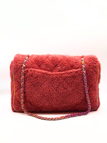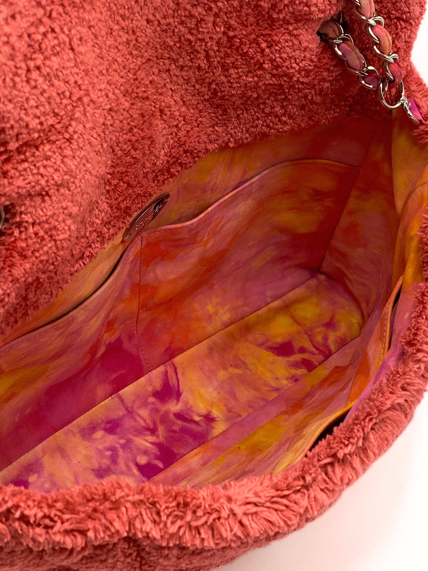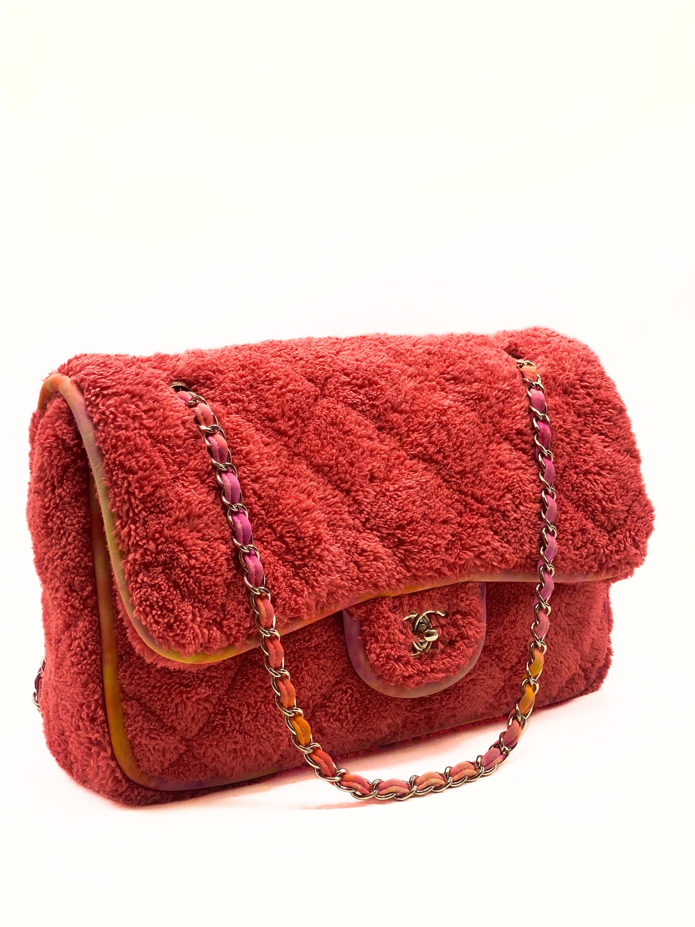 This Chanel Jumbo Terry is crafted of colorful tightly woven cloth with diamond stitching. The bag features a light gold chain link shoulder strap threaded with pink fabric and a front flap with a matching aged gold classic CC turn lock.
