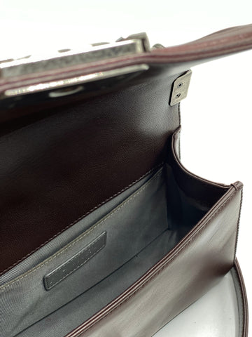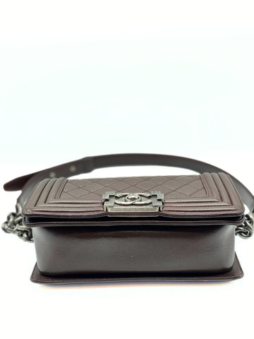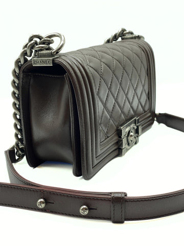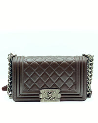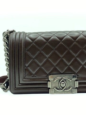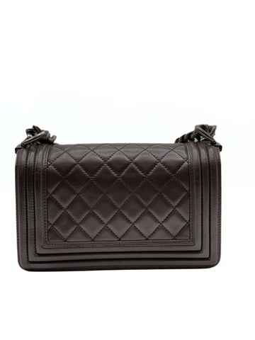 This Chanel Le Boy Small Flap is crafted of lambskin leather in Brown Chocolate. The bag features a ruthenium chain shoulder strap with a leather shoulder pad, a diamond quilted crossover flap with a linear quilted border, and a ruthenium boy CC push lock.