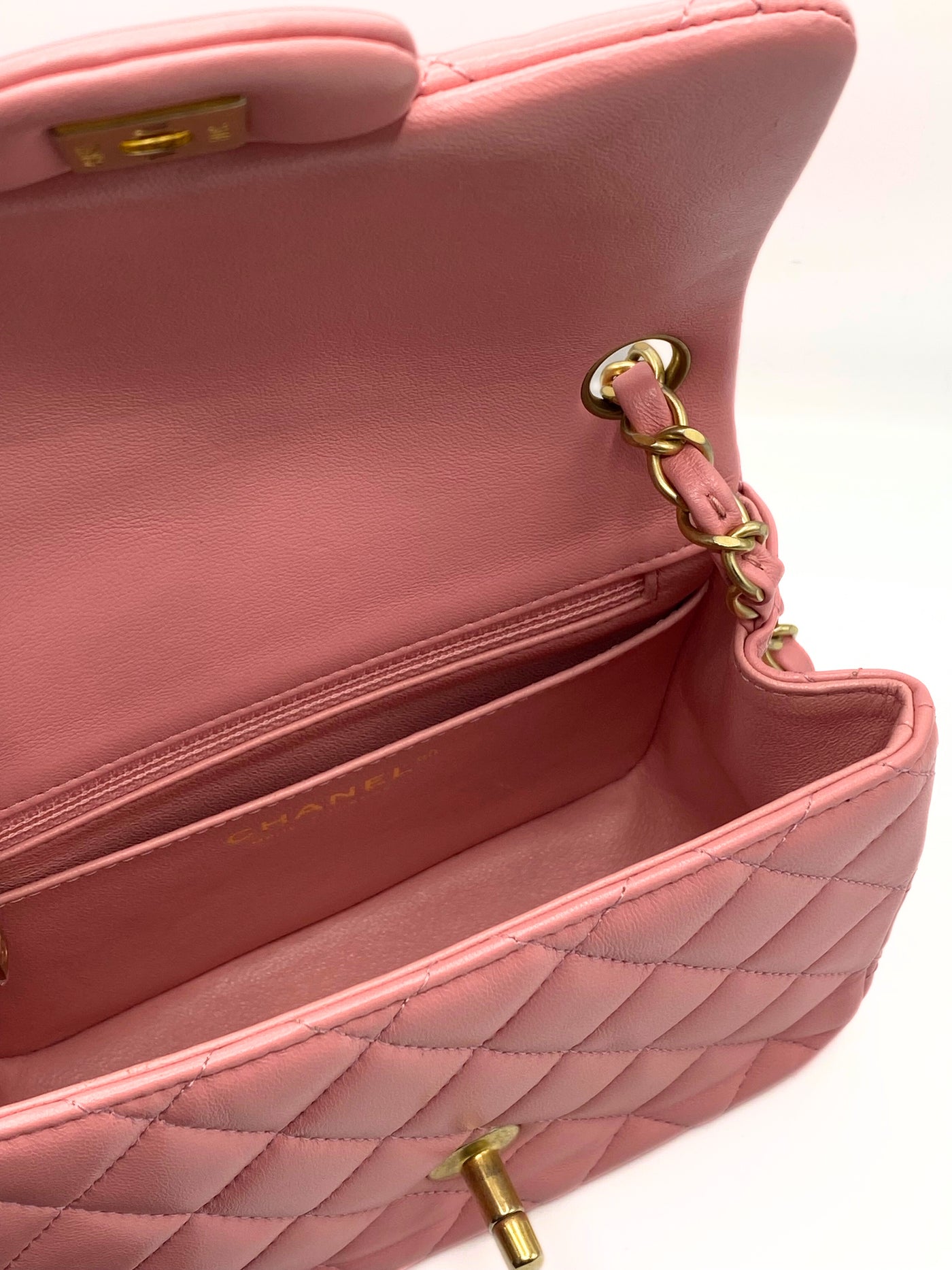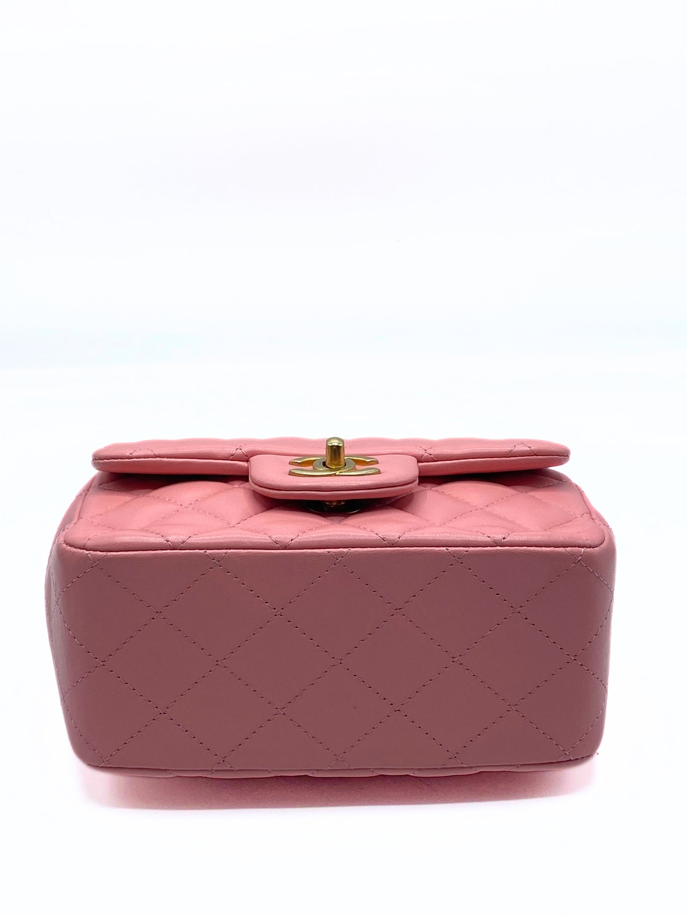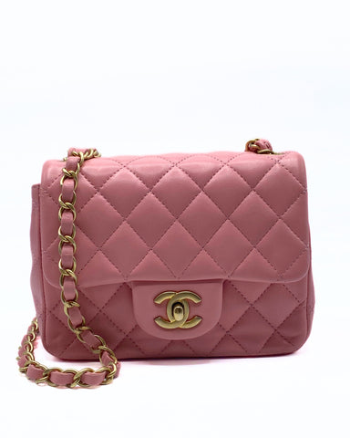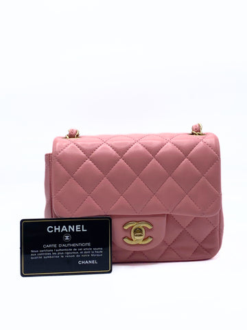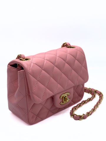 This elegant Chanel Classic Mini Flap (Classic Mini Bag with Flap) in blush pink lambskin with gold hardware is a Rare finds that is a seasonal release of the Maison. This model is known for its diamond quilted design, braided leather shoulder strap with chain and iconic swivel closure with CC logo.