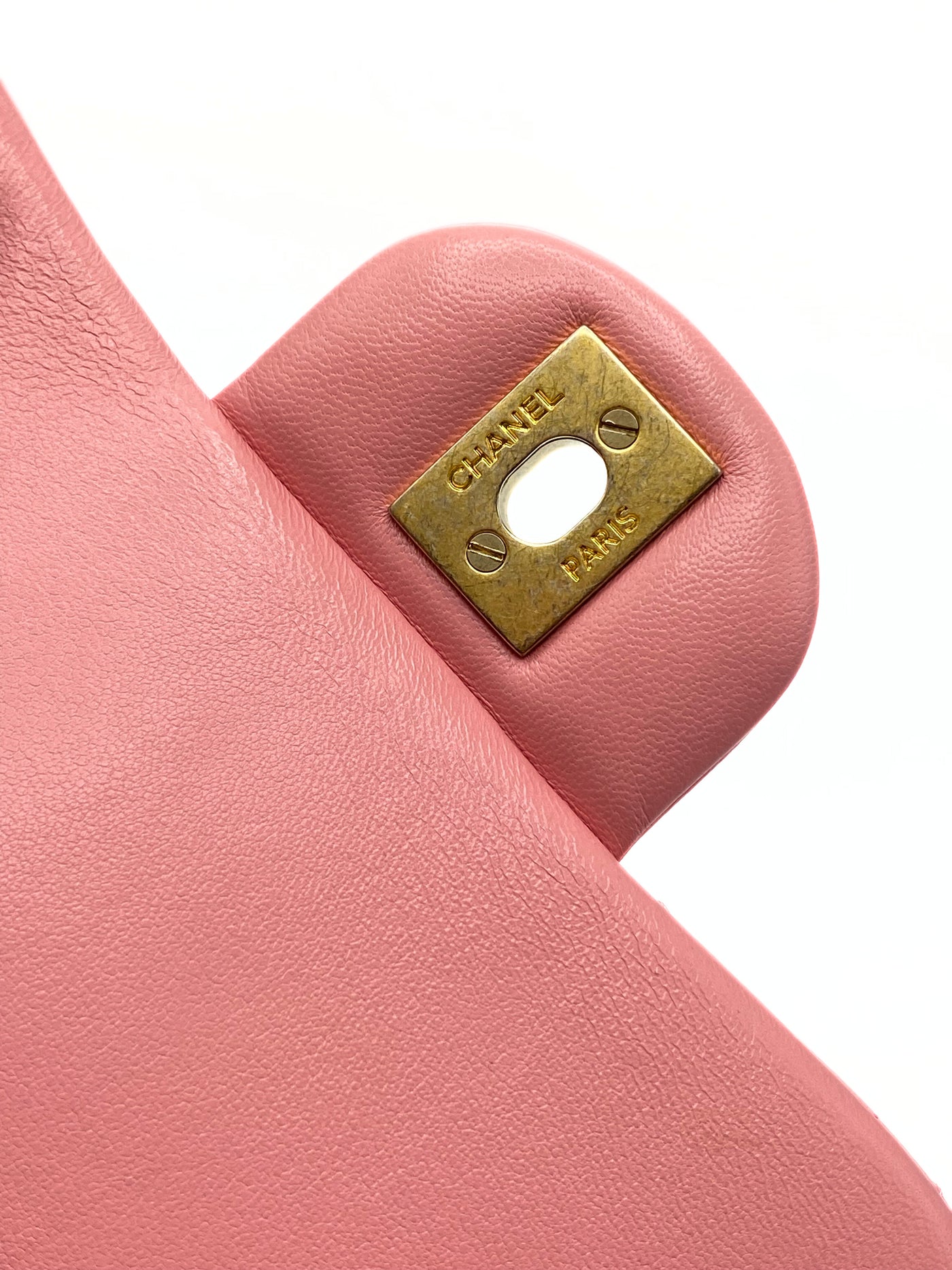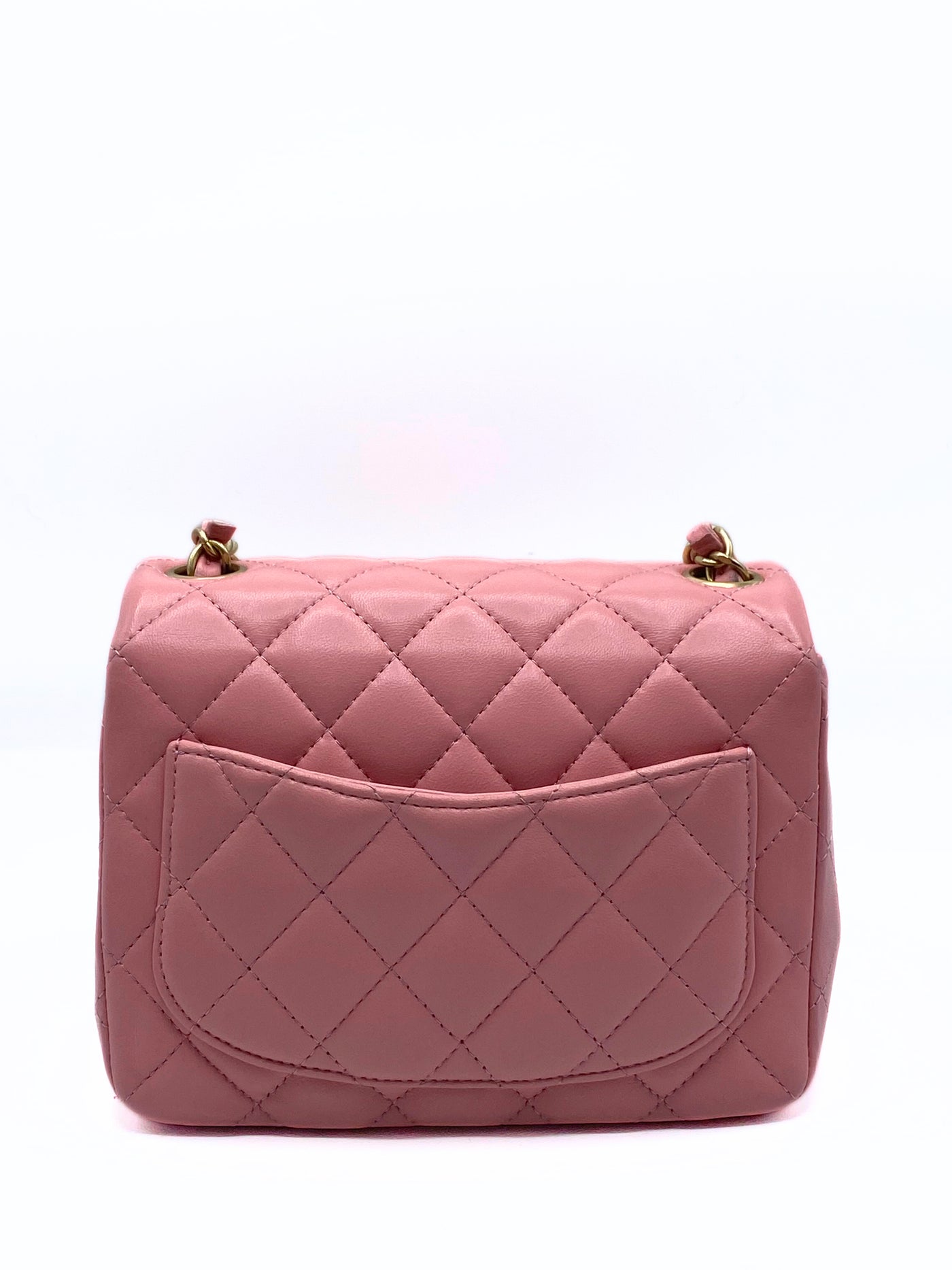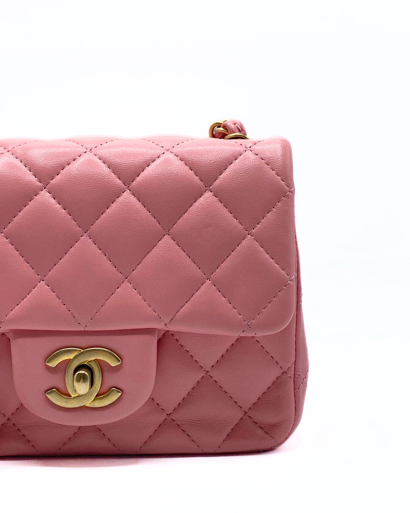 This elegant Chanel Classic Mini Flap (Classic Mini Bag with Flap) in blush pink lambskin with gold hardware is a Rare finds that is a seasonal release of the Maison. This model is known for its diamond quilted design, braided leather shoulder strap with chain and iconic swivel closure with CC logo.