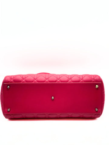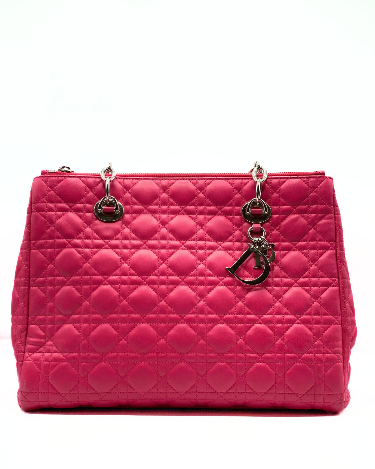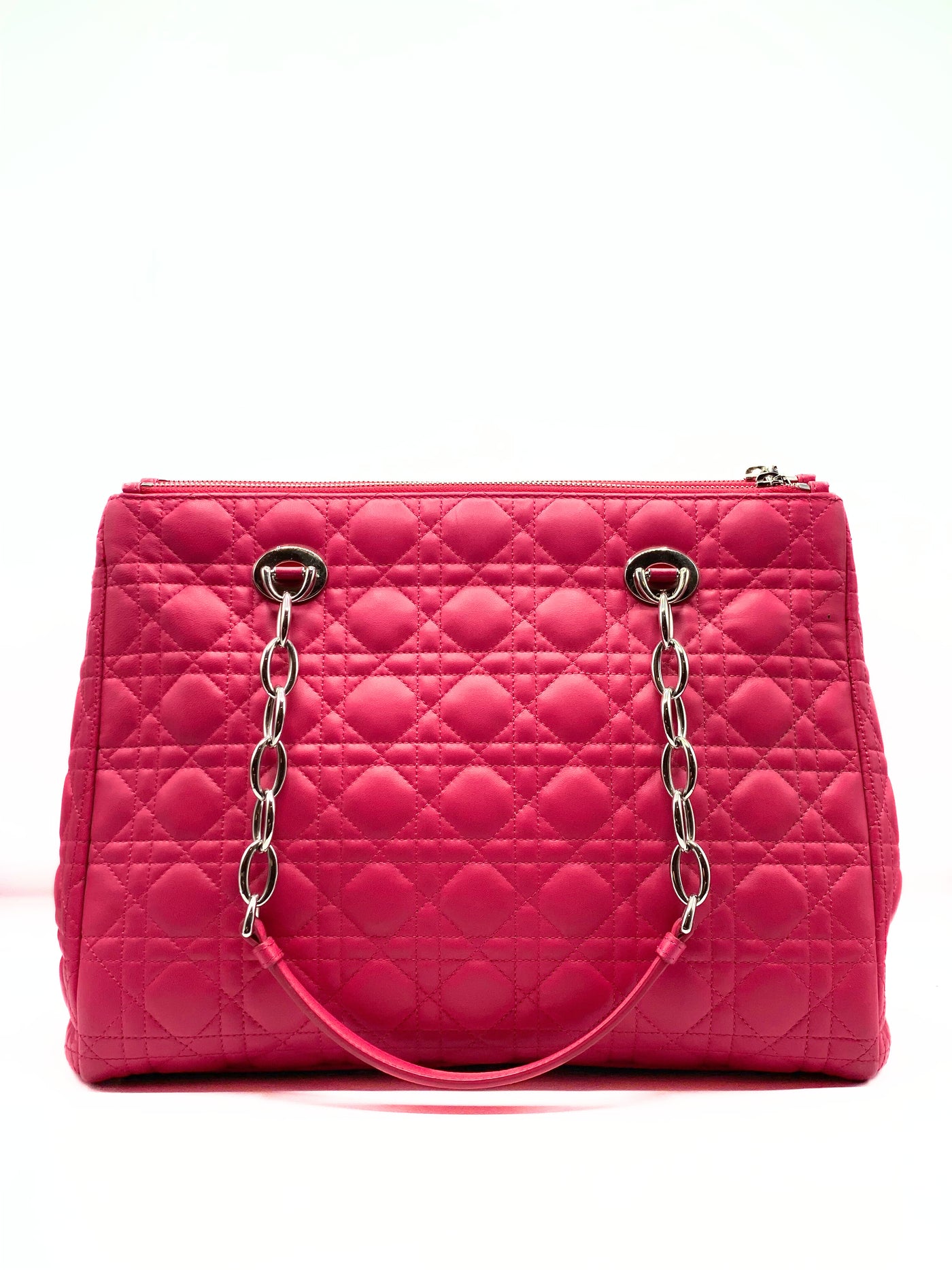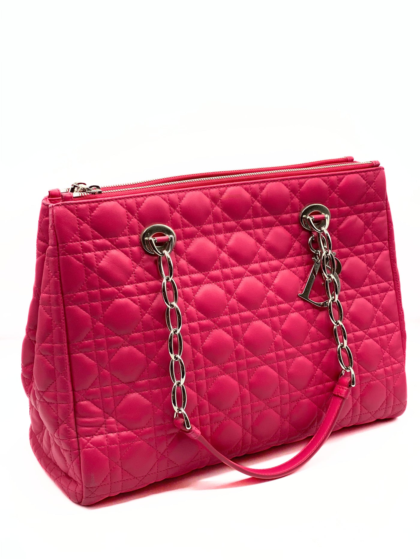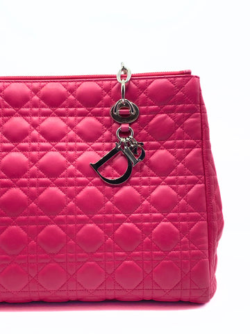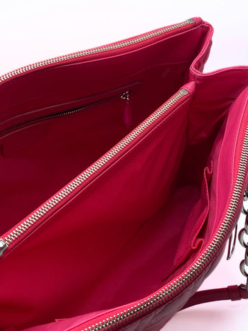This Dior Lady Soft Shopping Tote is crafted of lambskin leather in Fuschia. The bag features a silver chain link shoulder strap with a leather shoulder pad and a matching Dior charm. The top is open to a partitioned fabric interior and central zippered pocket with additional zipper and patch pockets.