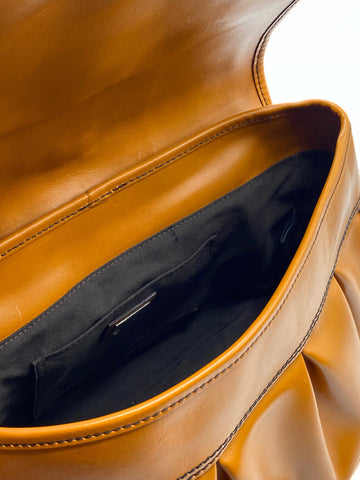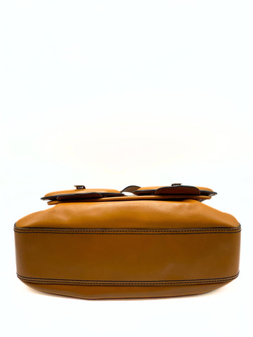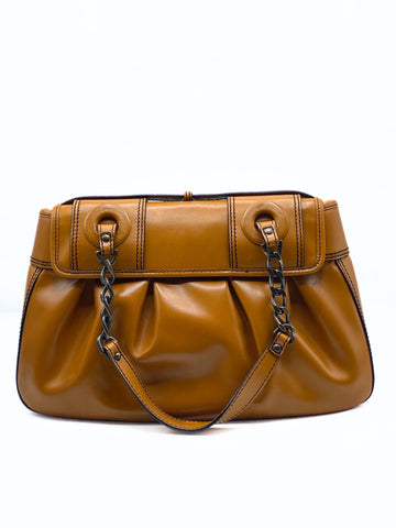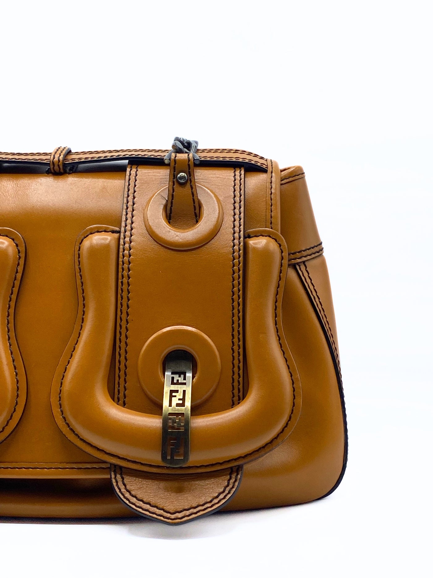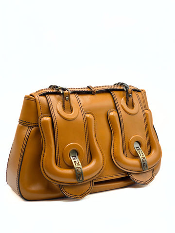 This Fendi B Bag is crafted of brown leather. The bag features decorative oversized buckles on the flap and dark brass chain-link handles with leather shoulder pads.