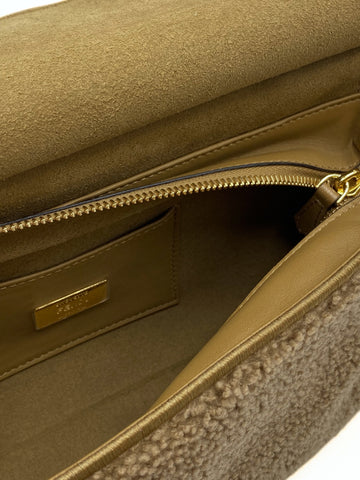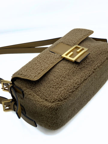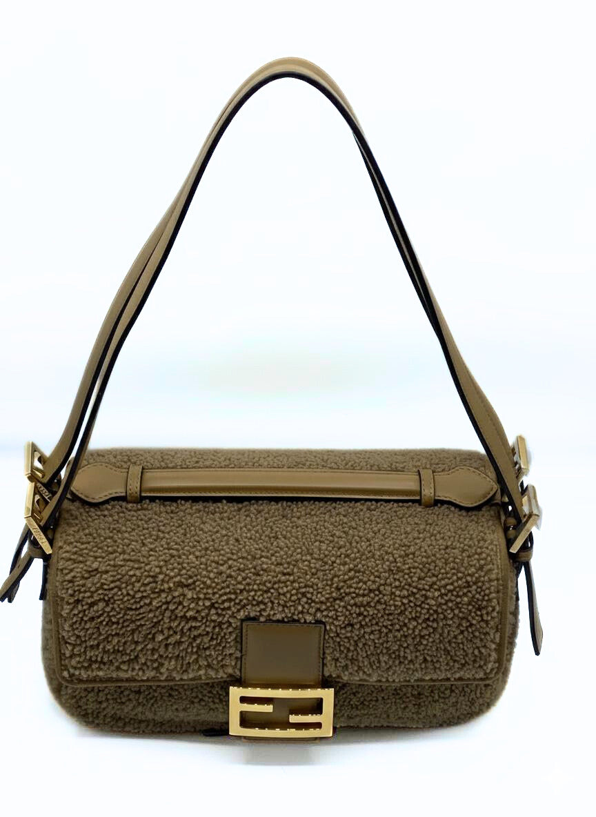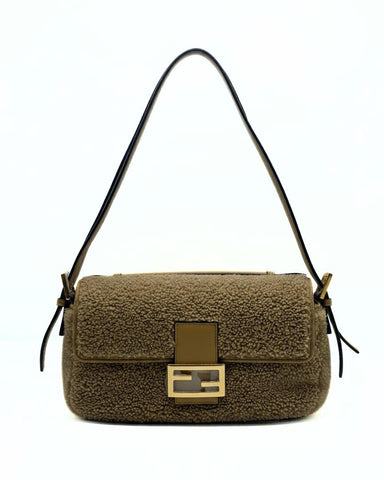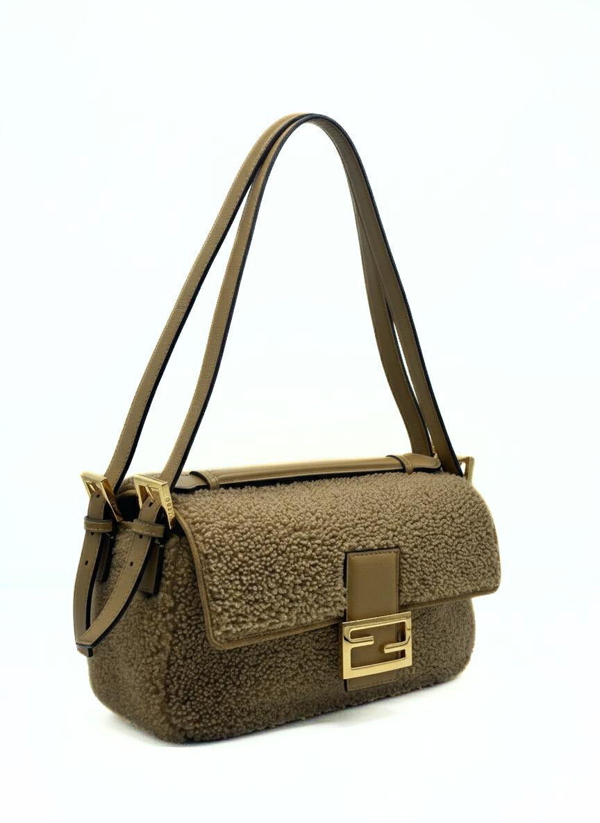 This Fendi Double Baguette is crafted of Montone fur. It have a gold hardware, two leather handels and a matching top handle. This Fendi Baguette is unique, for her double design, is practicle and can keep all the essentials during the days.