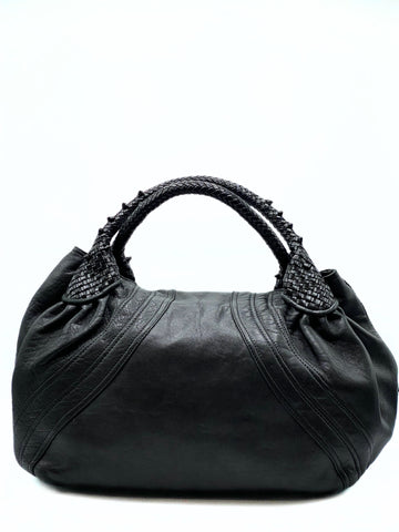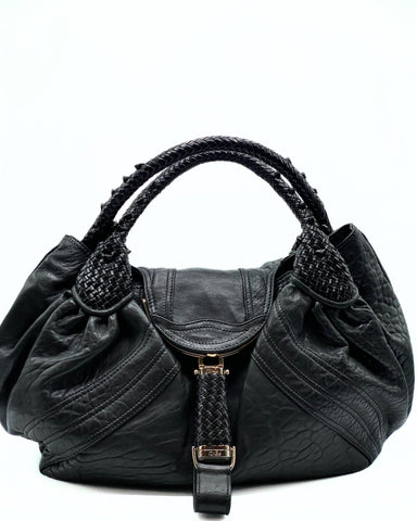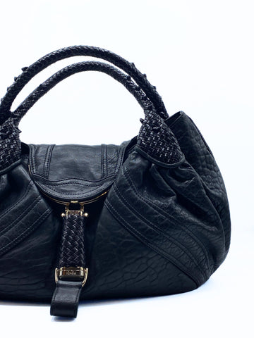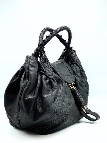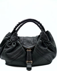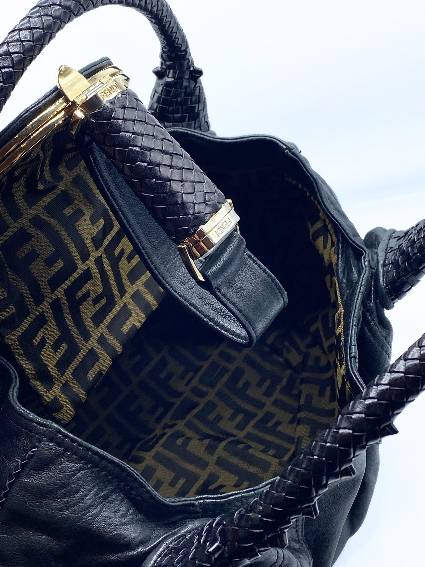 This Fendi Spy bag is a large hobo style in relaxed and very soft Black Nappa leather. It have a stunning tightly woven top handle. The bag is shut via a cross-over top flap (with hidden large flat pocket) to the front of. The top flap opens to a large interior fully lined in Fendi FF Zucca fabric. Recently the Spy made a comeback in the Fendi fall/winter 2025/2026 runway show.
