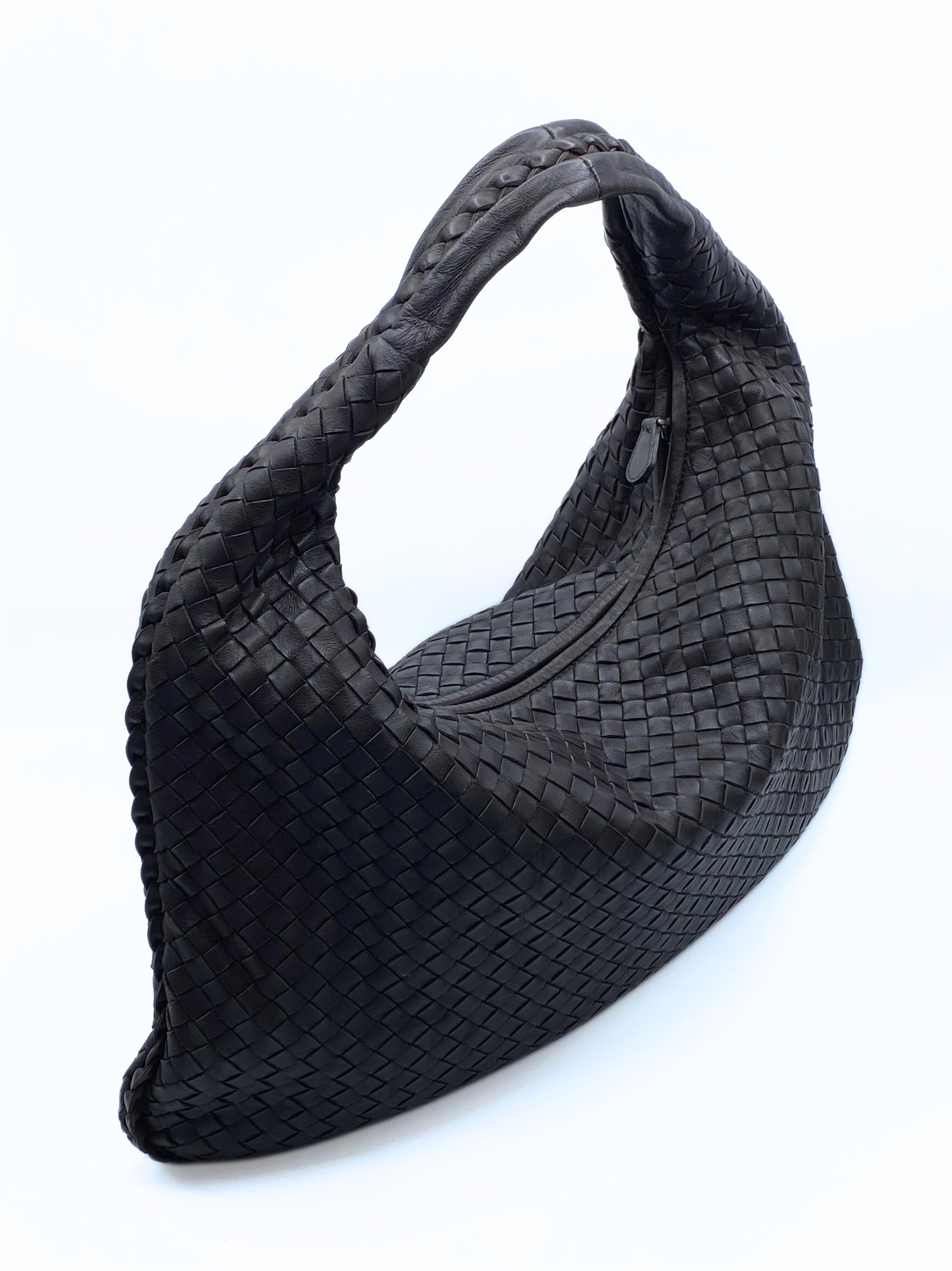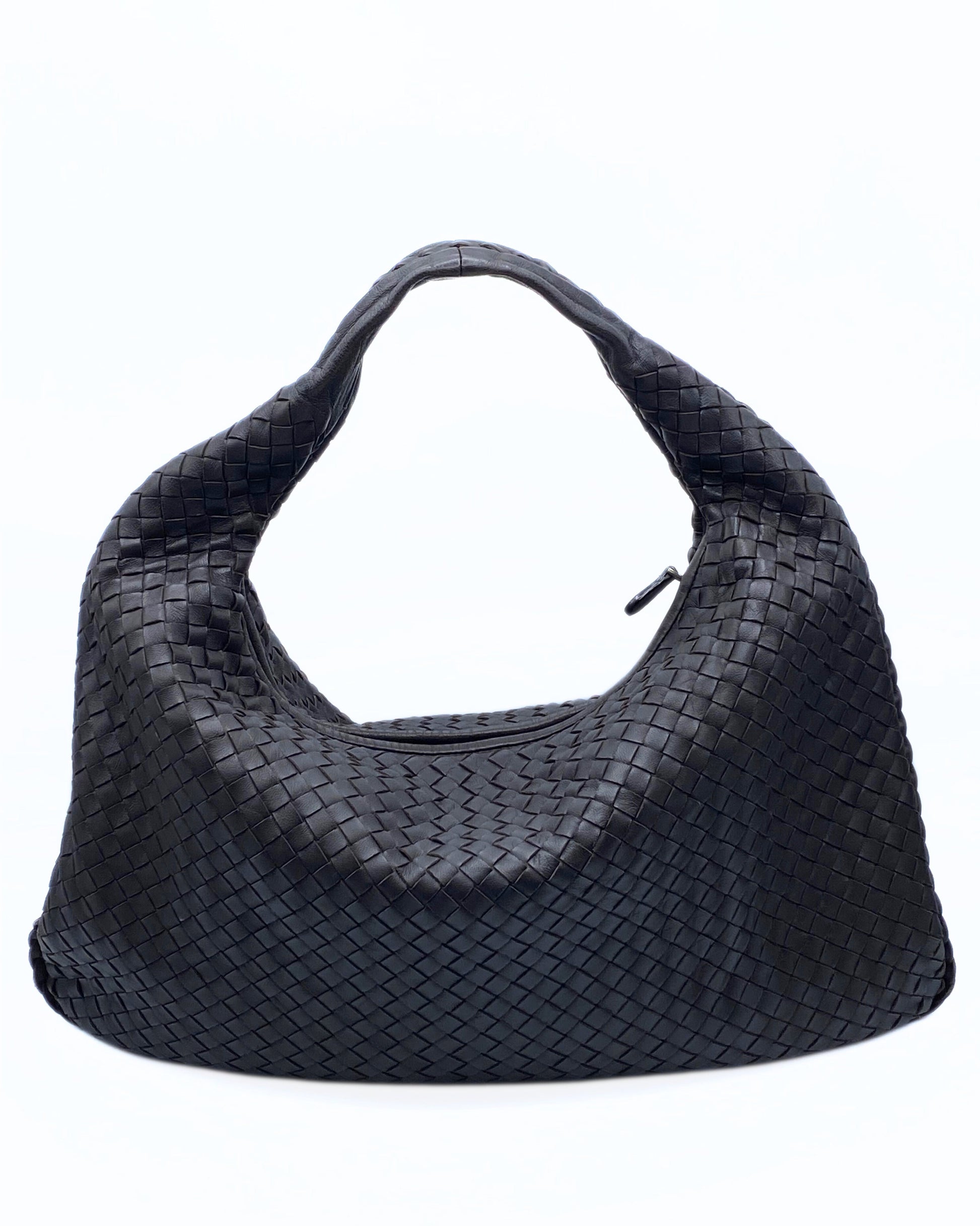 This hobo bag features Bottega Veneta’s iconic intrecciato woven leather craftsmanship, which is a hallmark of the brand. The leather is soft yet durable, giving the bag a luxurious and timeless appeal. The bag is in a fondant dark brown tone, making it versatile and suitable for both casual and formal occasions. The matte finish enhances its understated elegance. It has a slouchy hobo silhouette with a single, integrated handle that flows seamlessly from the body of the bag. The design is minimalist, with no visible logos, emphasizing the craftsmanship.The bag appears to be spacious, ideal for everyday use, and can comfortably hold essentials such as a wallet, phone, keys, and small personal items. The soft structure allows it to drape naturally when carried.