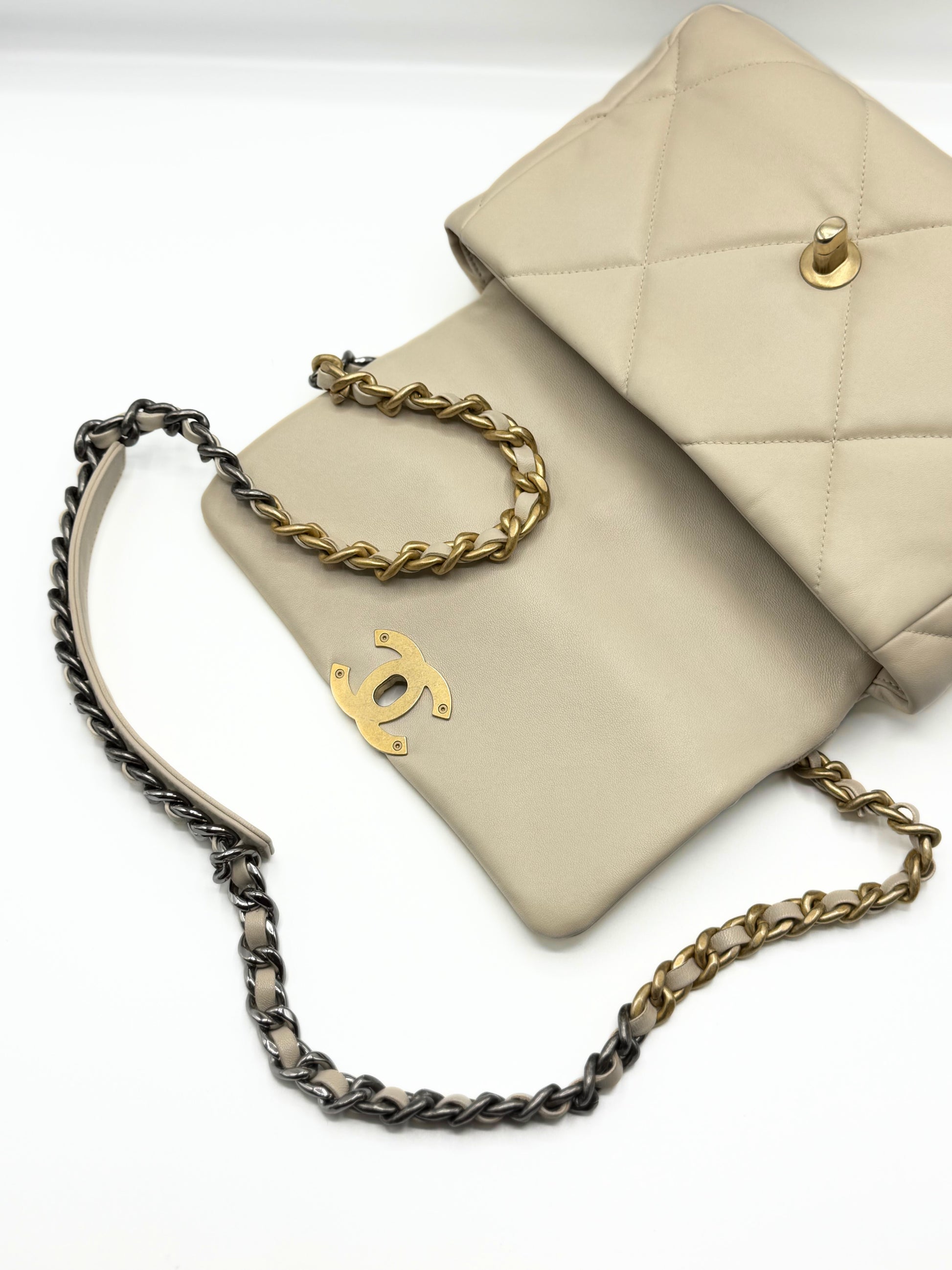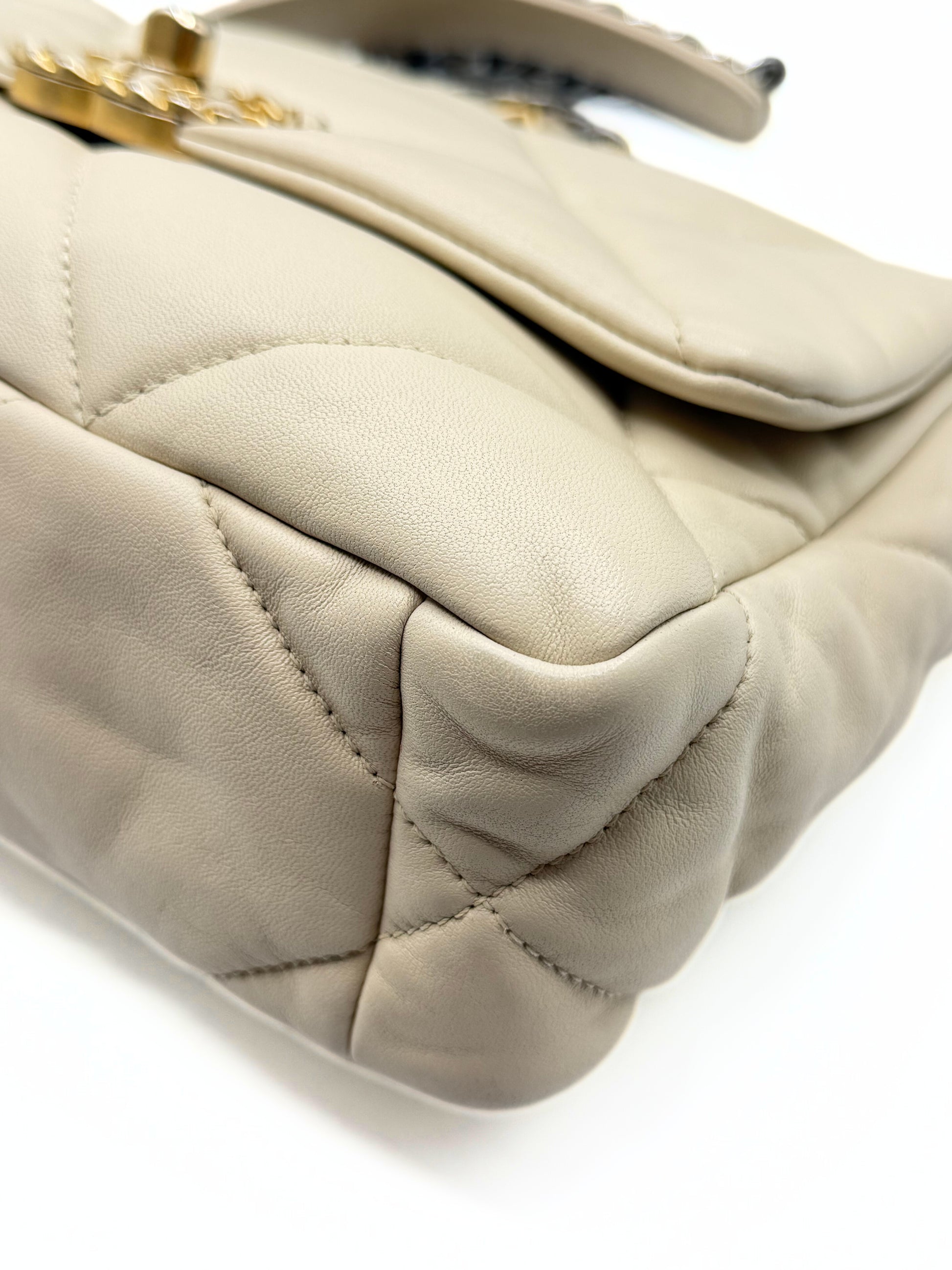 This Chanel 19 Beige Small is crafted of oversized quilted kidskin leather. The bag features a chain detail CC turn-lock and a leather threaded aged gold, ruthenium and dark silver chain-link shoulder strap, a classic of all the Chanel 19 bags. The flap opens to a matching fabric interior.