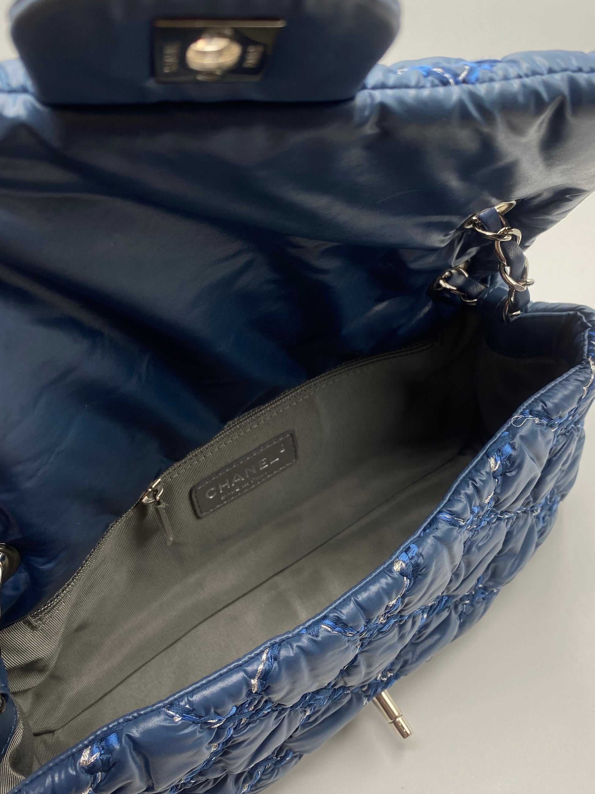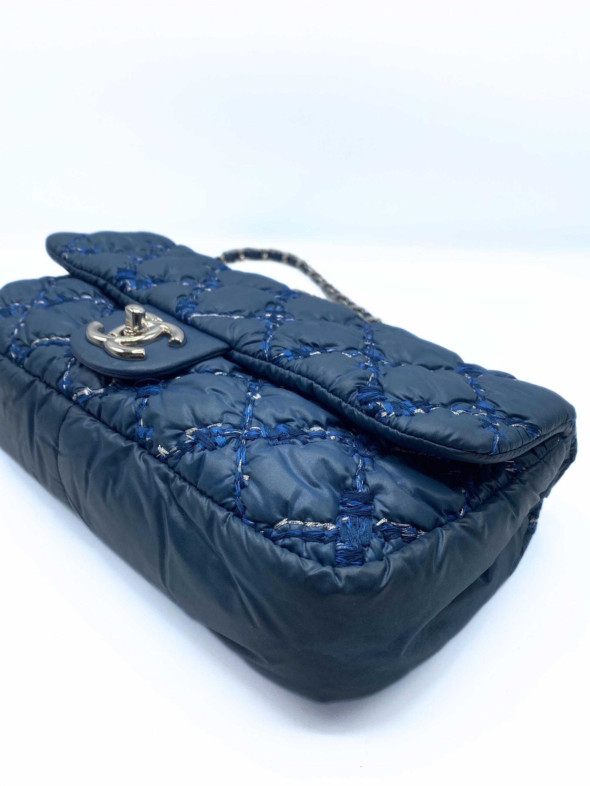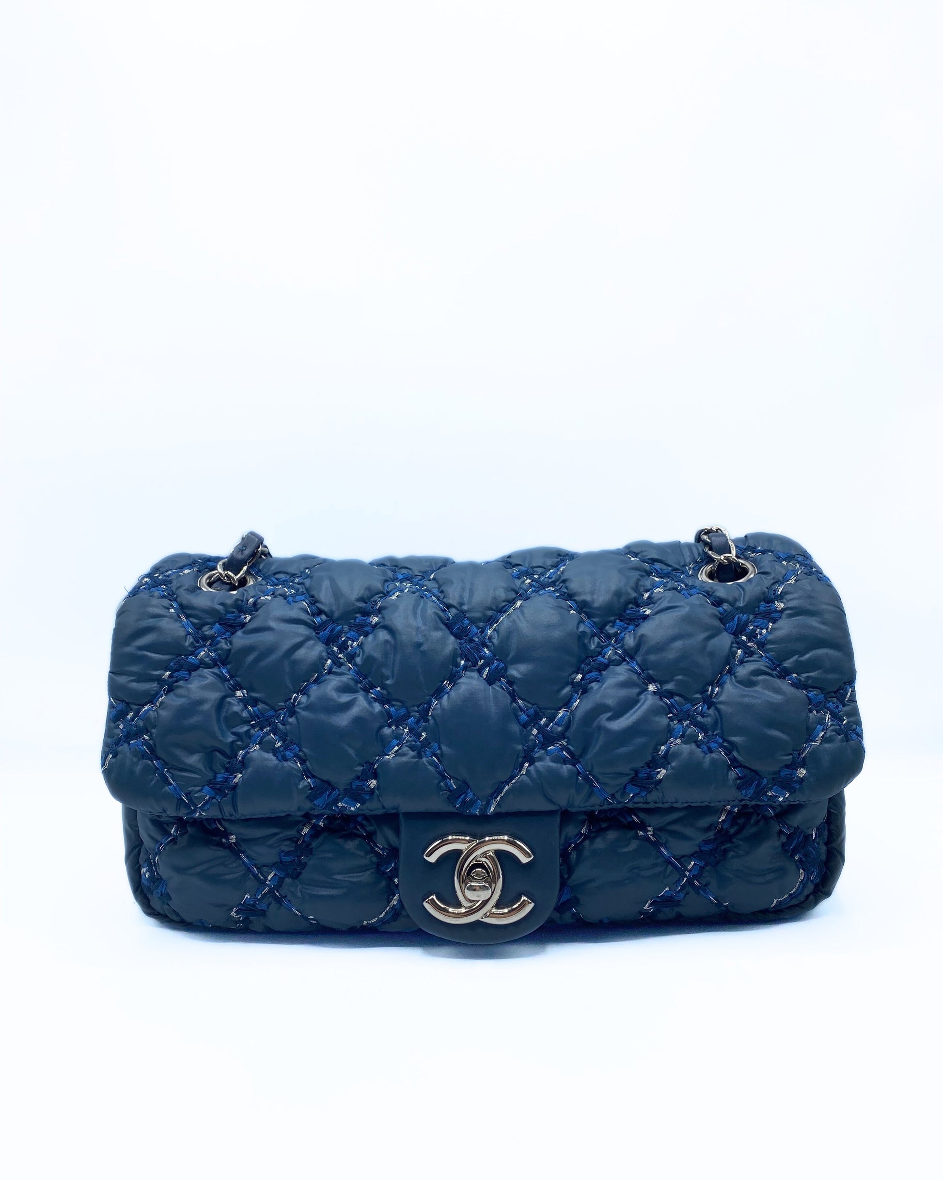 This Chanel Medium Bubble Flap bag is crafted of stuffed nylon with the classic diamond quilted of Chanel with tweed insert. The bag have silver chain link shoulder straps threaded with leather, a front flap and a silver CC turn lock.