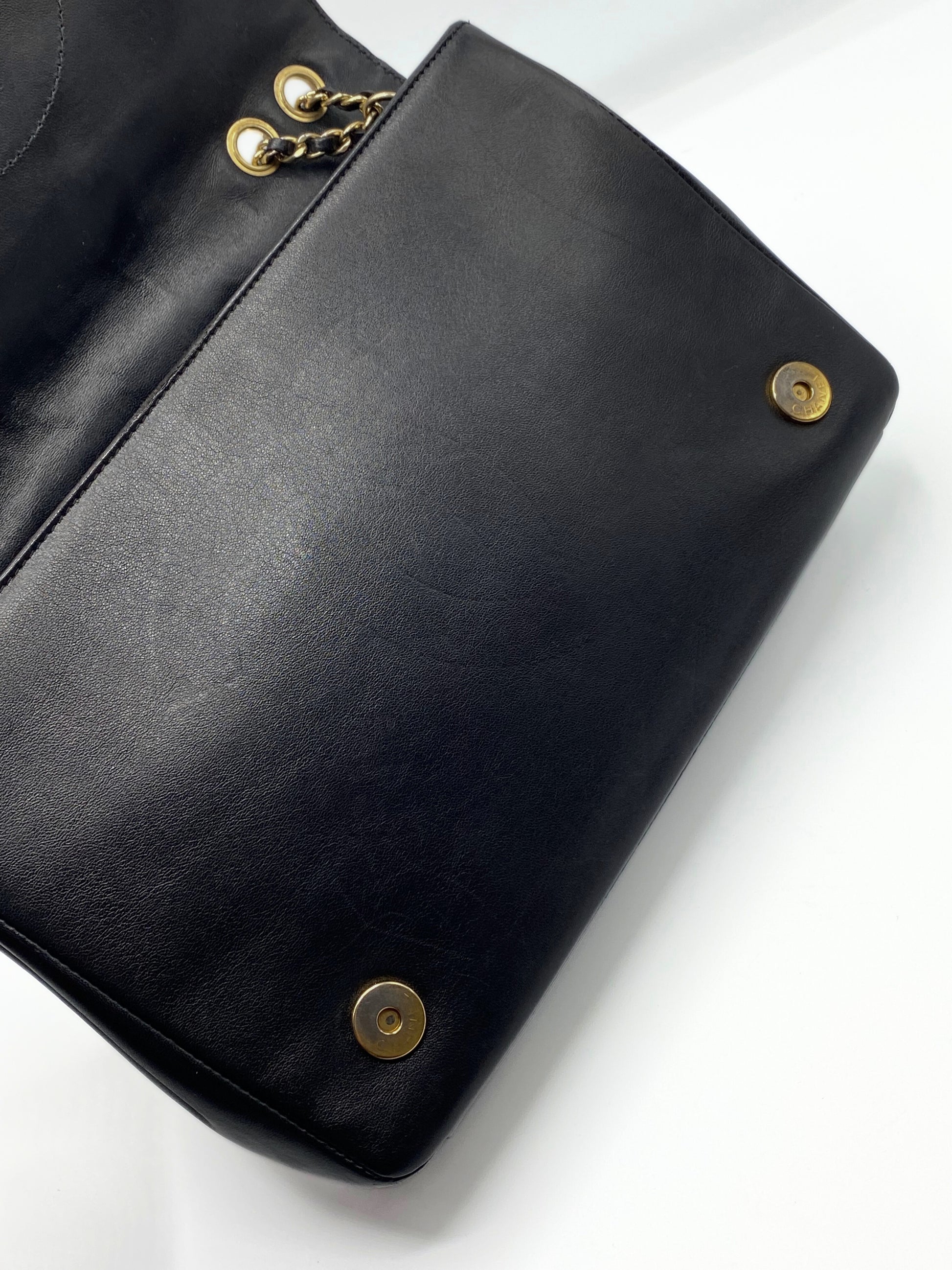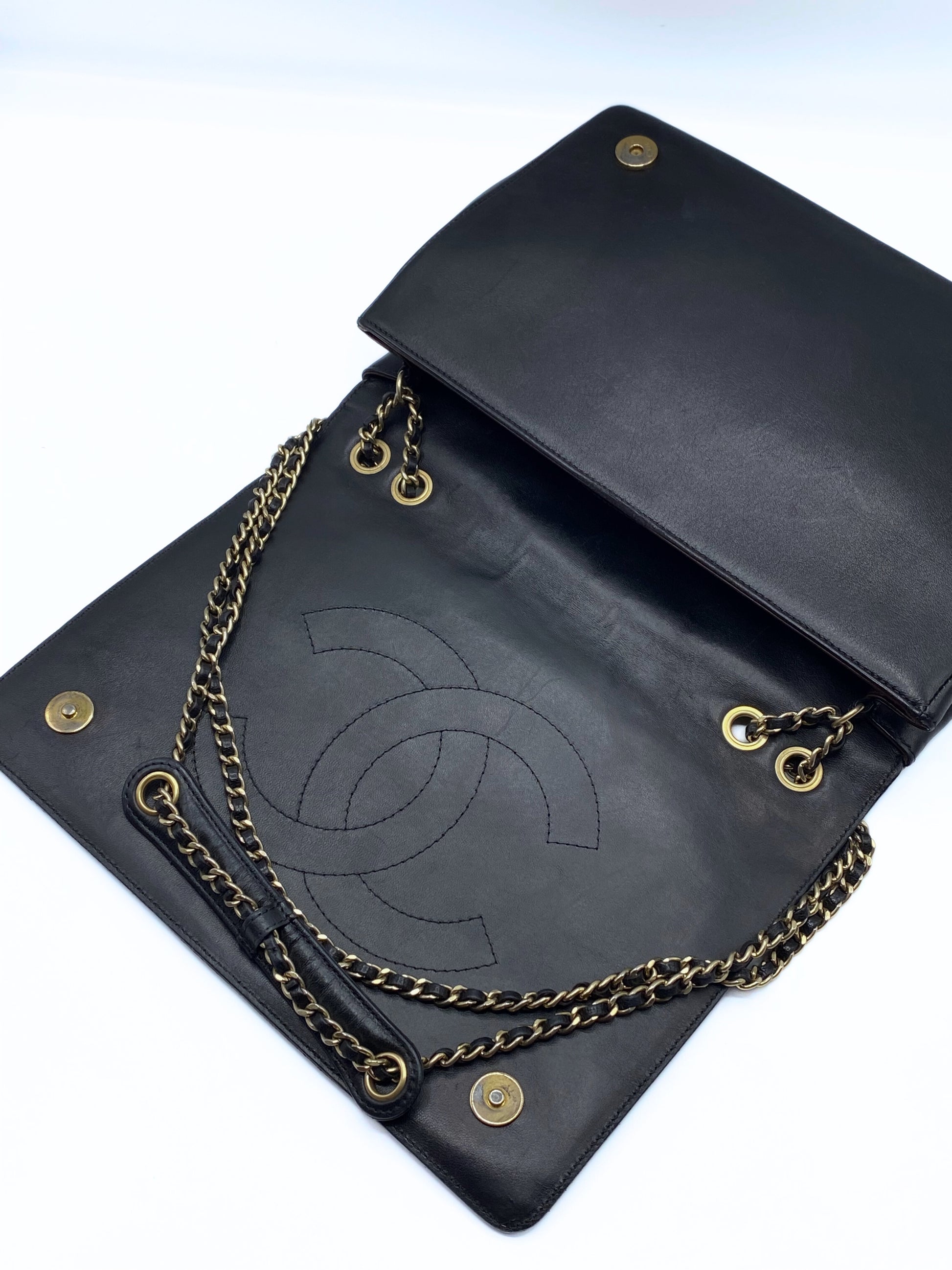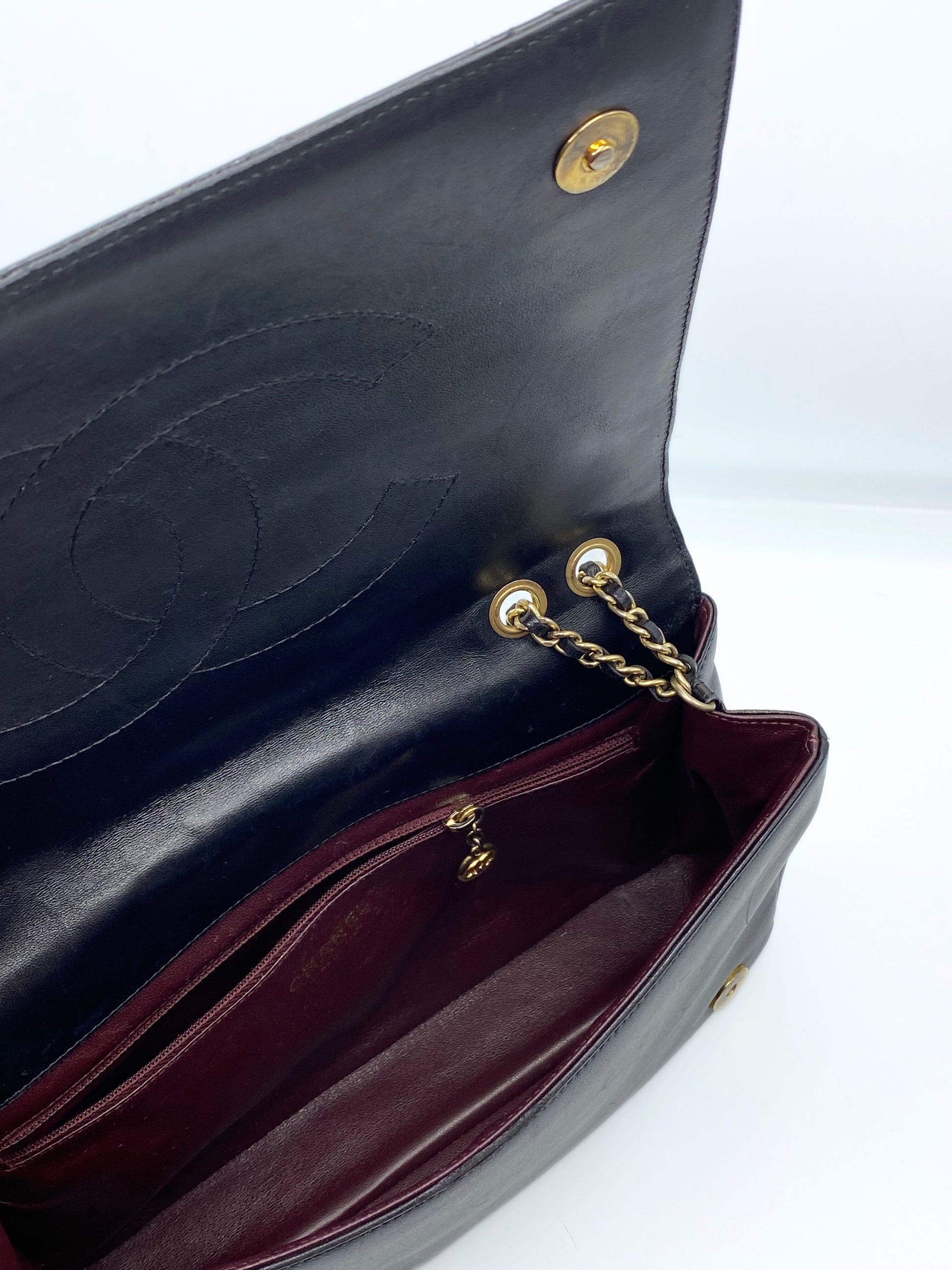 This Chanel CC Flap is crafted of black lambskin leather. It have on the front a bigger diamond with inside the classic CC of the maison. The inside, is made in red leather, to reclaim the vintage intern of the classic chanel bags.