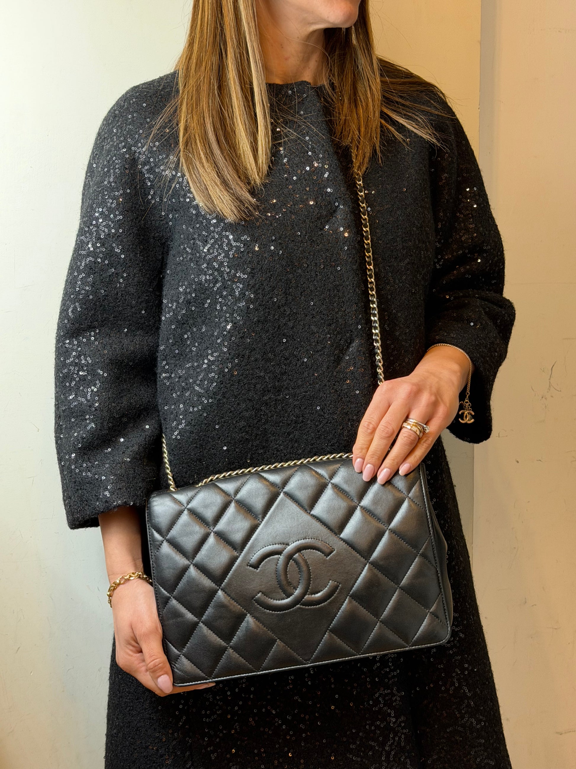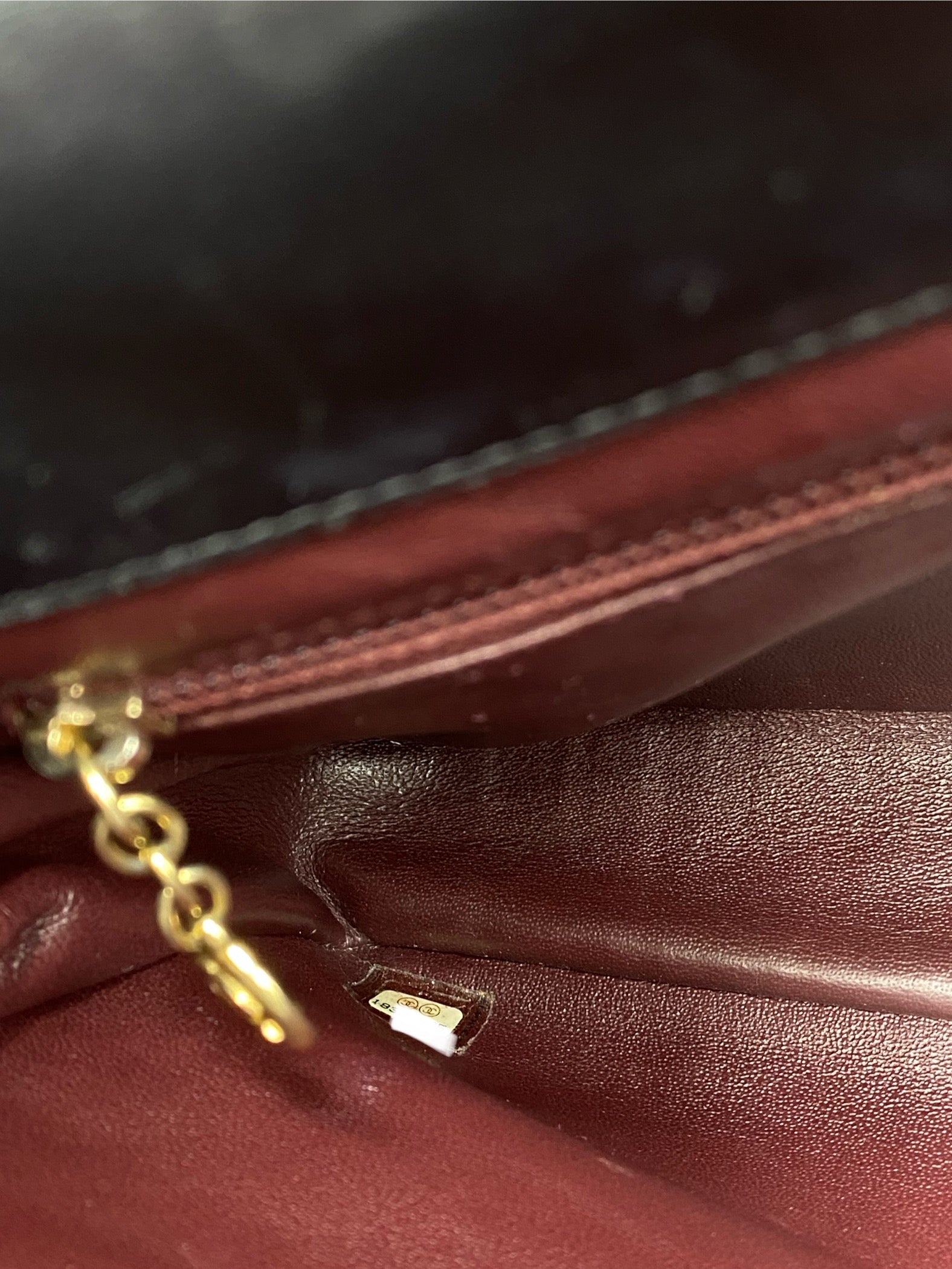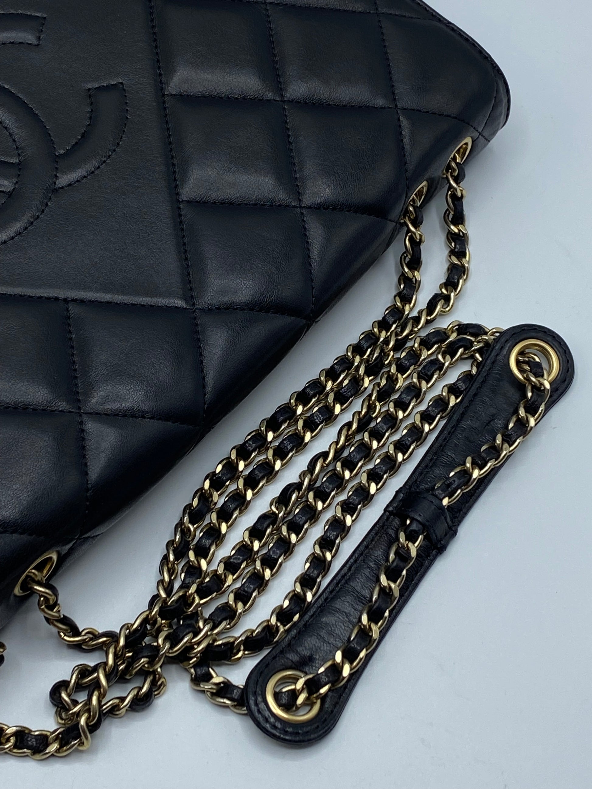 This Chanel CC Flap is crafted of black lambskin leather. It have on the front a bigger diamond with inside the classic CC of the maison. The inside, is made in red leather, to reclaim the vintage intern of the classic chanel bags.