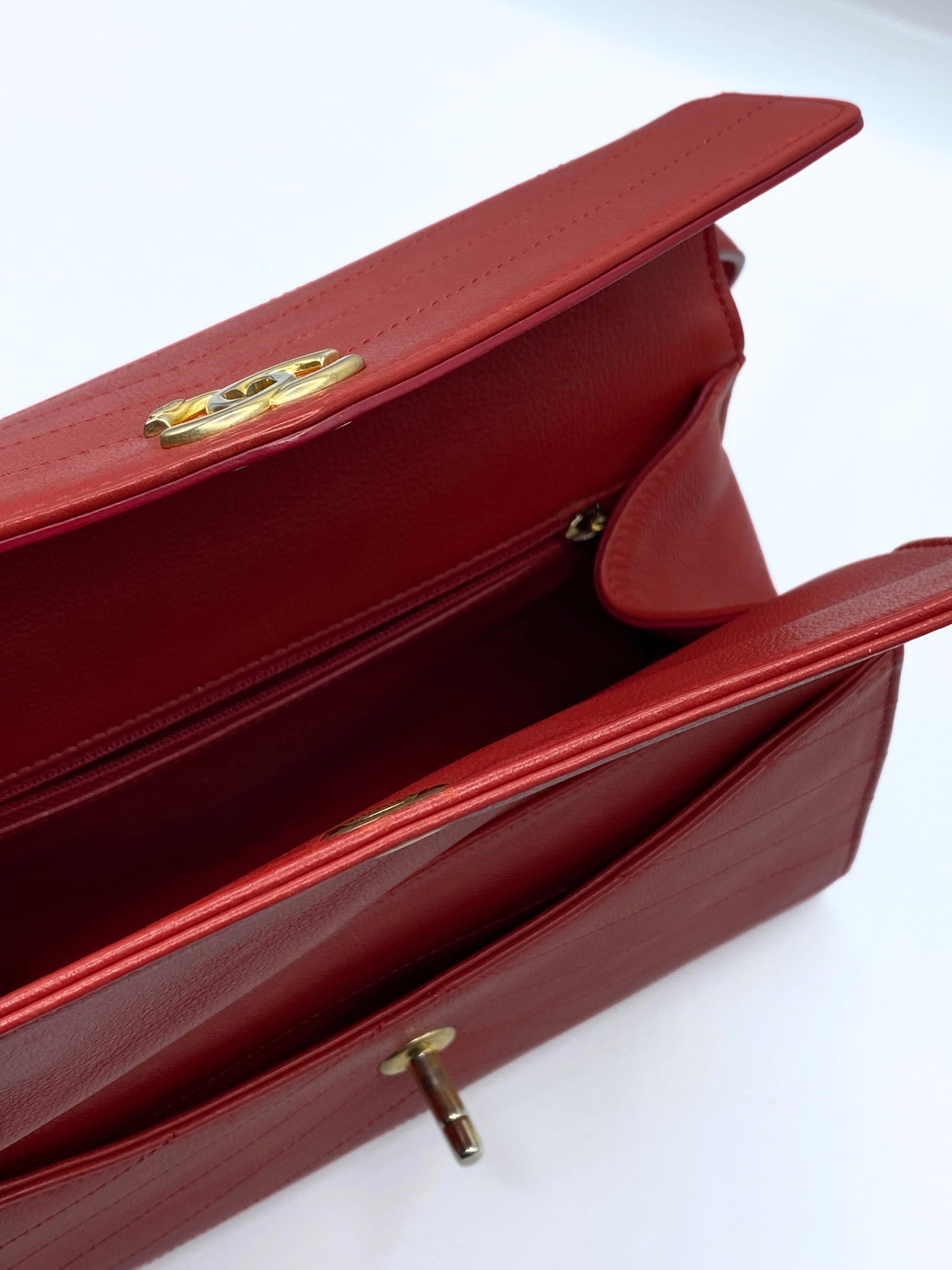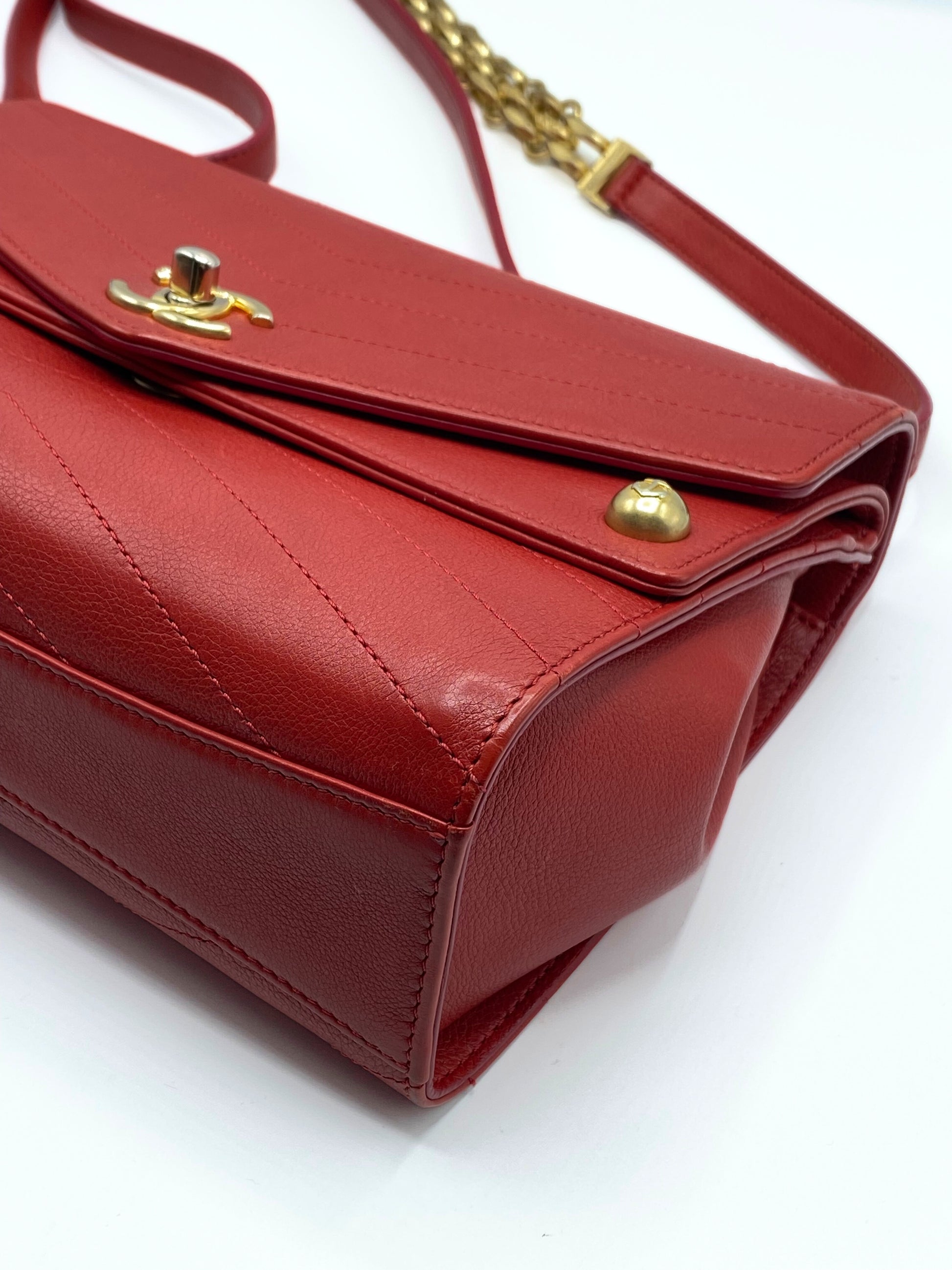 This Chanel Chevron Cruise Flap is crafted of calfskin leather in red. This shoulder bag features the classic Chanel CC turn lock and a red leather strap with a gold chain insert. On the front it have two small buttons with the CC of the brand in gold.
