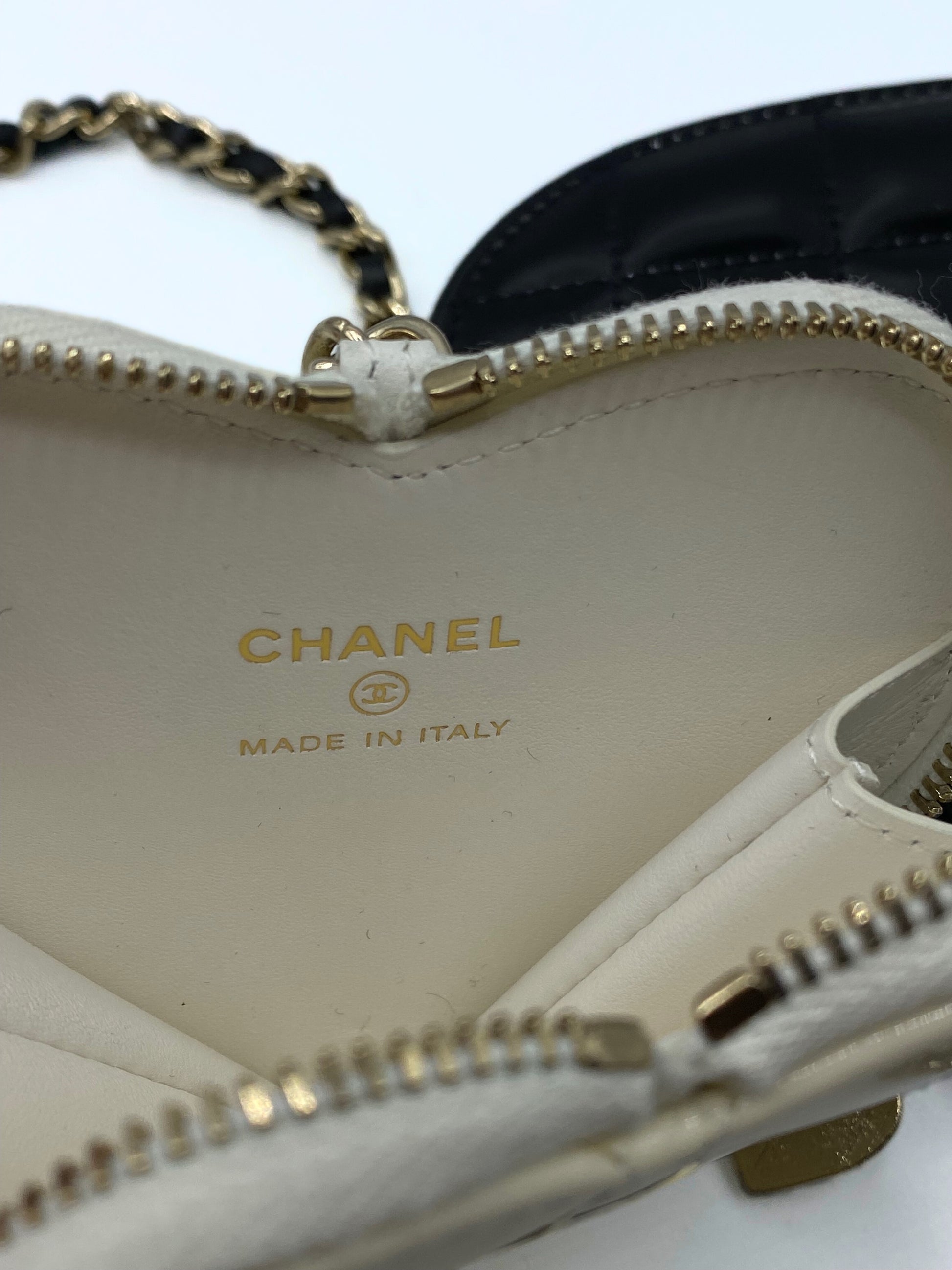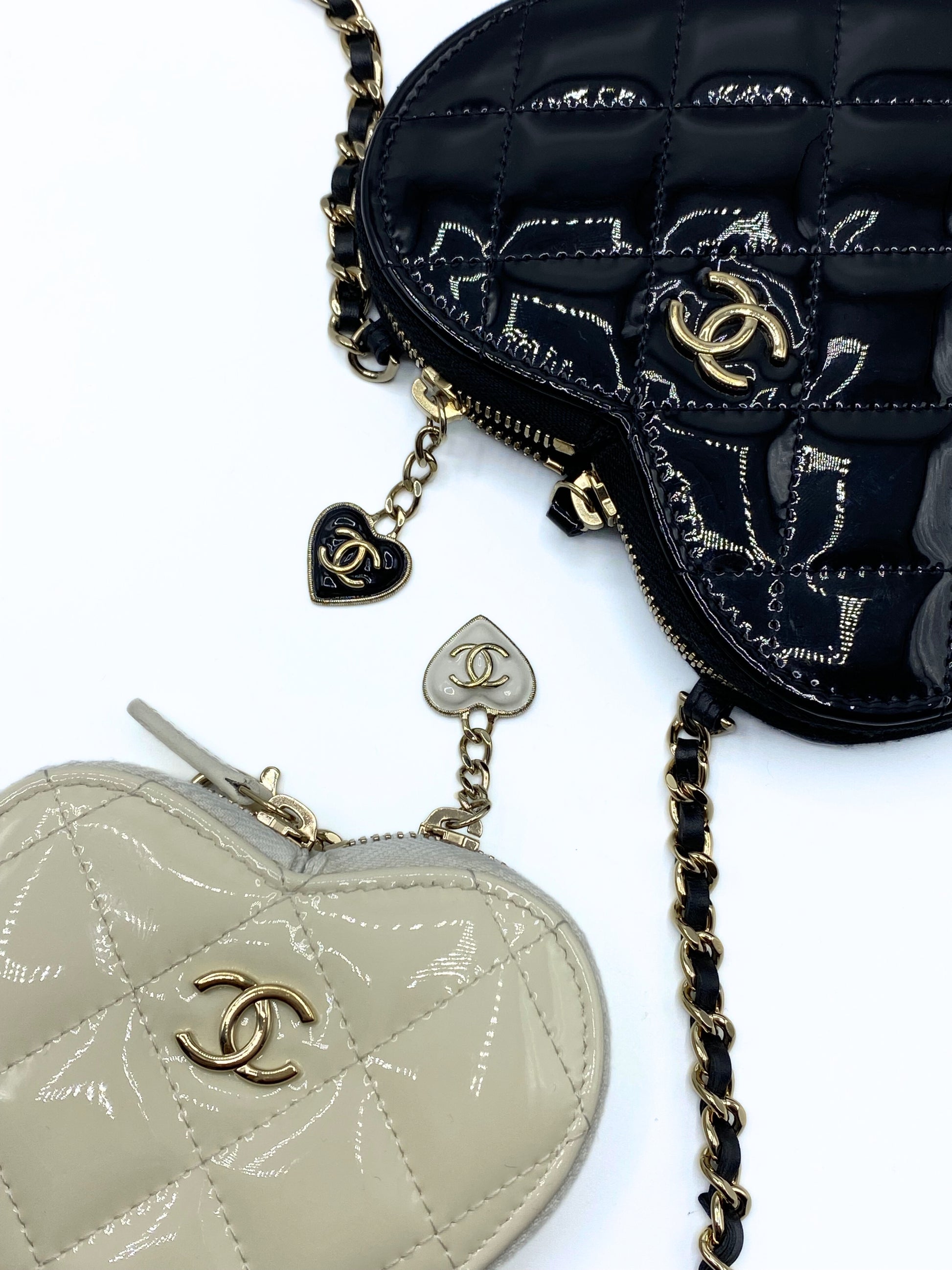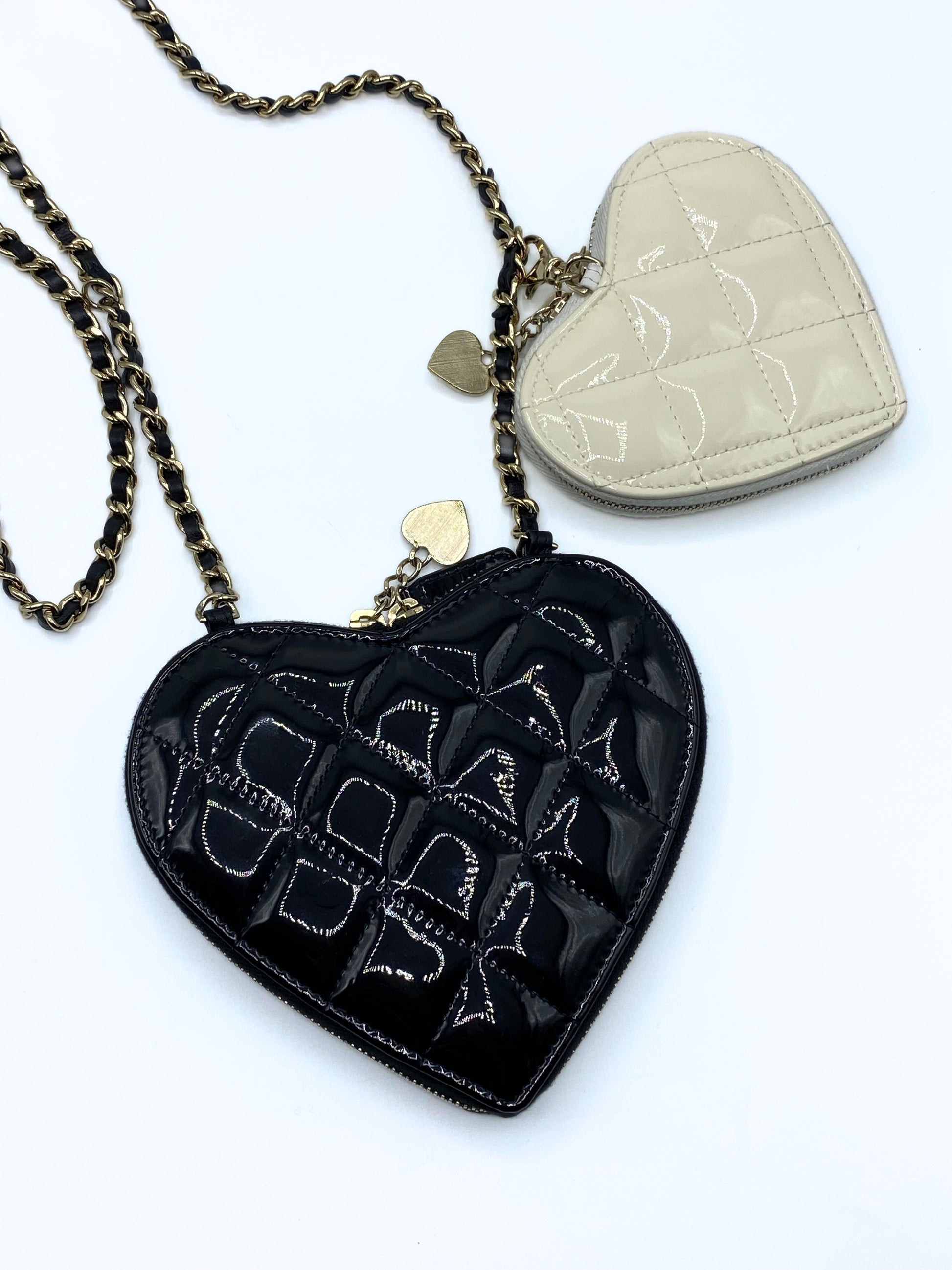 This Chanel CC Heart Clutch With Chain is crafted of patent leather in a shape of a heart in black and white patent leather removable pouch. The bag features a black leather threaded gold chain shoulder strap and gold Chanel CC logos.
