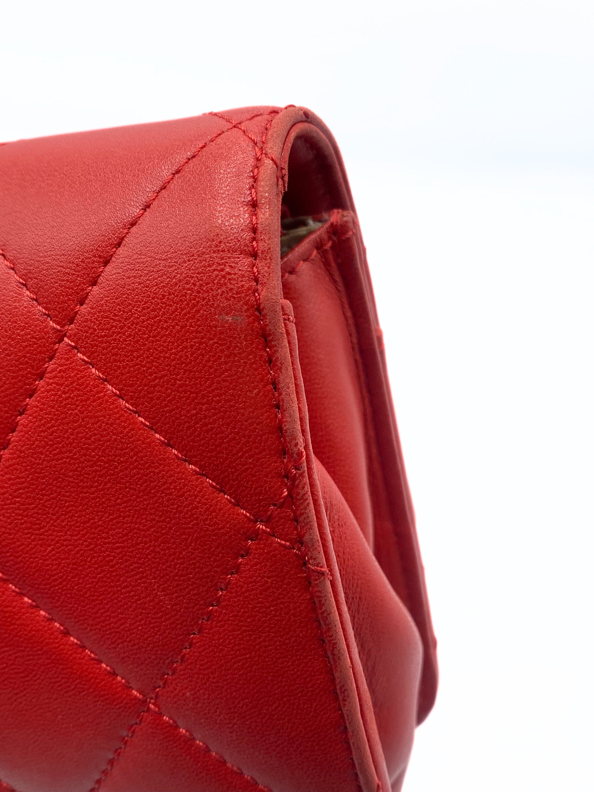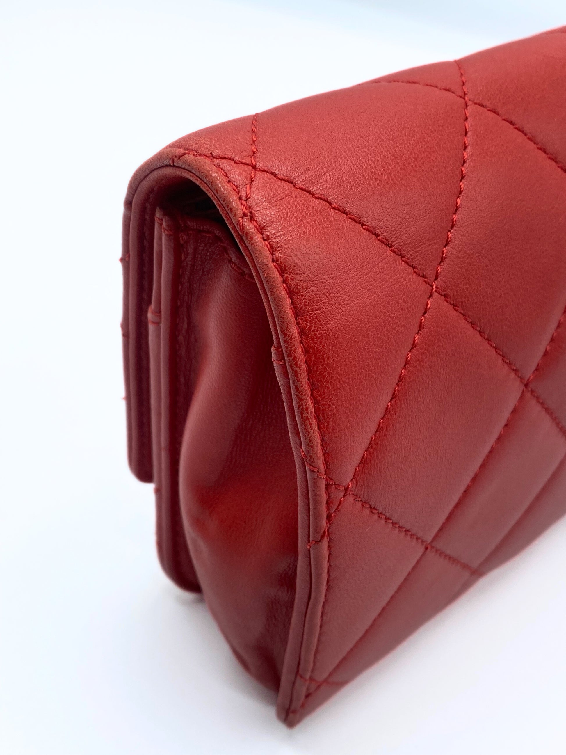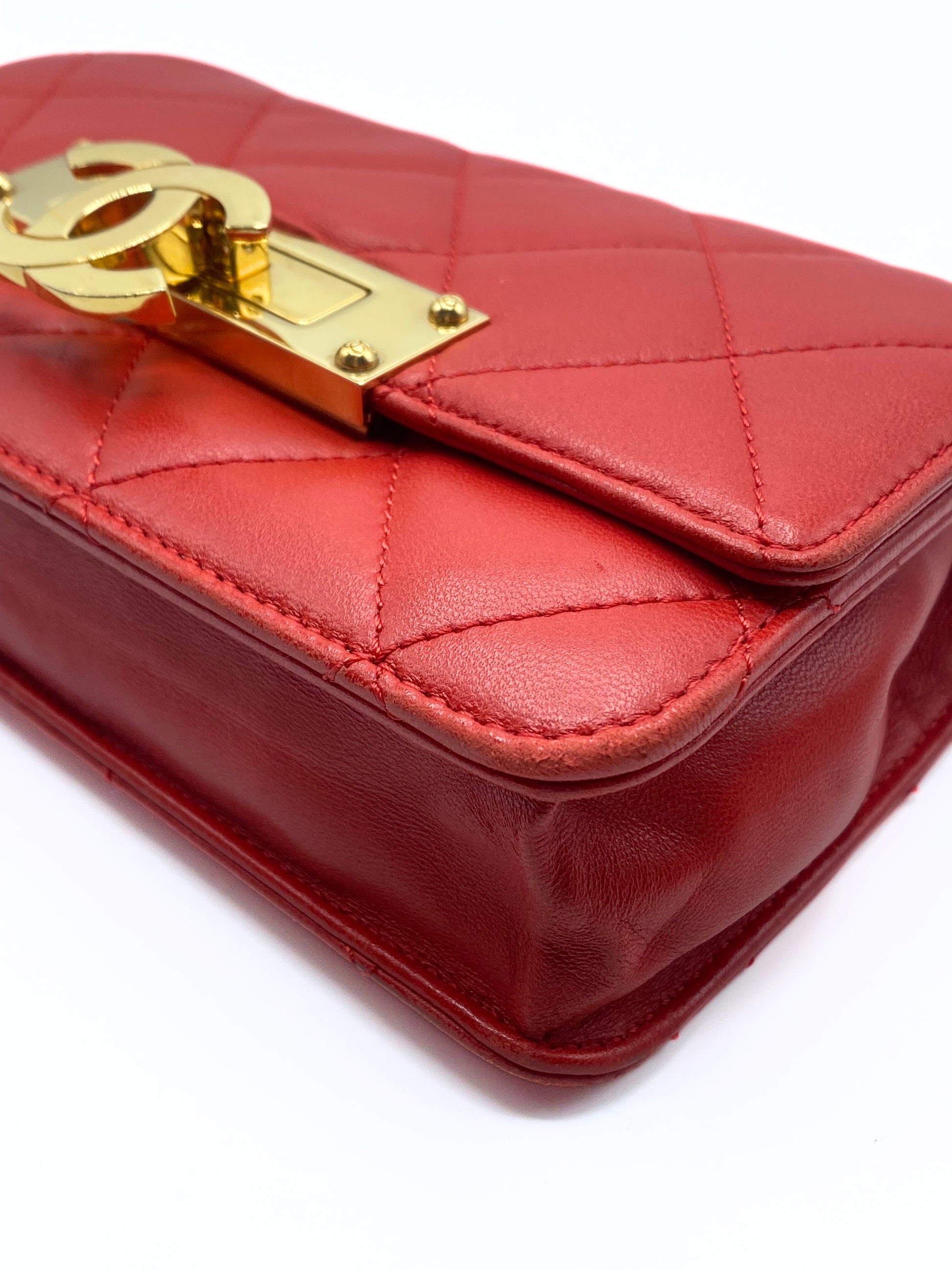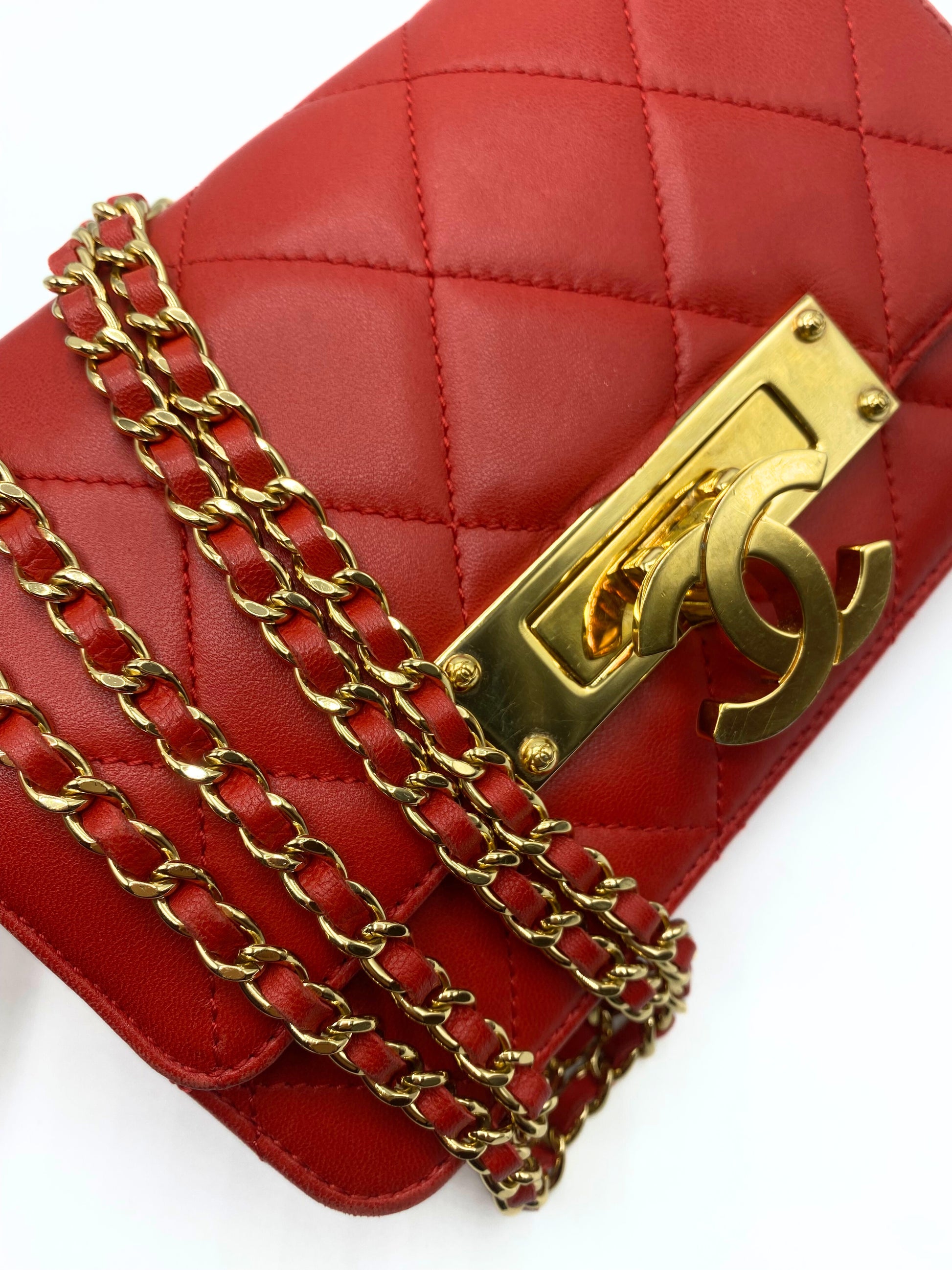 This Chanel Golden Class Wallet on Chain WOC is crafted of lambskin leather in red. It features a leather threaded gold chain shoulder strap and a flap with a polished gold CC clasp.