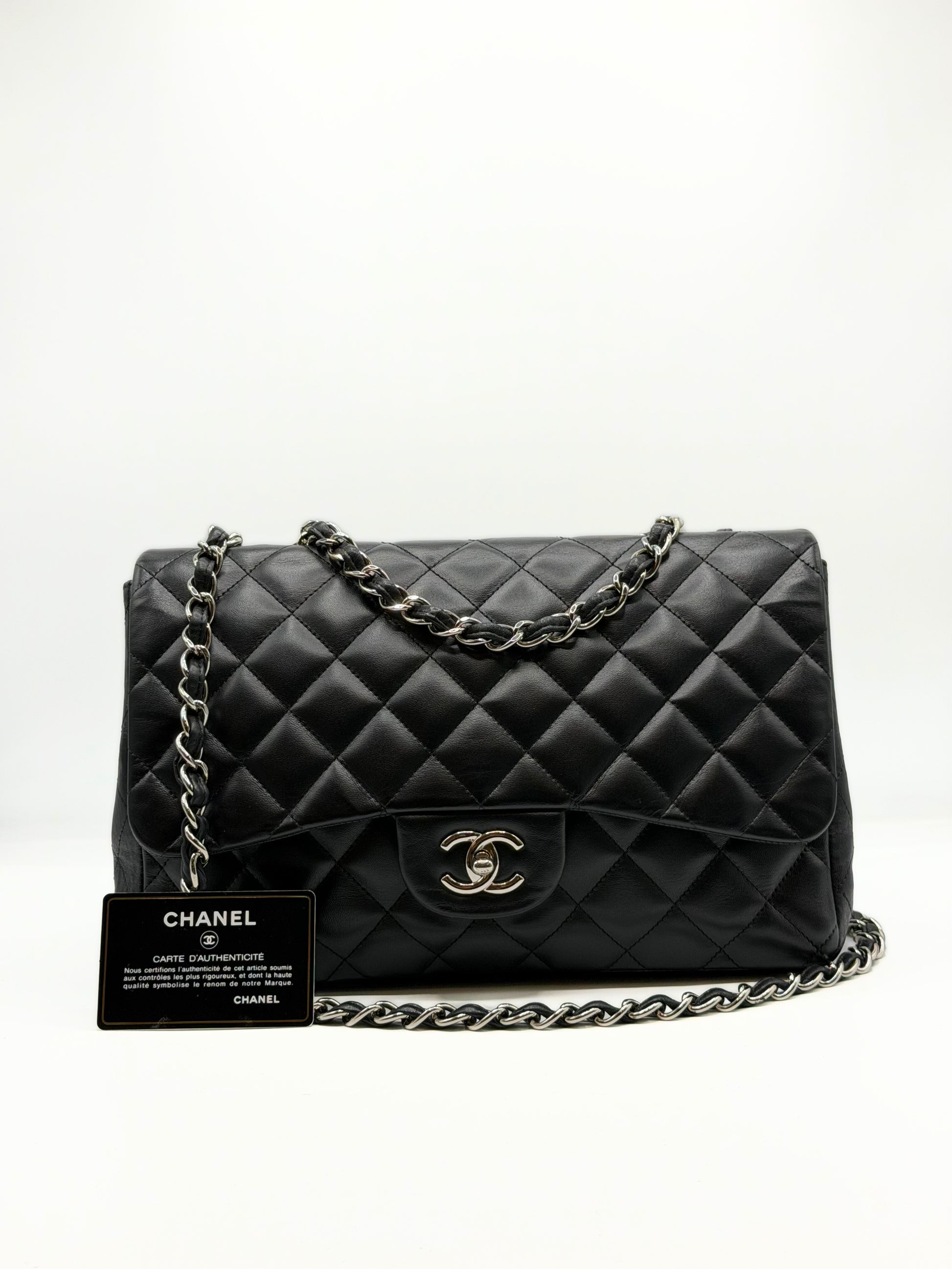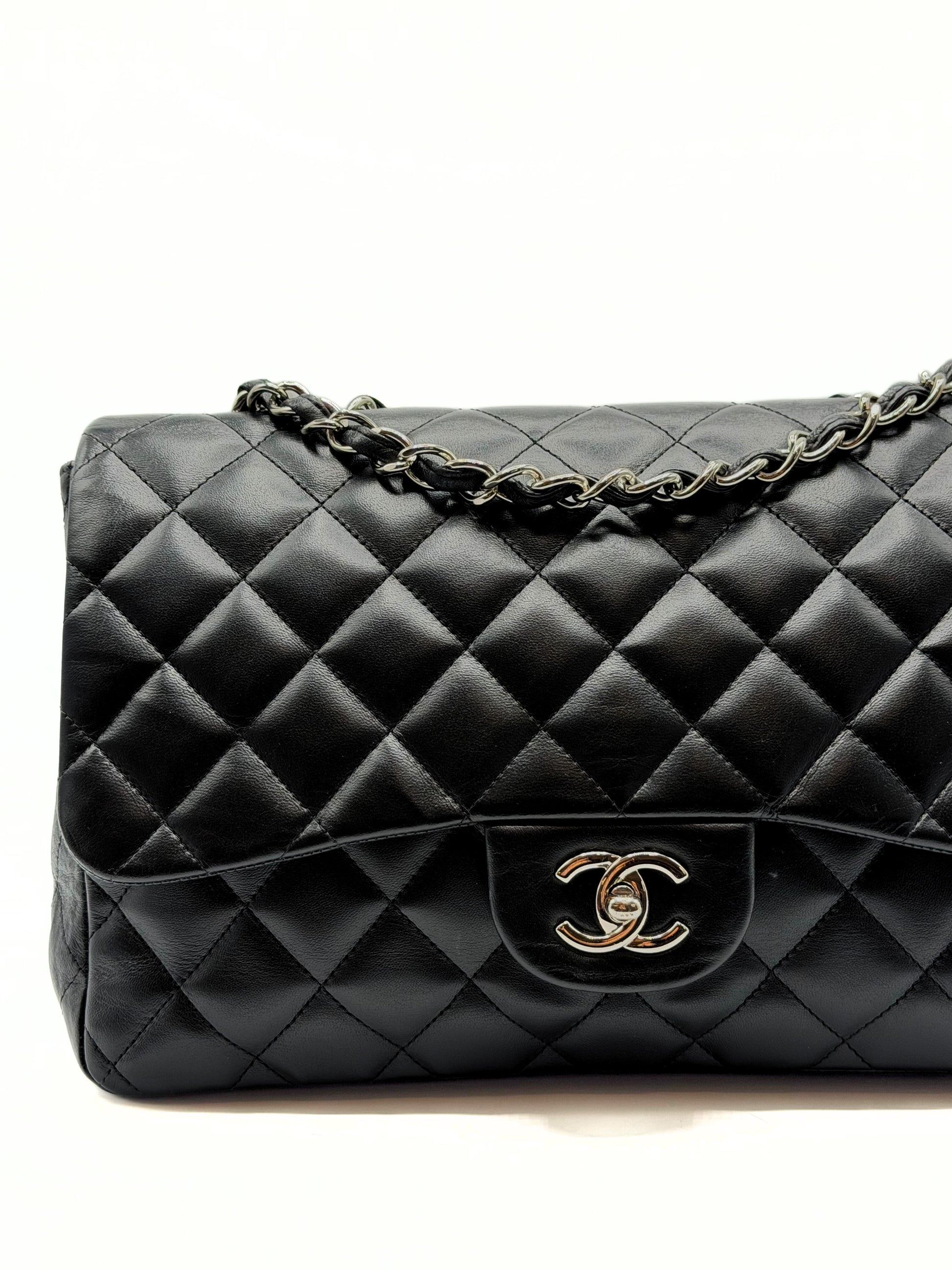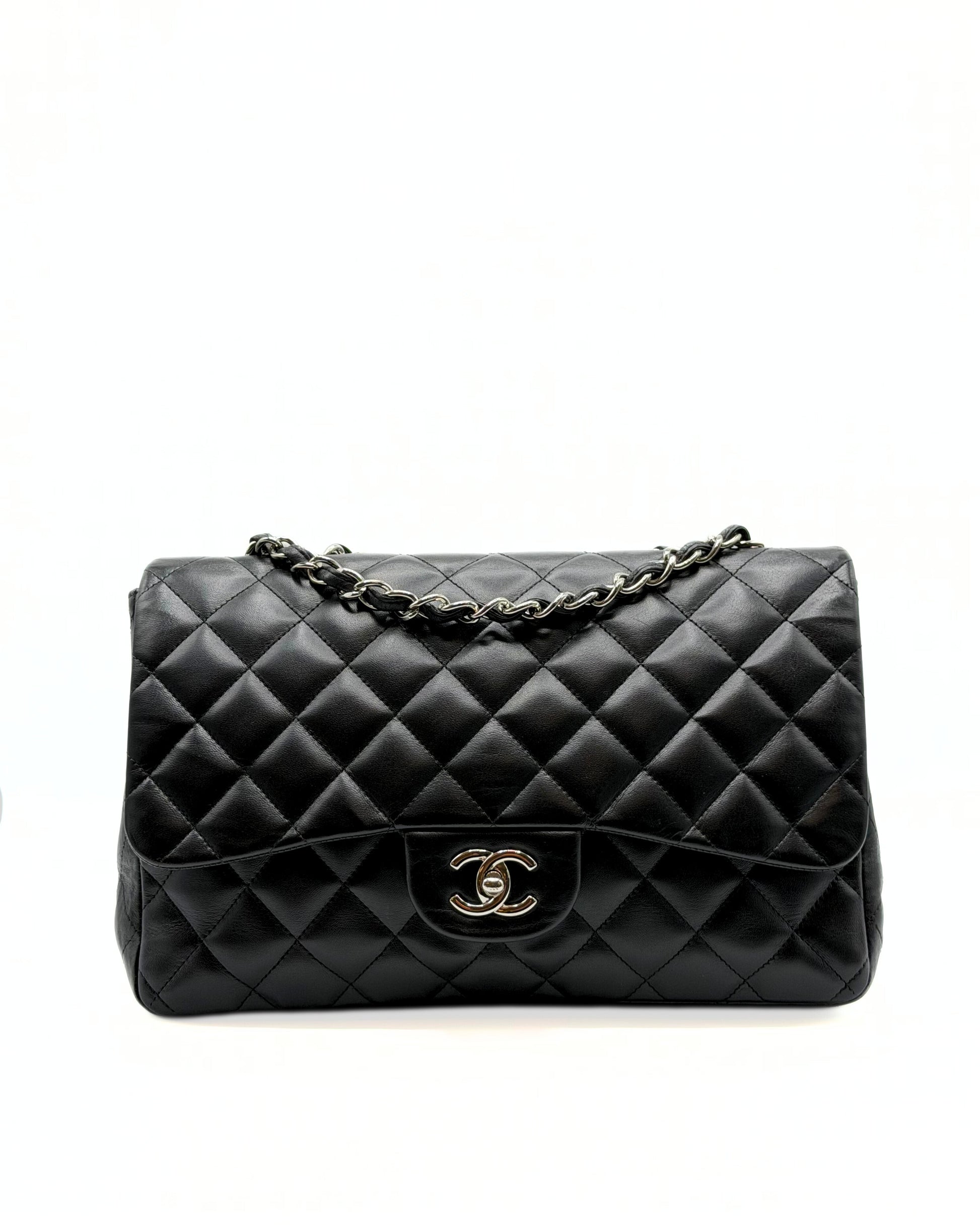 This Chanel Jumbo Single Flap is crafted of diamond quilted lambskin leather in black. This shoulder bag features leather threaded silver chain link shoulder straps and a matching Chanel CC turn lock for the front half flap. This opens to a bordeaux leather interior with zipper and patch pockets.