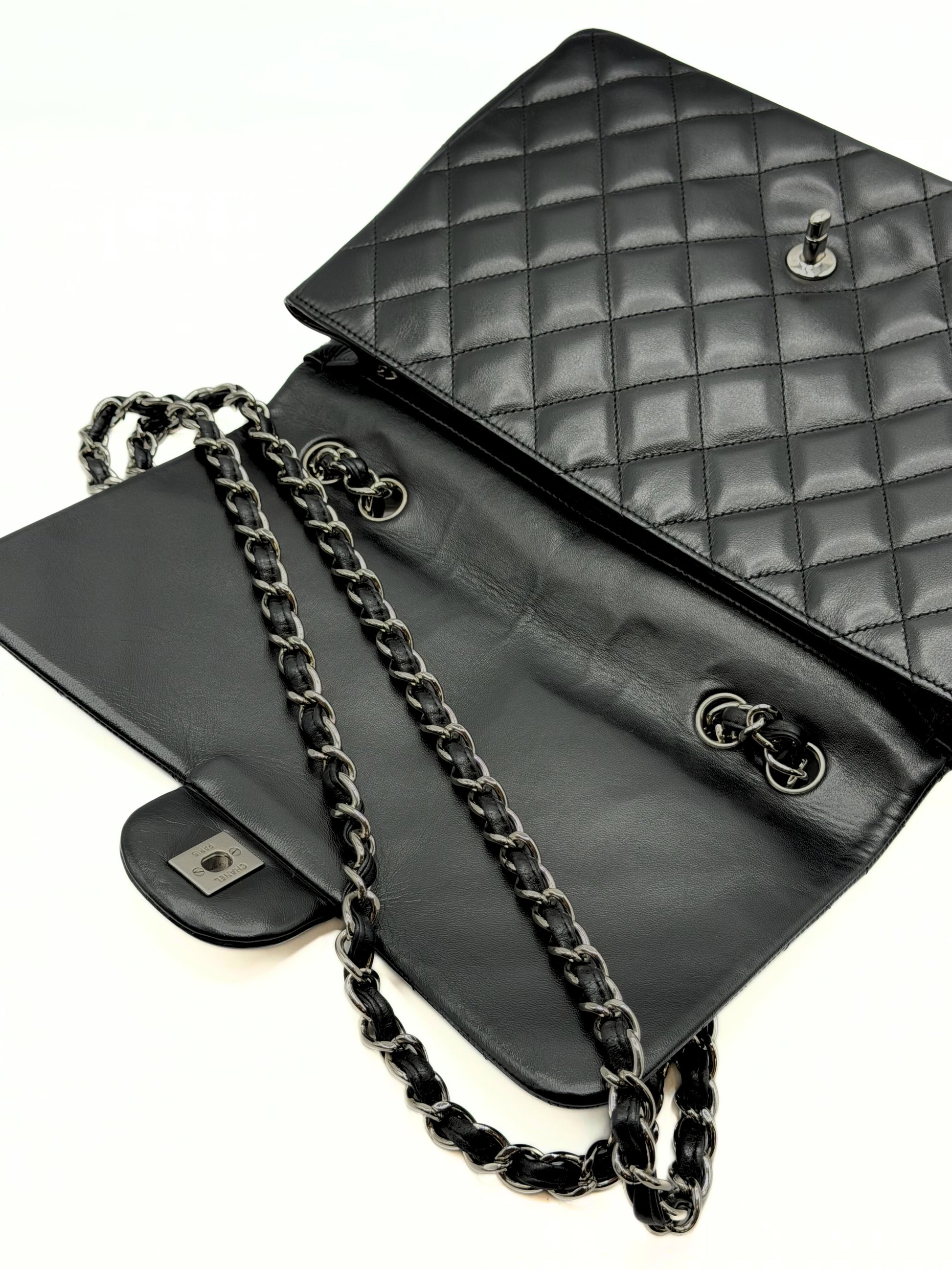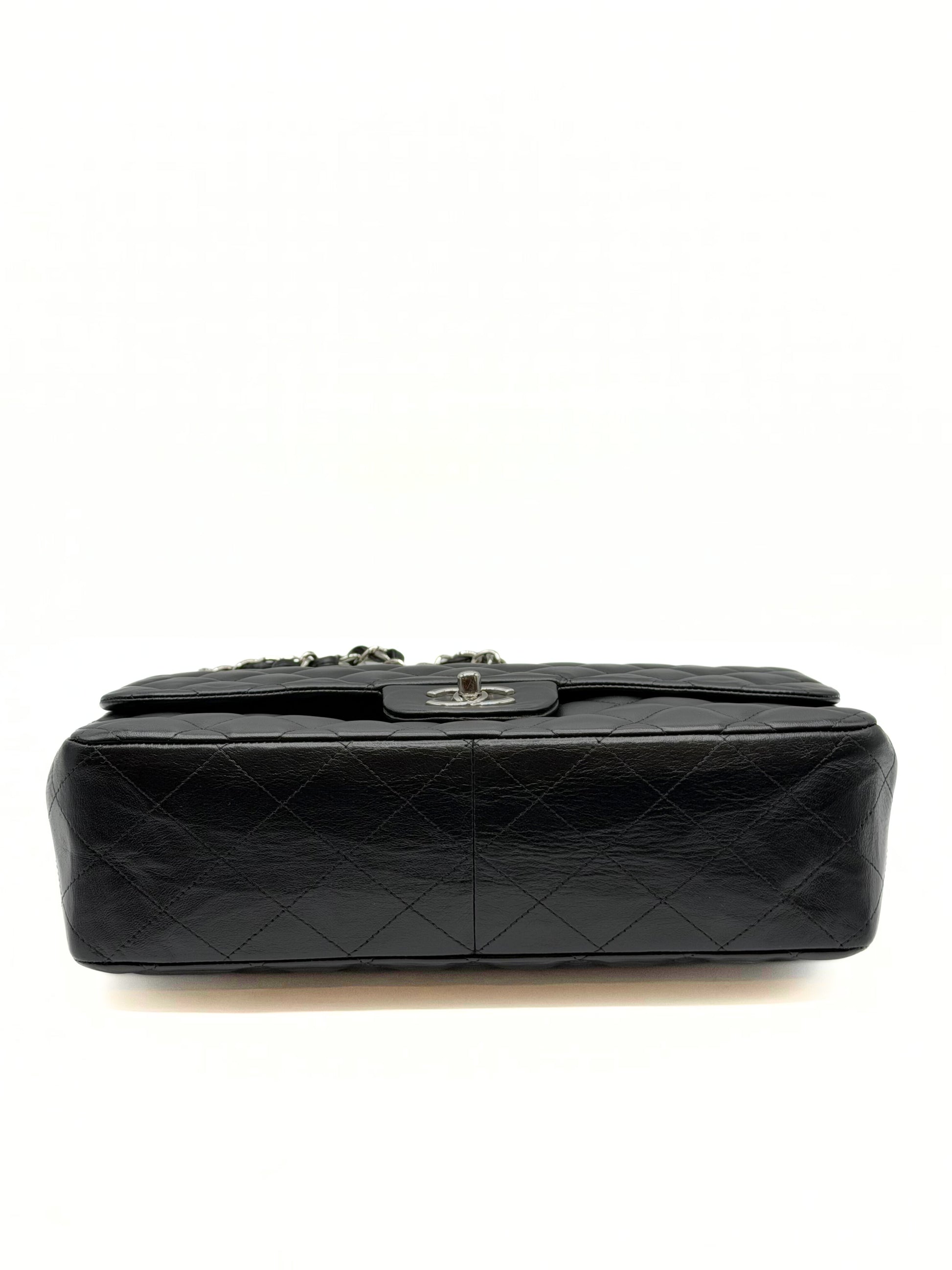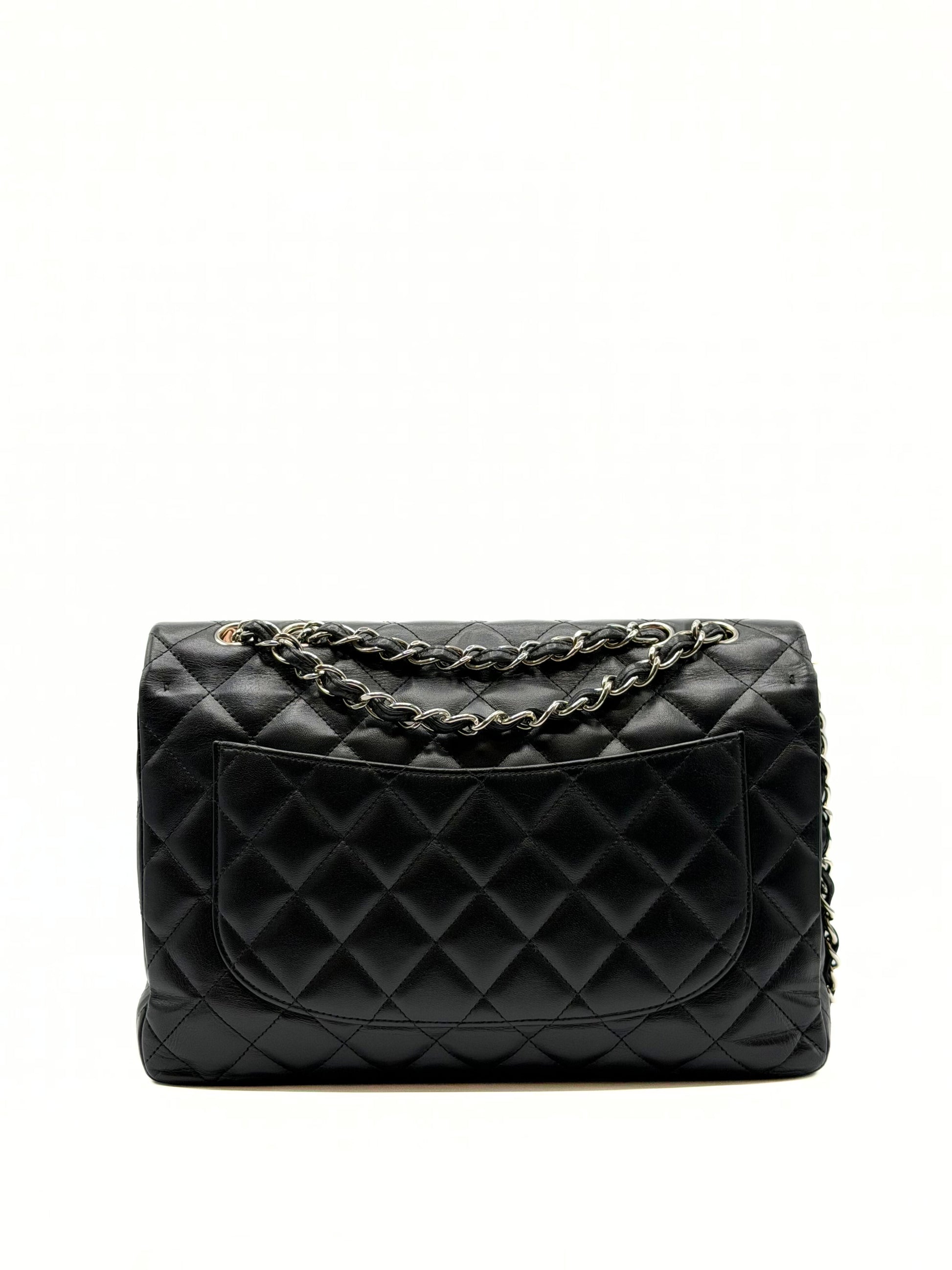This Chanel Jumbo Single Flap is crafted of diamond quilted lambskin leather in black. This shoulder bag features leather threaded silver chain link shoulder straps and a matching Chanel CC turn lock for the front half flap. This opens to a bordeaux leather interior with zipper and patch pockets.