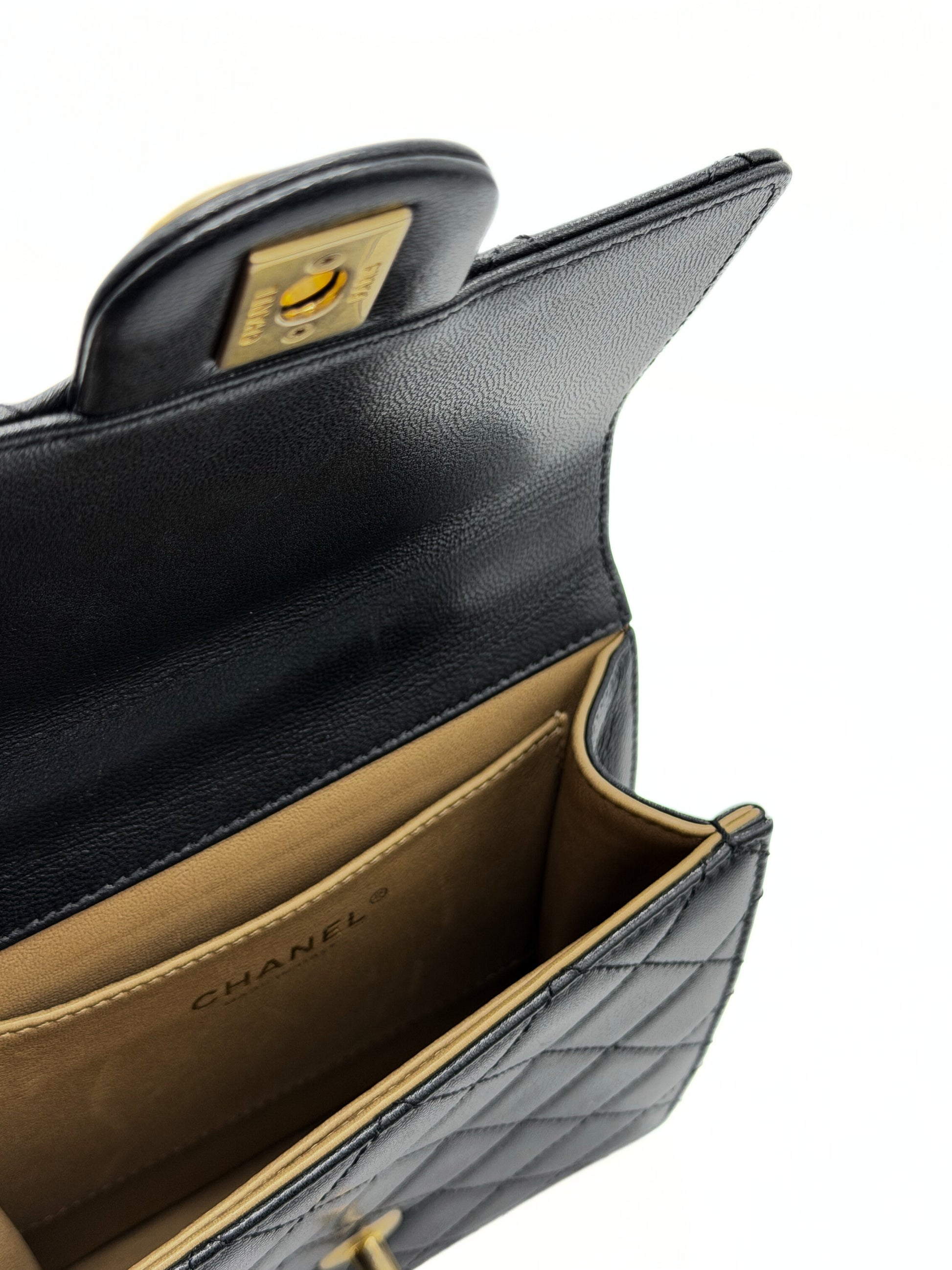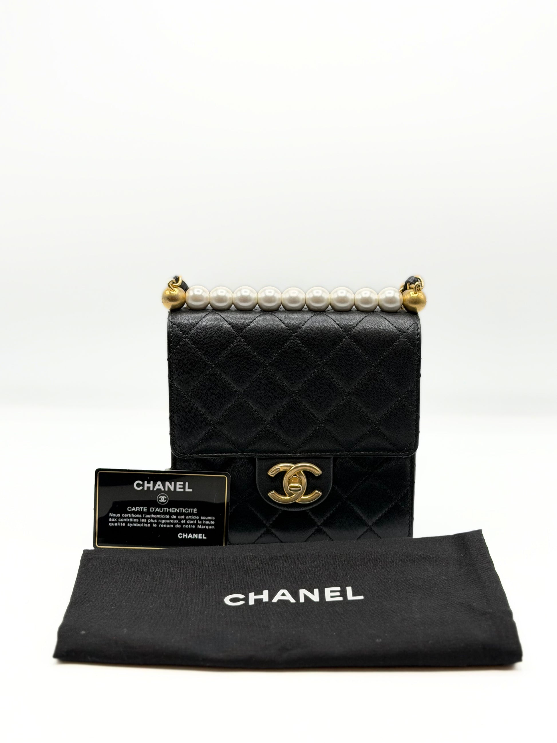 Chanel Chic Pearls Mini Flap Bag is a distinctive piece known for its blend of classic house codes and whimsical embellishments. Crafted from black lambskin leather featuring the signature diamond-quilted pattern and a structured, rectangular silhouette. The most prominent feature is a row of large faux pearls that frame the top of the bag. These pearls were a standout detail from the collection and were famously featured on the show Emily in Paris. It is adorned with matte gold-tone hardware, including the iconic CC turnlock closure on the front flap. Features a classic woven leather-and-chain strap, allowing it to be worn as a shoulder bag or crossbody. This model was first introduced in the Spring/Summer 2019 "Chanel By The Sea" collection and later appeared in the Cruise 2020 collection.