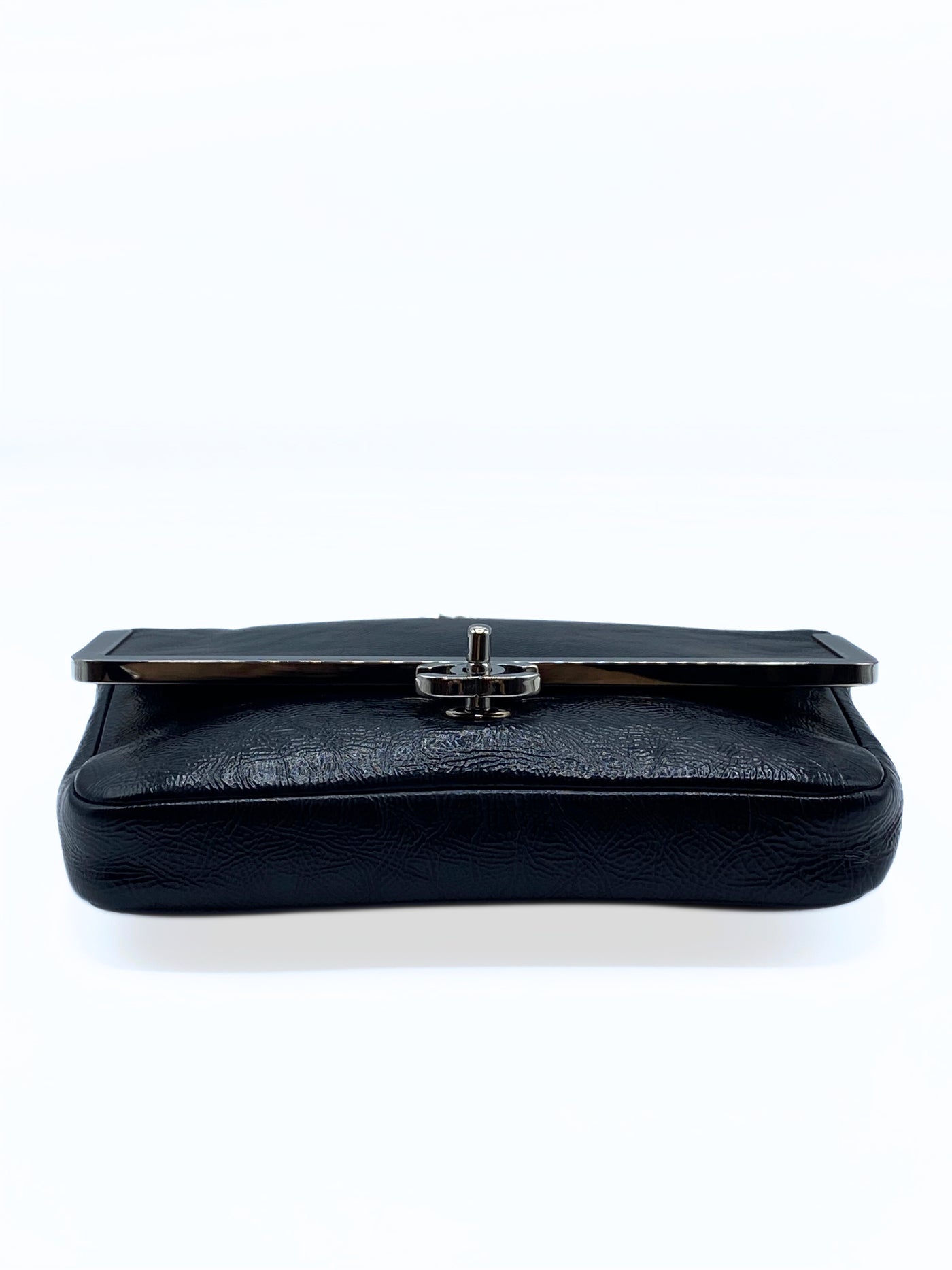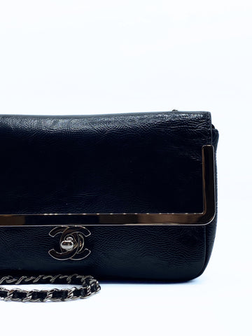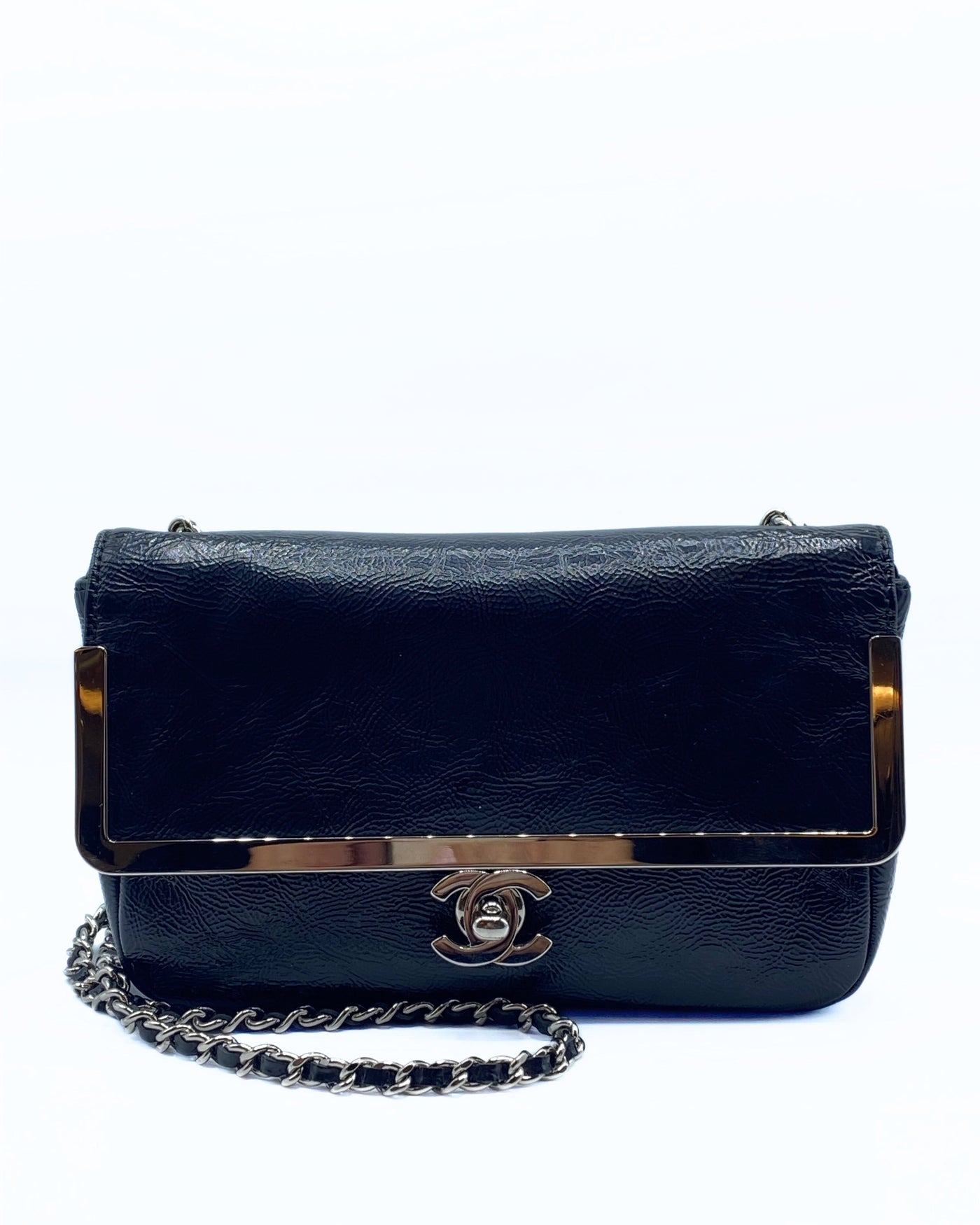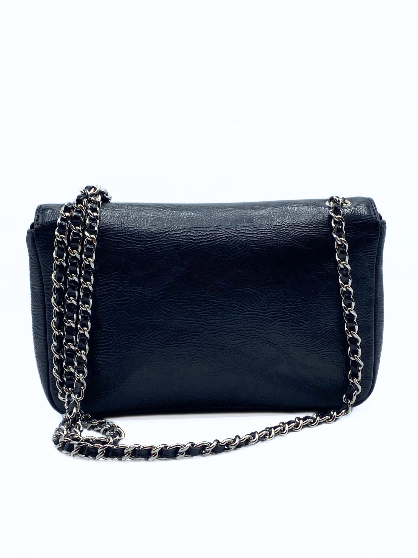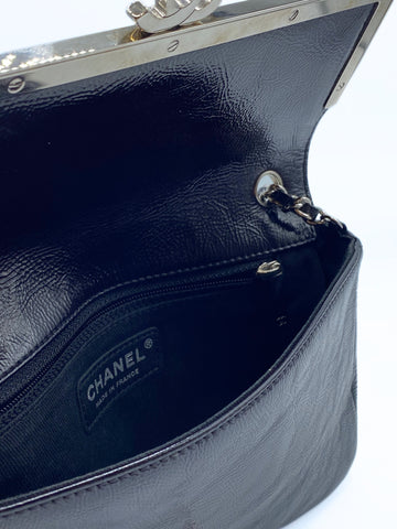 This rare Chanel single flap is crafted of distressed pattent leather in black. It have a silver tag around the flap and matching silver hardware.