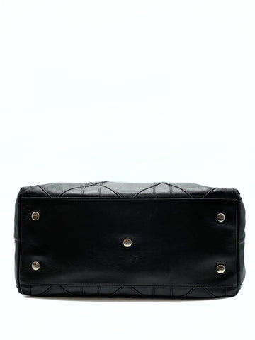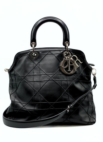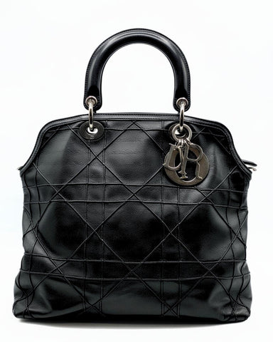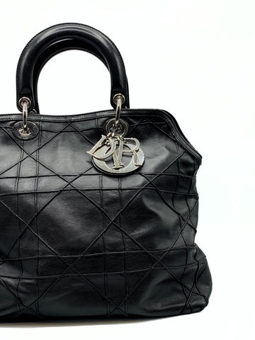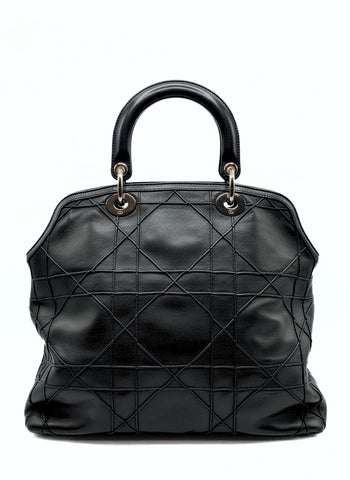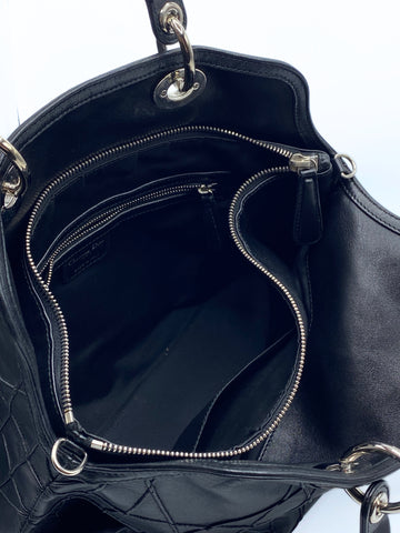 This Dior Granville Medium Shopper bag is crafted of soft geometric quilted padded lambskin leather in black. The bag features leather top handles, leather shoulder strap, and silver hardware. The open top leads to a black interior with a zipper compartment lined with zipper and pockets.