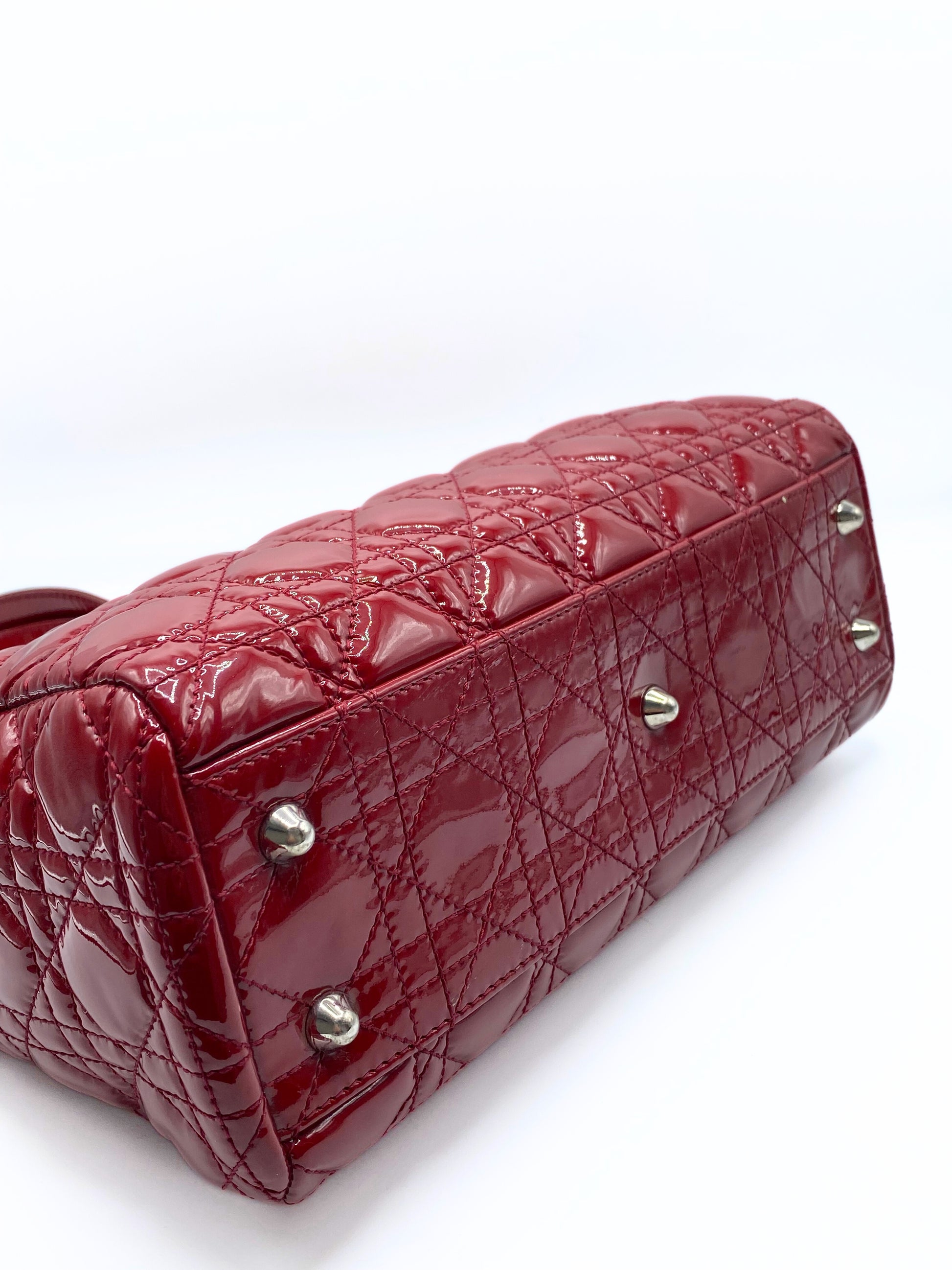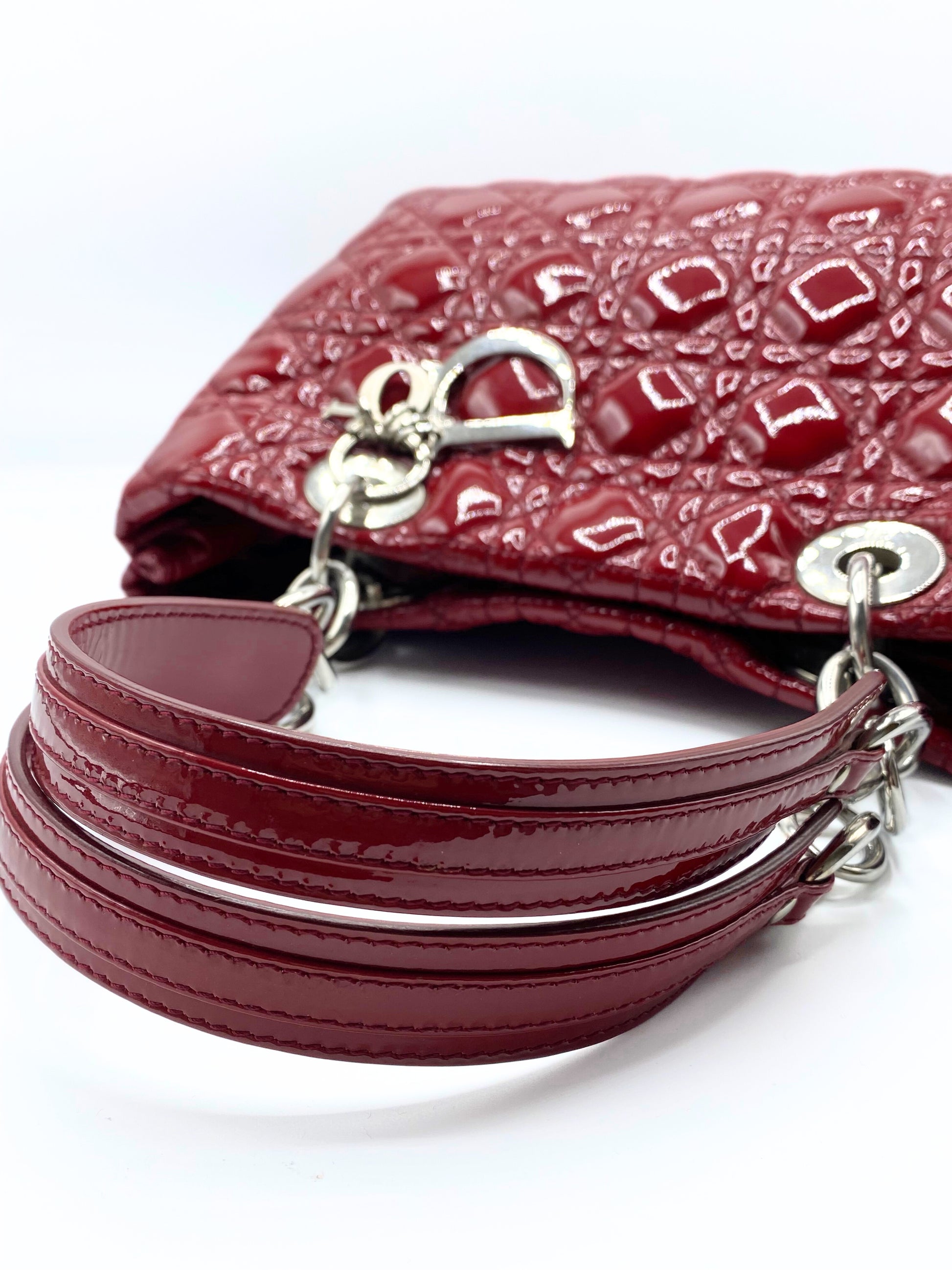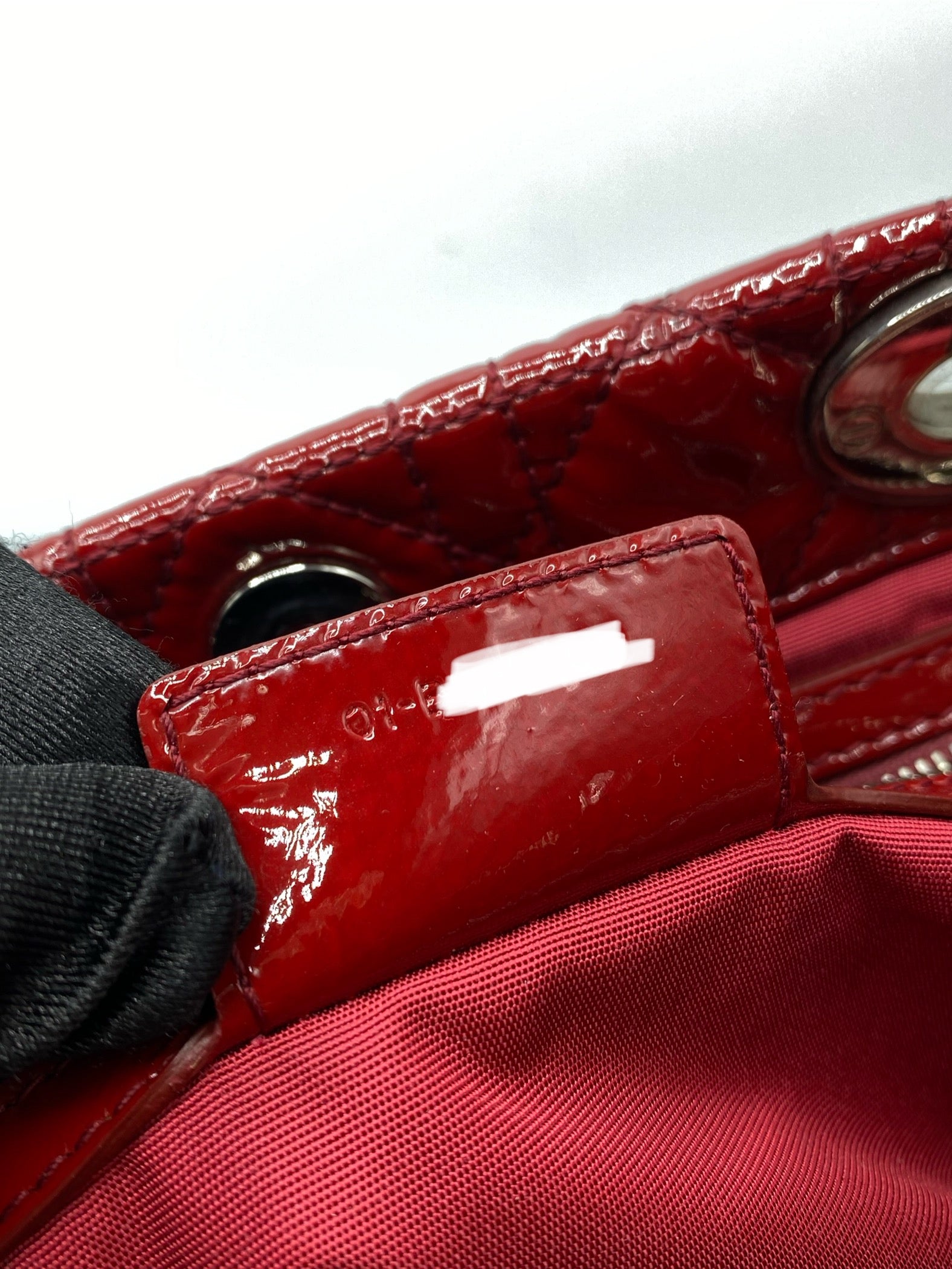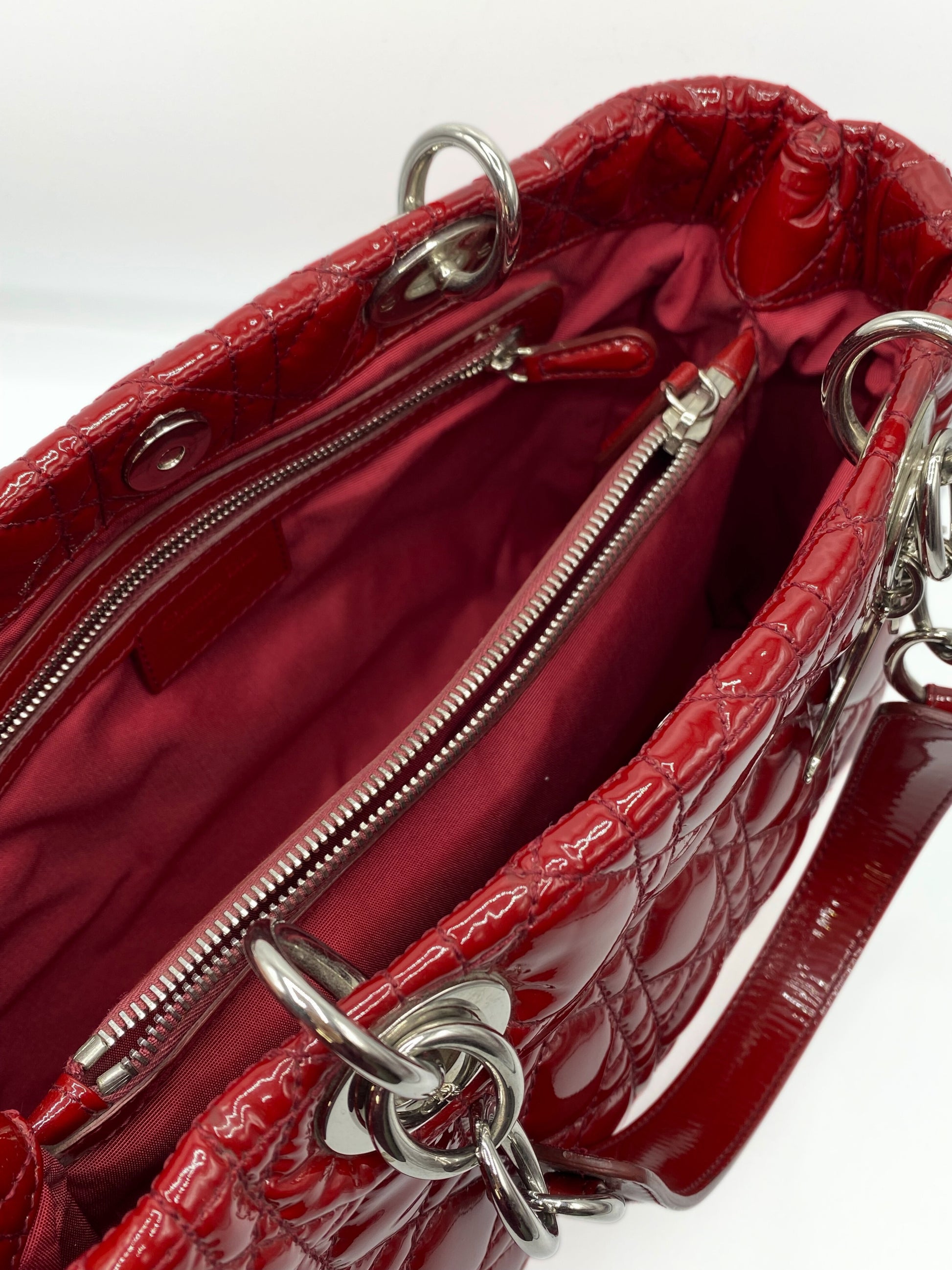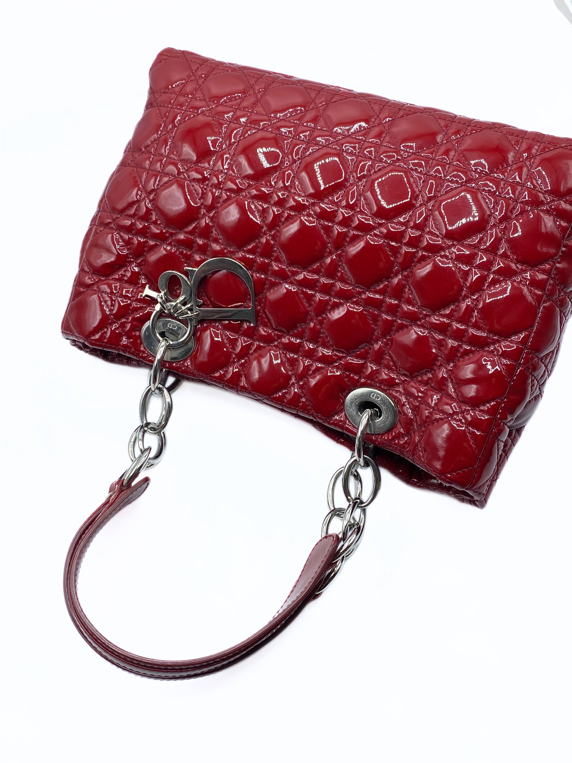 This Dior Small Lady Dior Soft Tote is crafted of polished geometric quilted patent leather in red. The bag features a silver chain link shoulder strap with a leather shoulder pad and a silver Dior charm. The top is open to a partitioned fabric interior with a zippered pocket.
