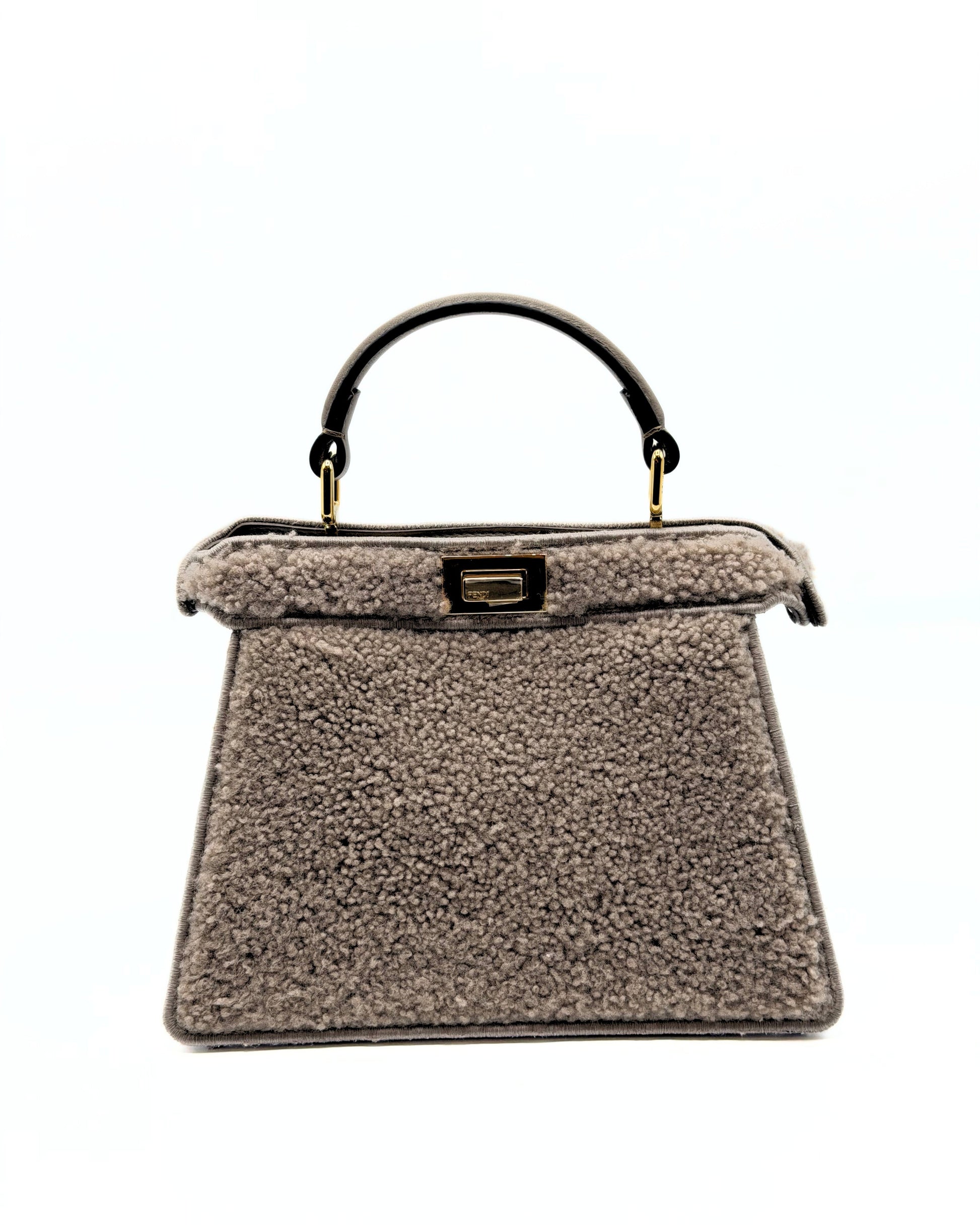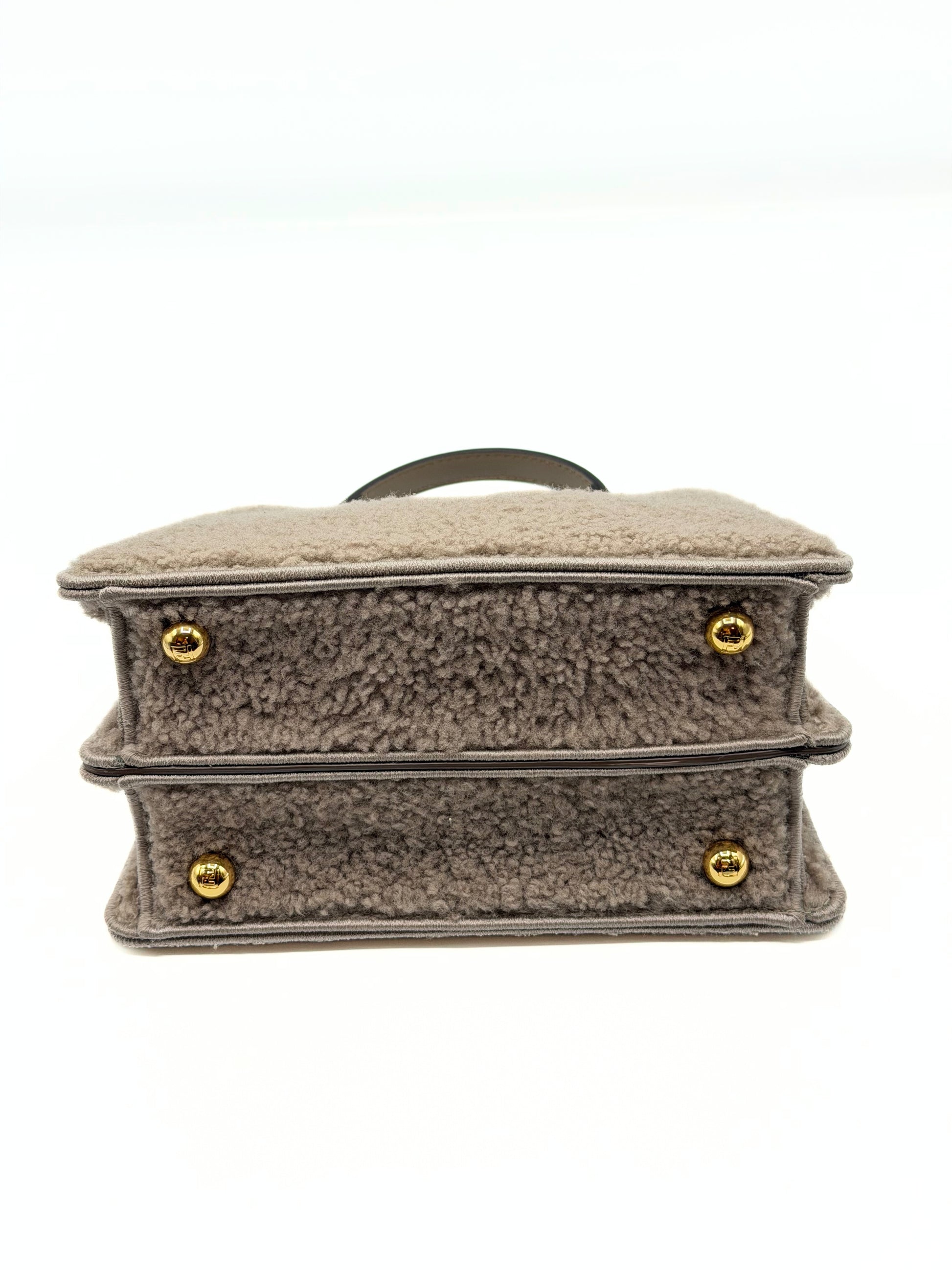 This Fendi Mini Peekaboo is crafted of grey shearling. The bag features a shearling top handle, optional shoulder strap and polished gold hardware.