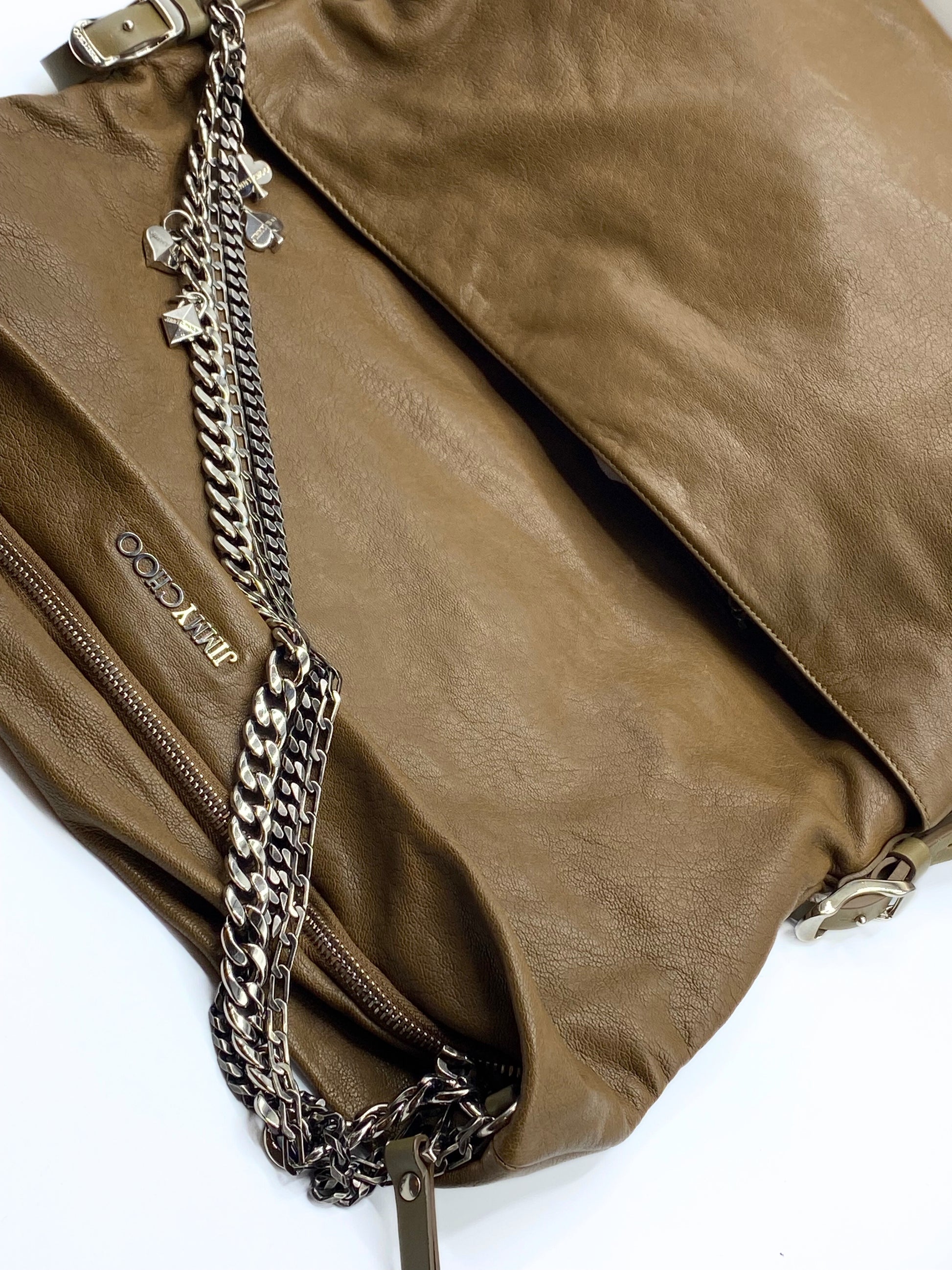 This Jimmy Choo Shopper Vintage, is an amazing bag for everyday. It have two different scompartment, one hide, to keep all the important things. The bag have a leather strap, accessoried with chains and charms, in silver.
