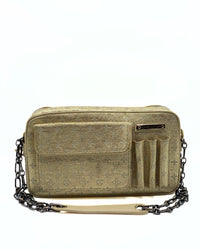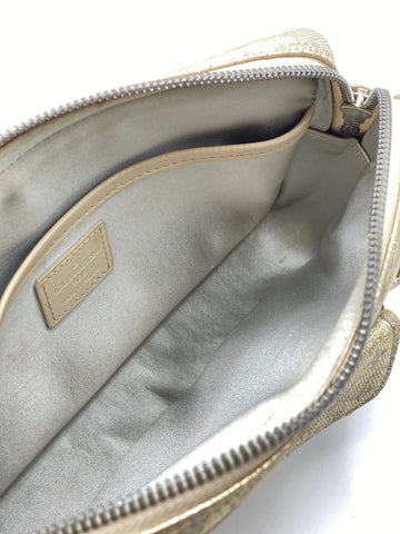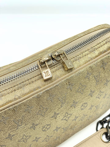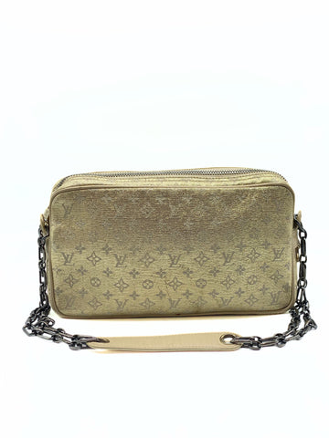This Louis Vuitton Mini Lin Shine McKenna is crafted of silk and linen Louis Vuitton monogram fabric in gold with a stunning sheen and beige leather trim. The bag features a silver chain strap with a leather shoulder pad, front pockets, and gold hardware.