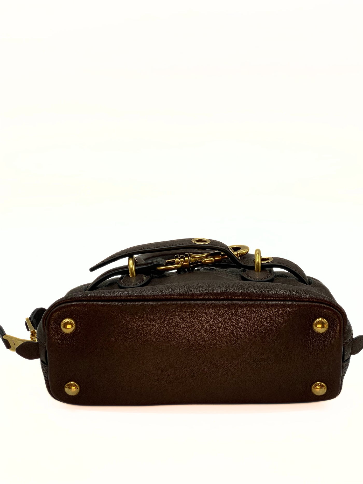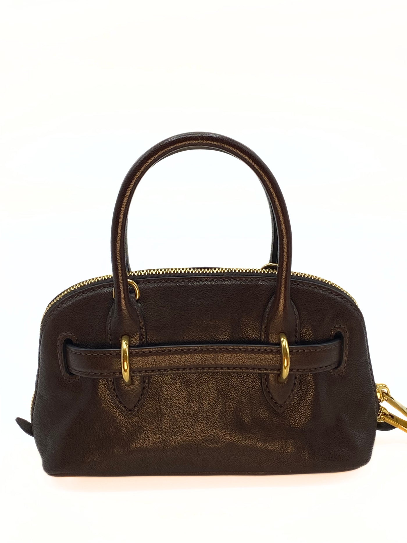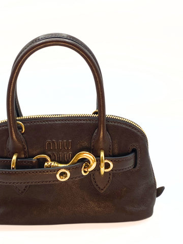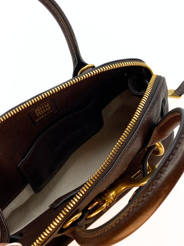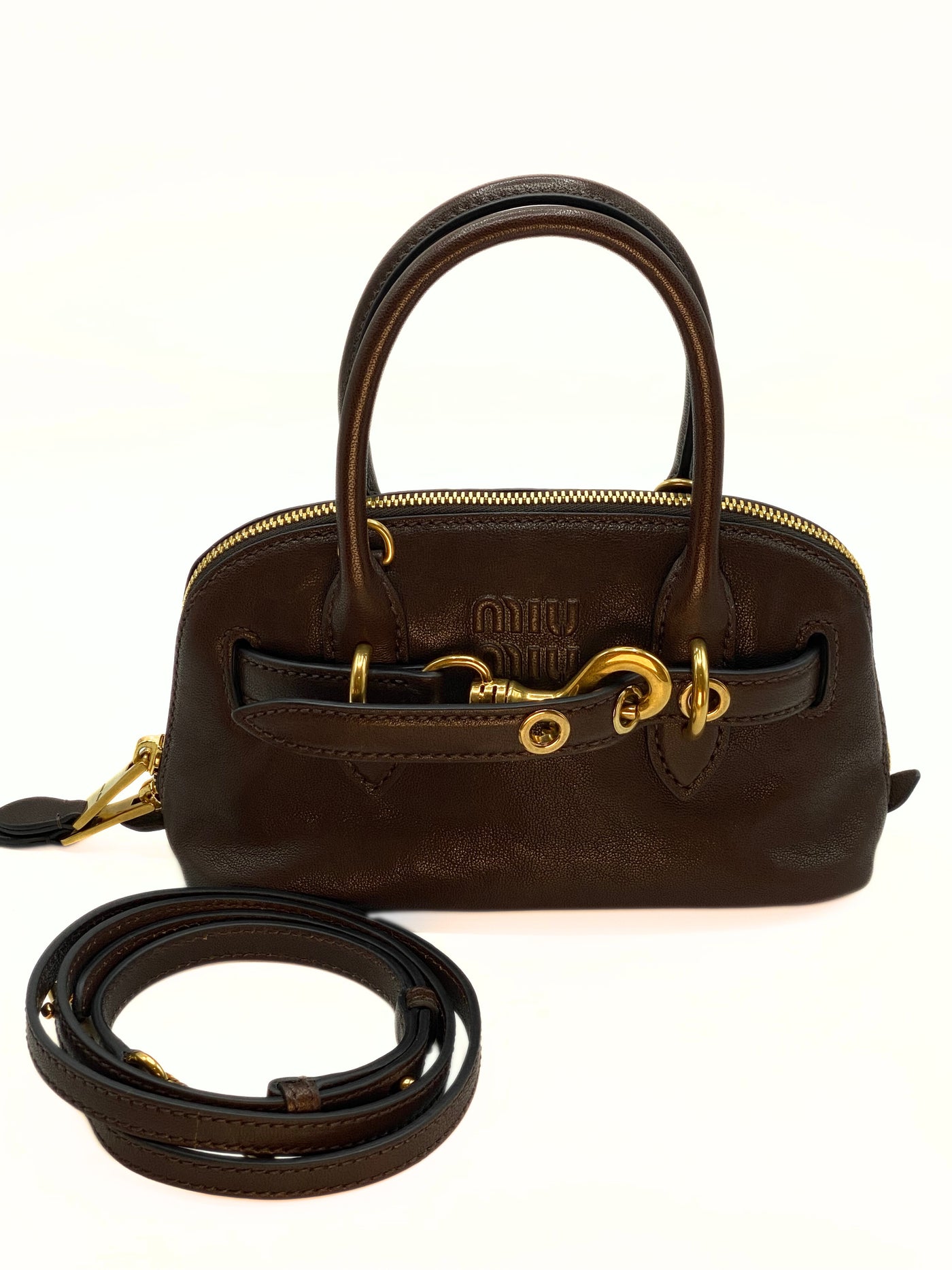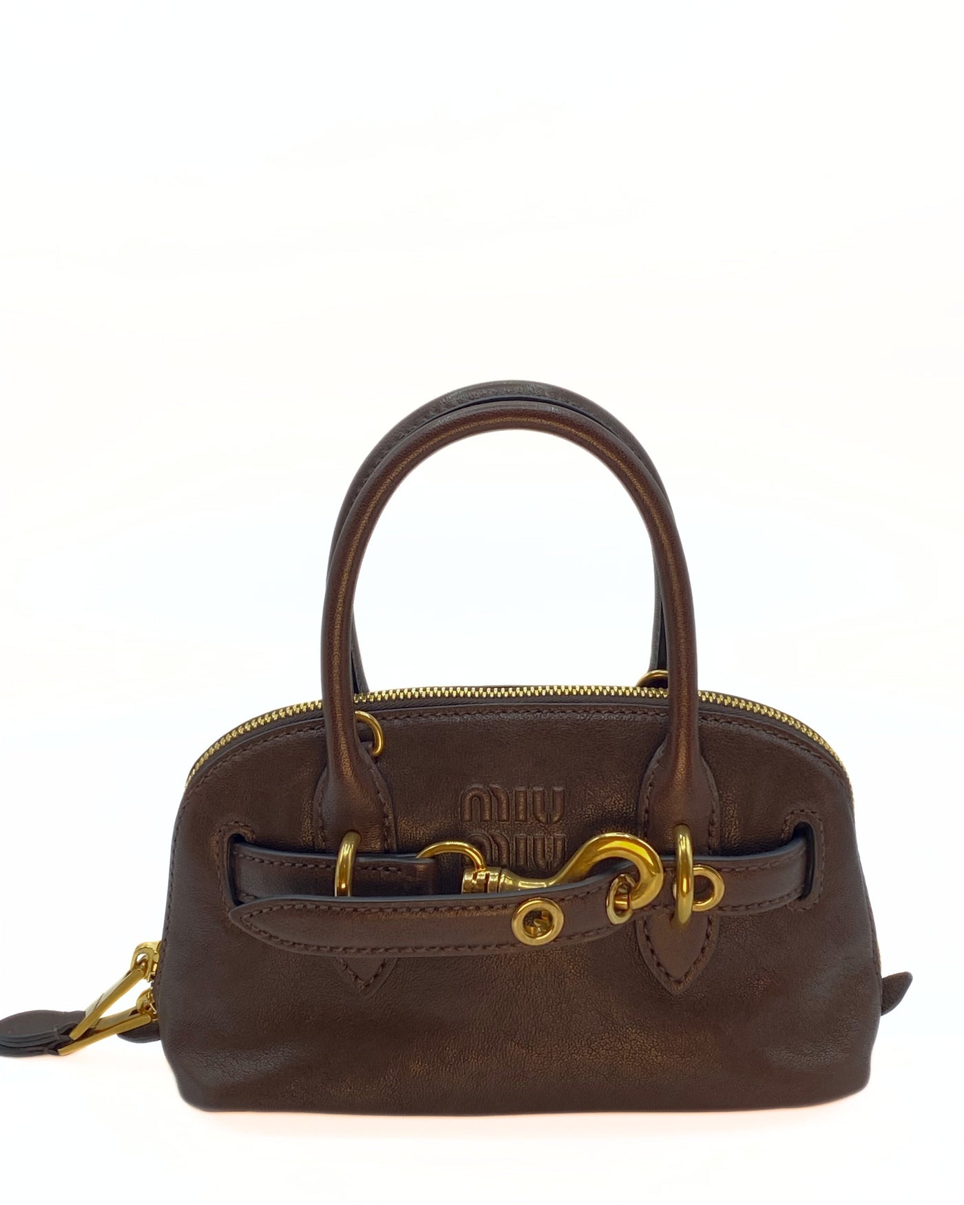 The Aventure top-handle bag, recovered from the Miu Miu archives, has been reinterpreted in terms of a lighter structure and attitude, creating a classic style with timeless charm. The embossed lettering logo completes the design with an iconic note.