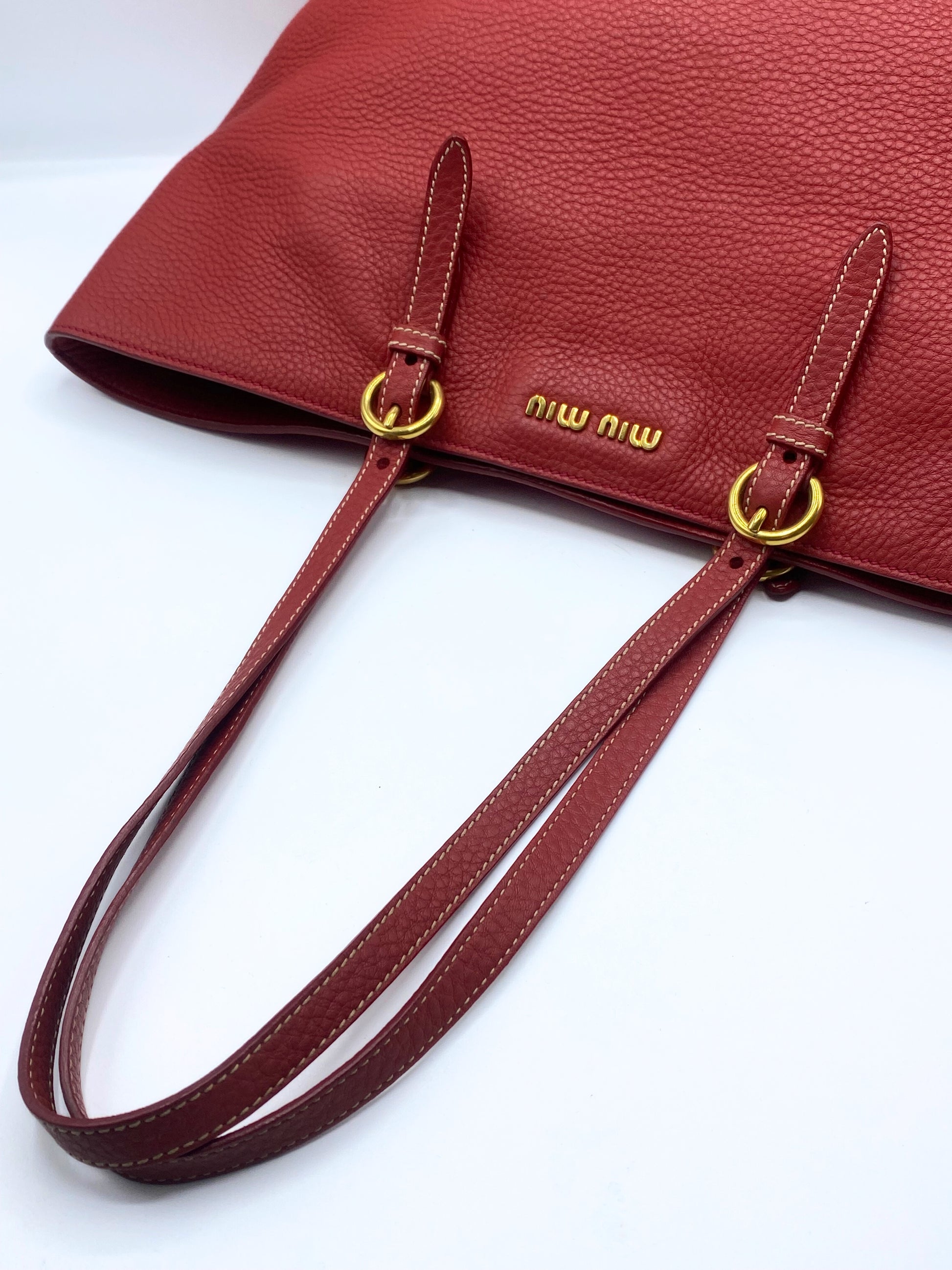 Miu Miu vintage shopper in textured red leather with gold-tone hardware. It features two adjustable top handles, a detachable shoulder strap, and the Miu Miu logo embossed in gold on the front. The design is spacious, making it suitable for everyday use, and the pebbled leather gives it a durable yet elegant look.