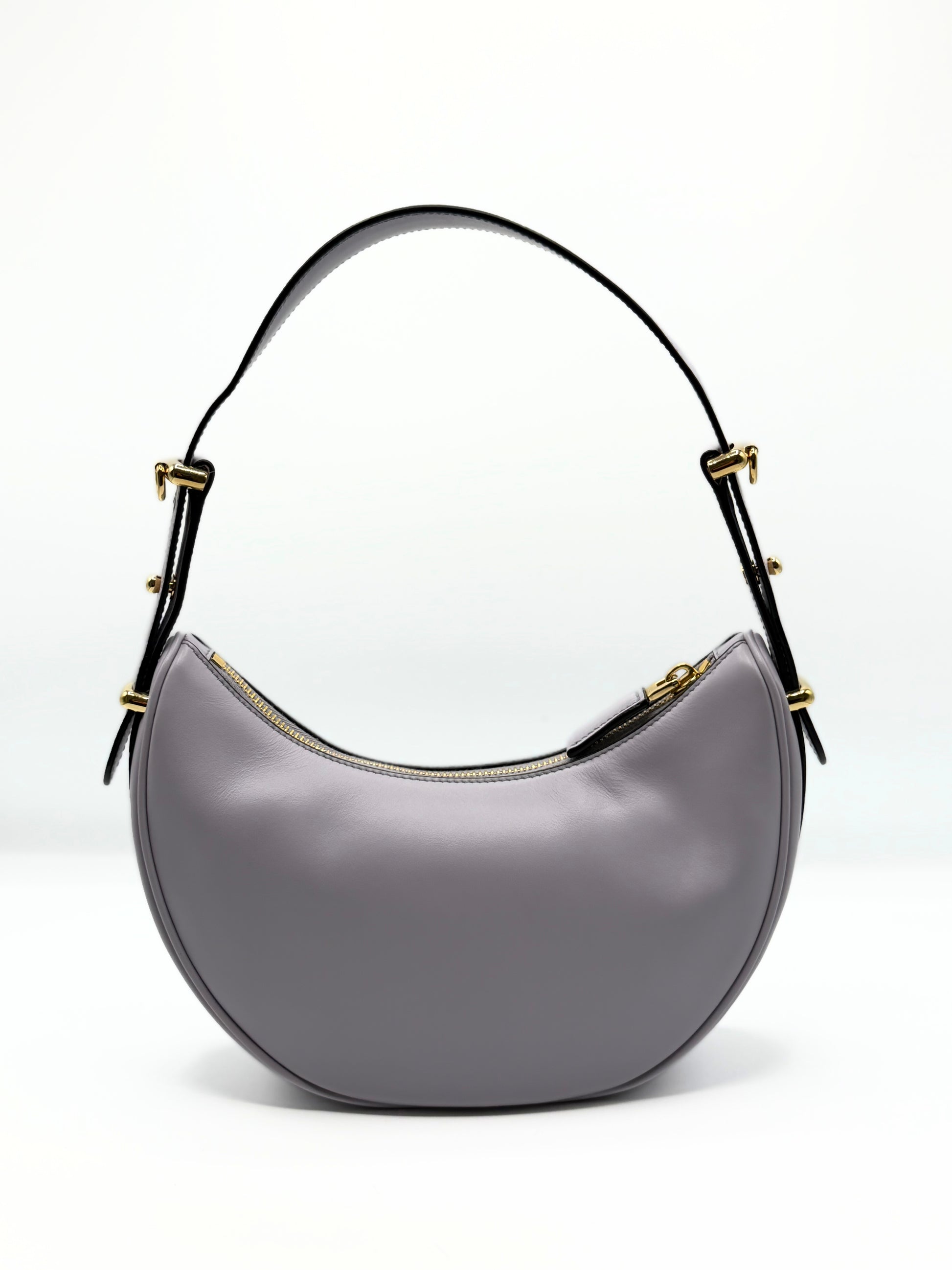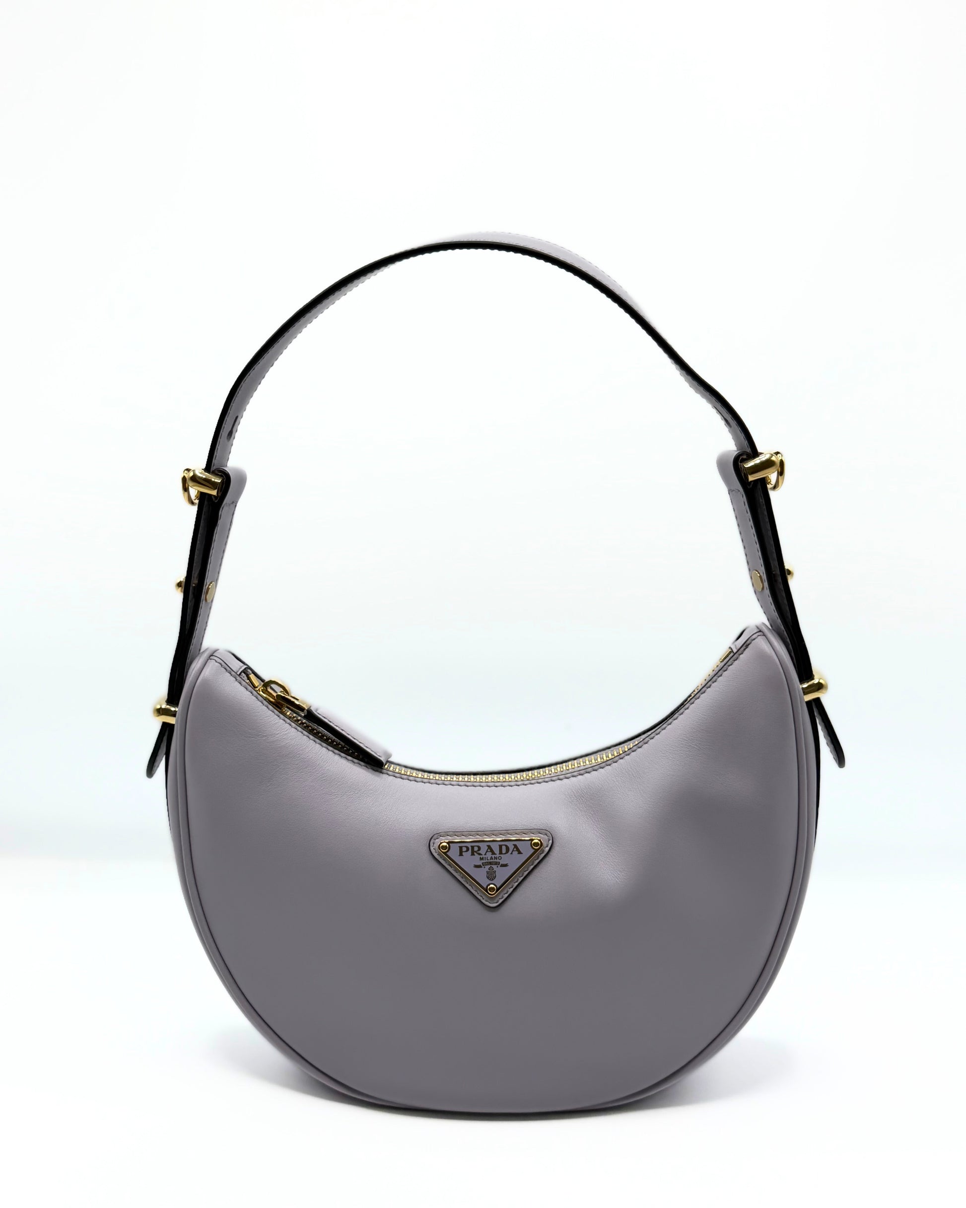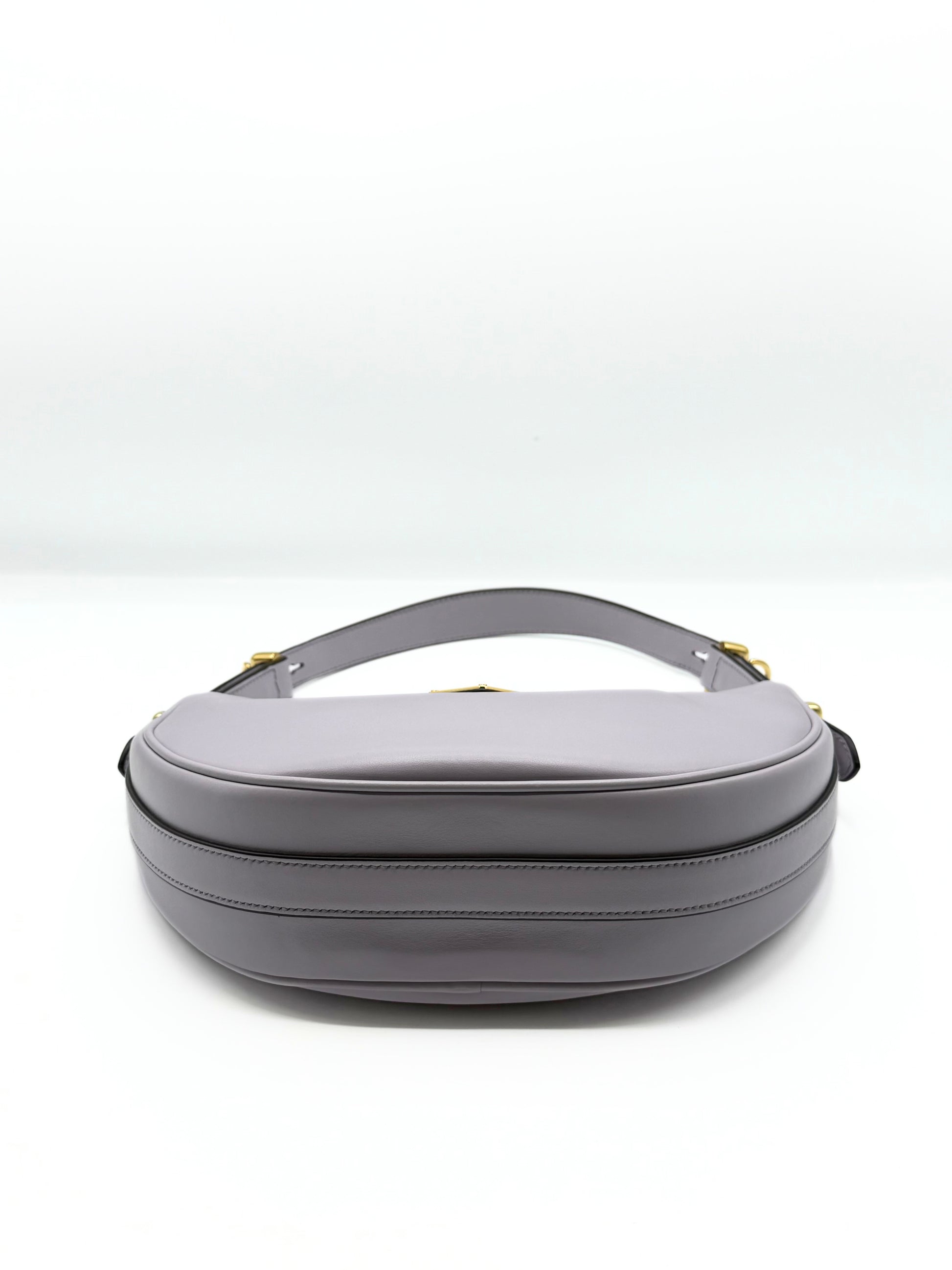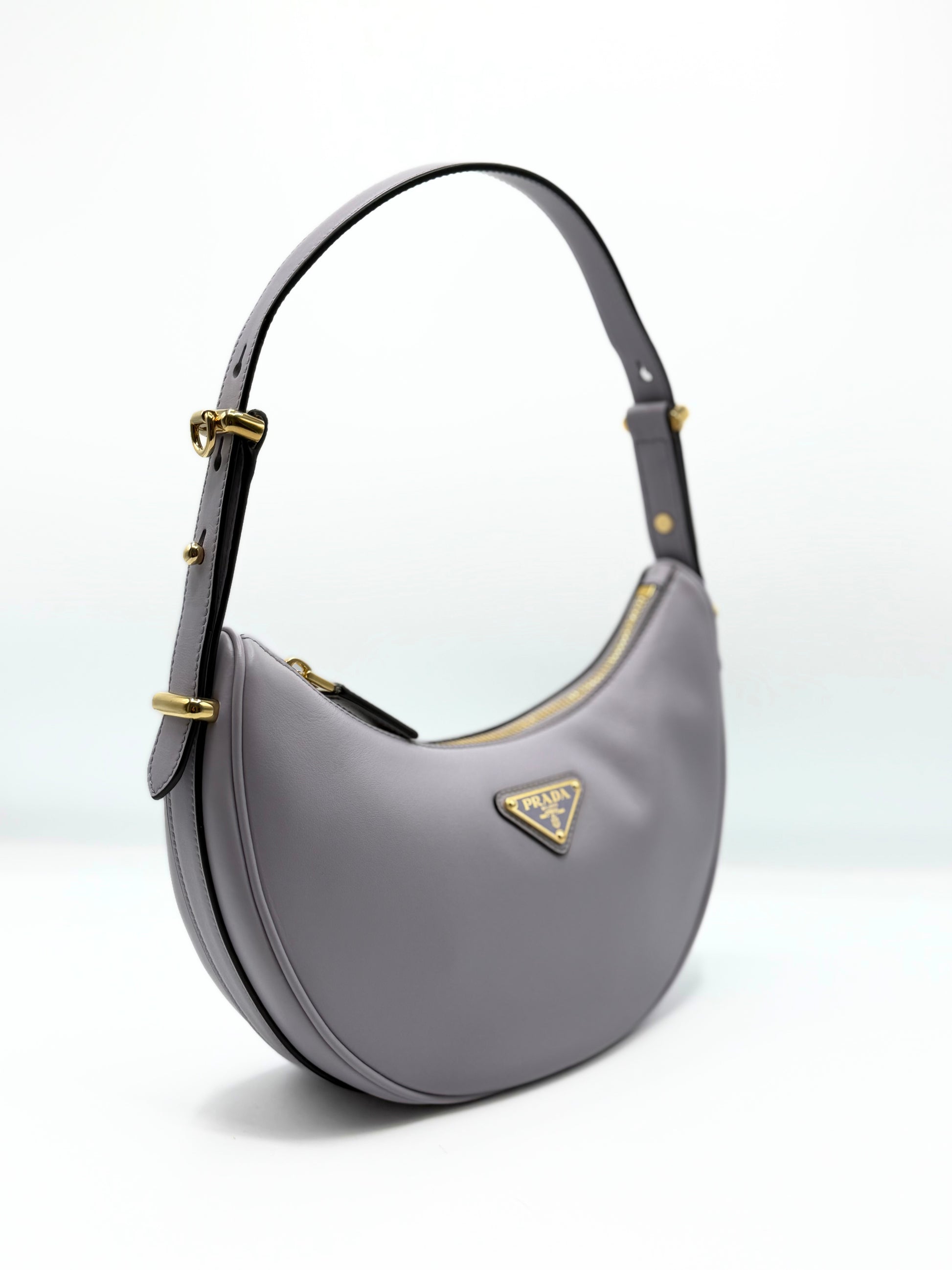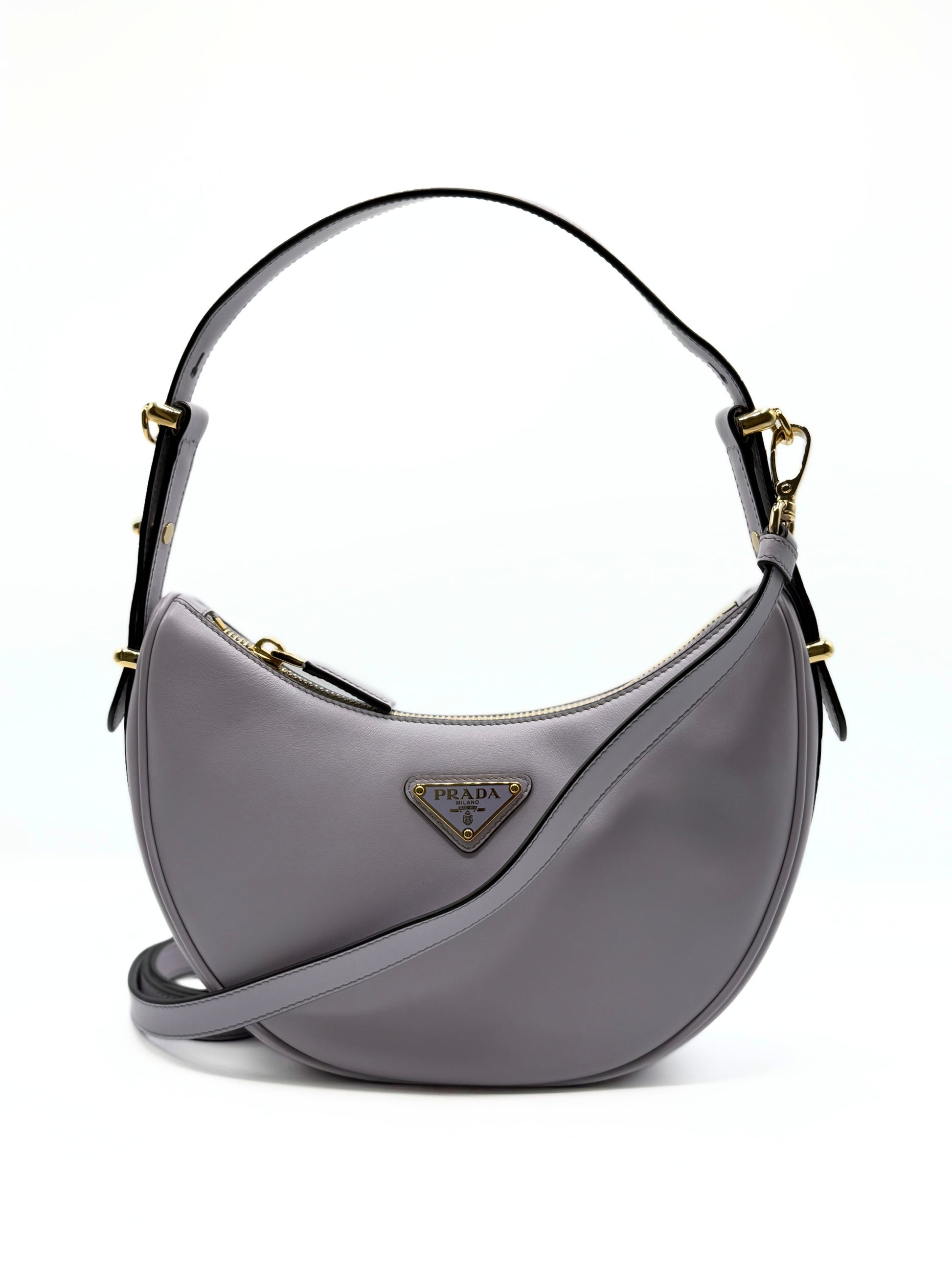 This Prada Arque Shoulder bag is crafted of smooth lilla leather. With her iconic halfmoon shape, is one of the most request bag of the maison. The bag come with a longer strap to carry the bag as a crossbody bag.