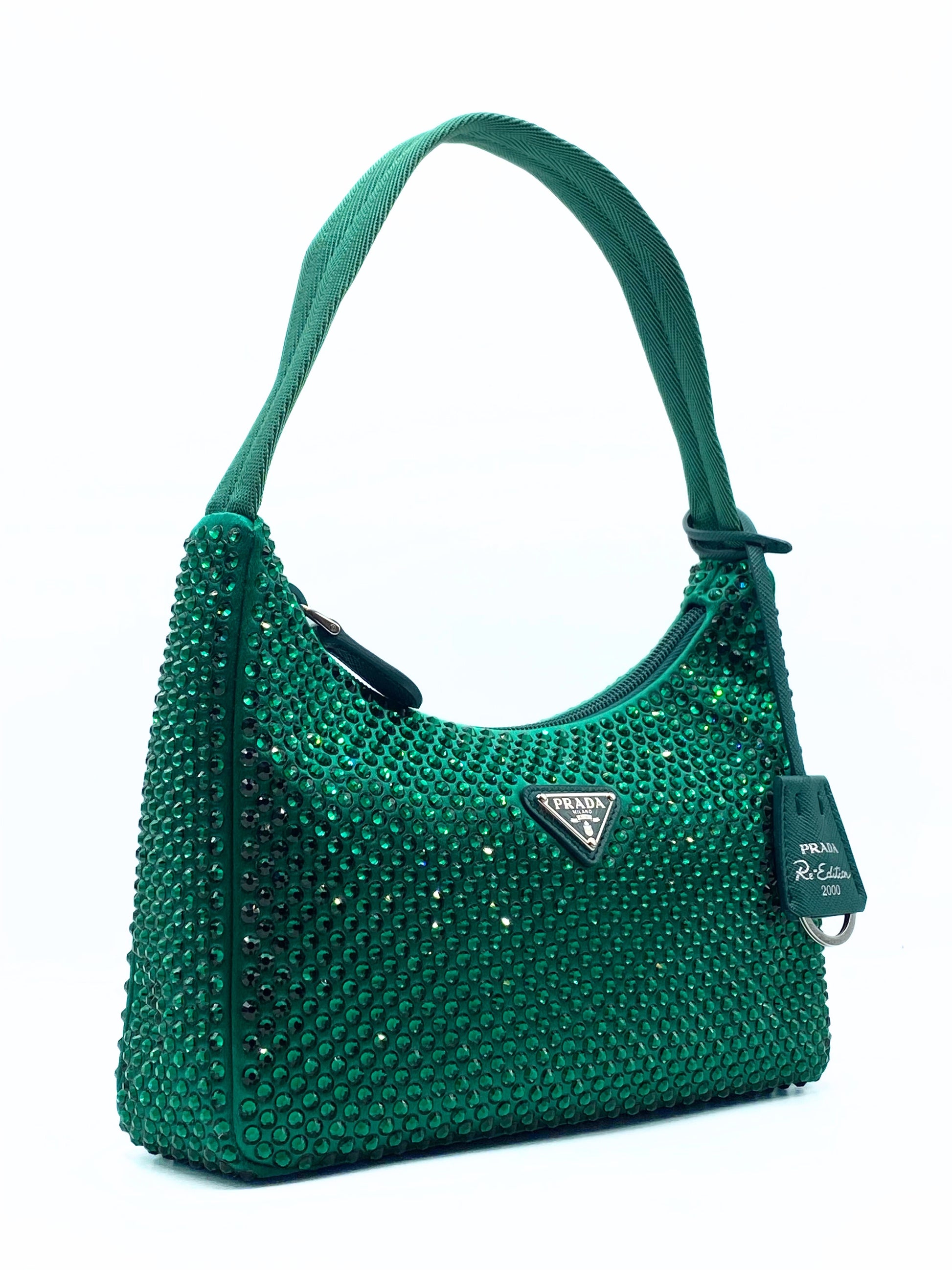 This Prada Re-Edition 2000 Bag is crafted of crystal embellished satin in green. The bag features a nylon shoulder strap and the top zipper opens to a matching satin interior.
