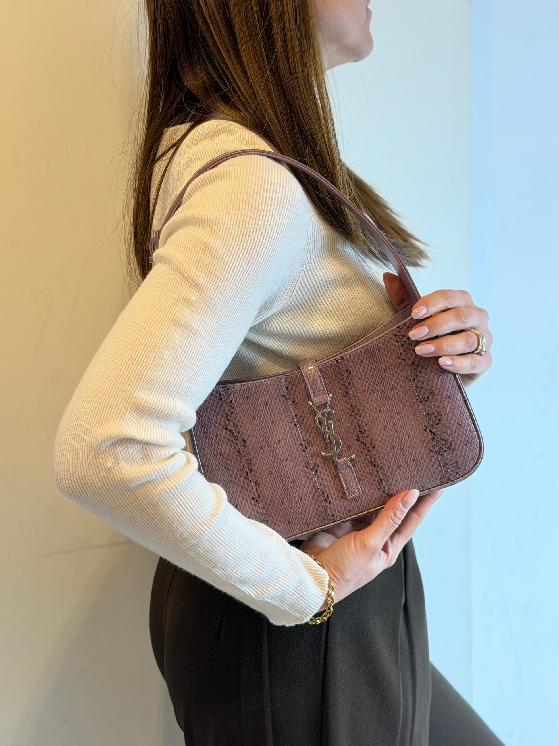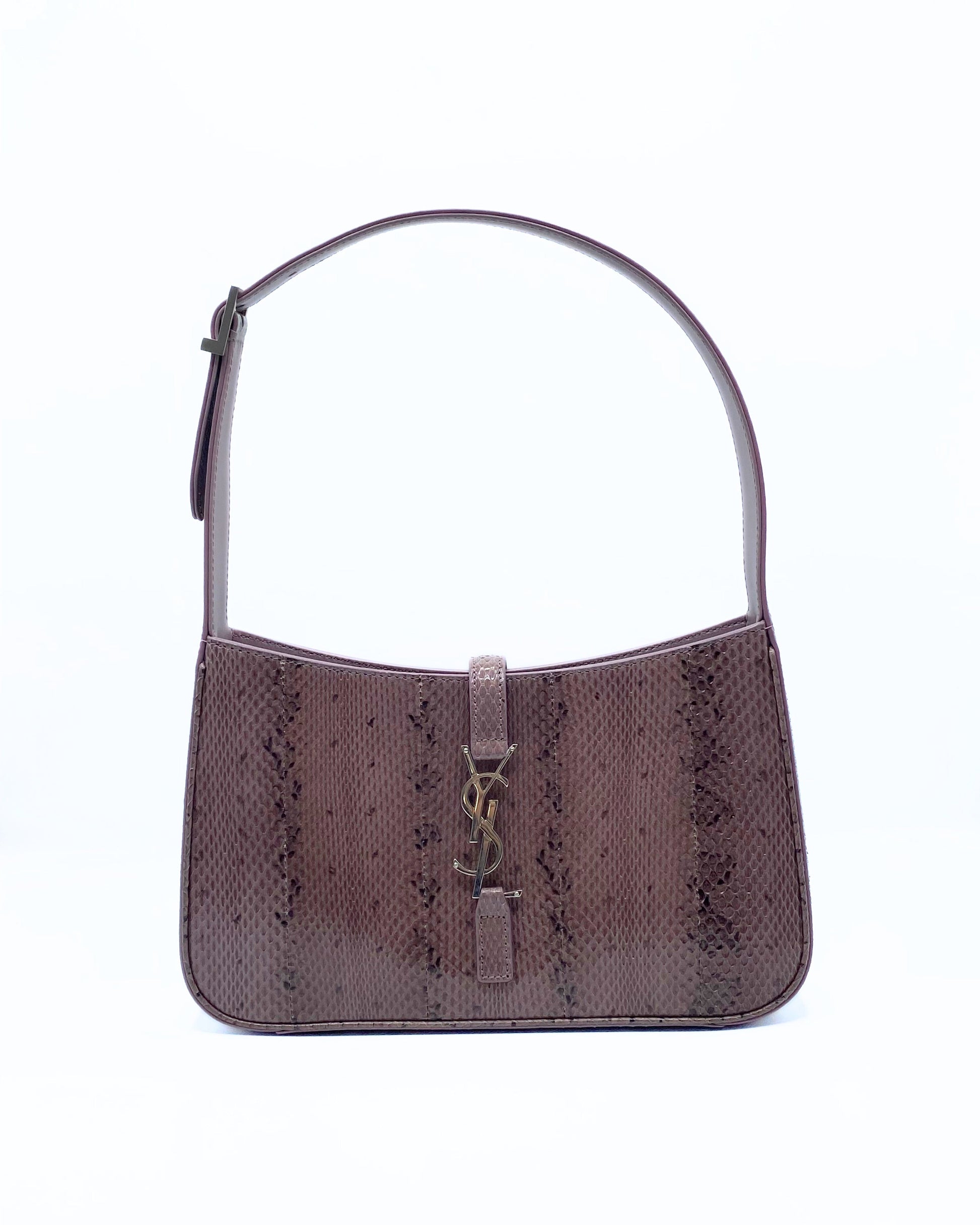 This Saint Laurent Le 5 a 7 bag features a structured, rectangular silhouette with a short shoulder strap, making it ideal for carrying under the arm. The front is adorned with the iconic YSL closure in metal. The exterior of the bag is made of lizard leather in a mauve-brown tone, giving it a luxurious and sophisticated look.